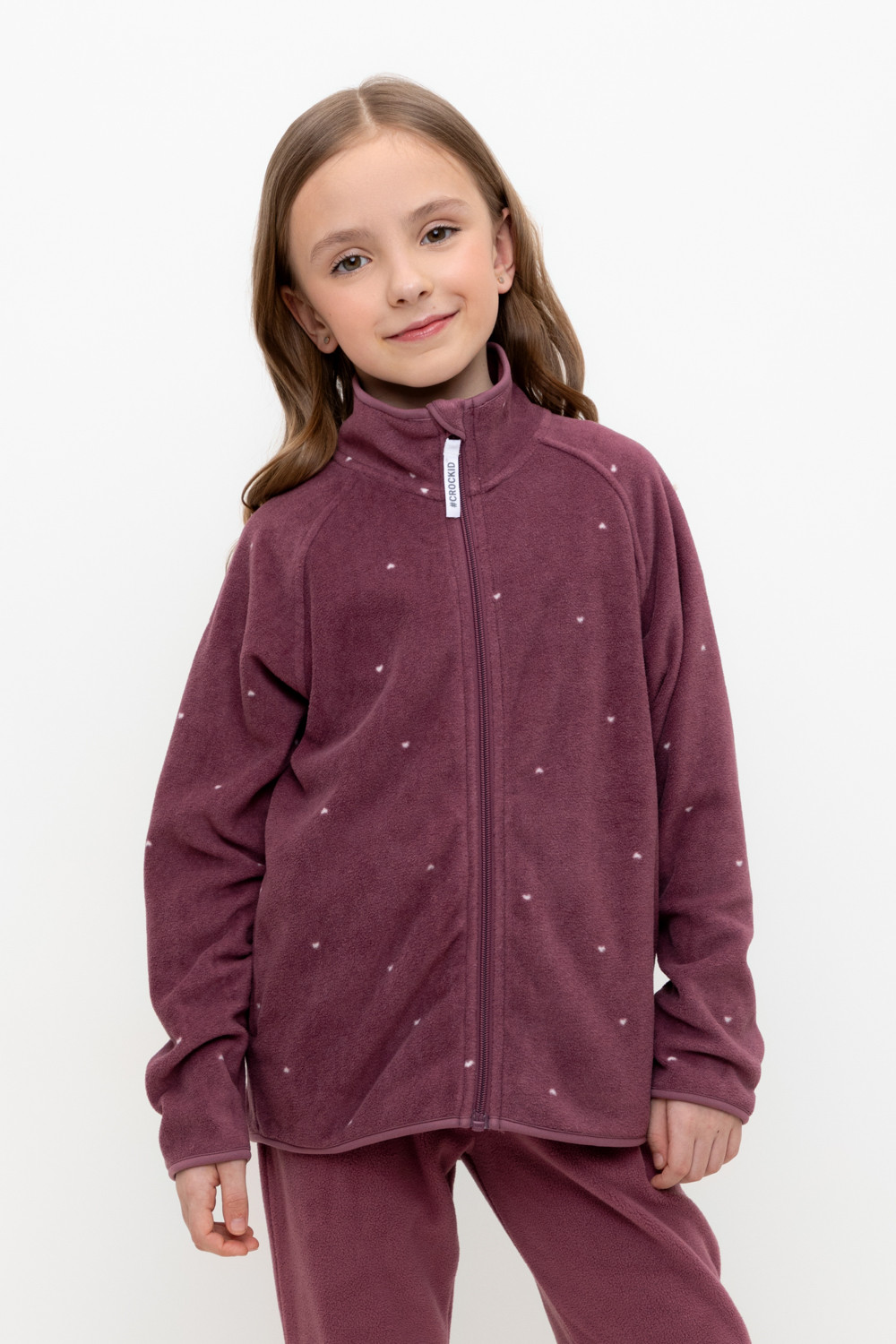 Флисовая куртка для девочки. У изделия удлинённая спинка, высокий воротник, предусмотрена защита шеи и подбородка. Рукава-реглан и низ изделия обработаны эластичным кантом для лучшего прилегания к телу, по бокам два кармана. Оригинальная набивка выполнена из стойких, гипоаллергенных текстильных красителей. Куртка сохраняет цвет и форму после многократных стирок.