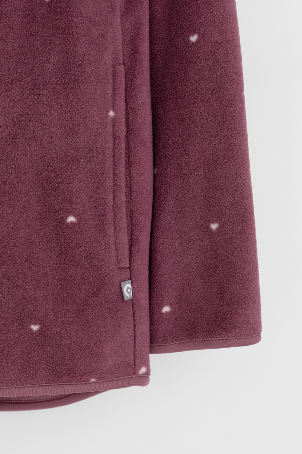 Флисовая куртка для девочки. У изделия удлинённая спинка, высокий воротник, предусмотрена защита шеи и подбородка. Рукава-реглан и низ изделия обработаны эластичным кантом для лучшего прилегания к телу, по бокам два кармана. Оригинальная набивка выполнена из стойких, гипоаллергенных текстильных красителей. Куртка сохраняет цвет и форму после многократных стирок.