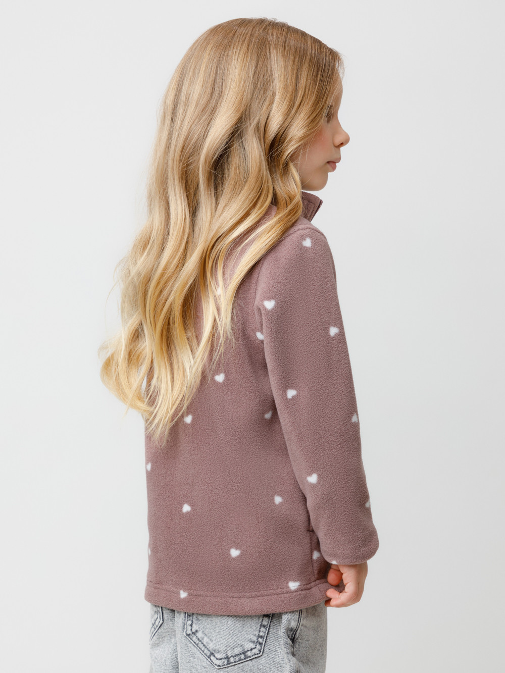 Флисовая куртка для девочки. У изделия высокий воротник и застёжка на молнию с мягкой защитой шеи и подбородка. По бокам два кармана. Оригинальная набивка выполнена из стойких гипоаллергенных текстильных красителей. Куртка сохраняет цвет и форму после многократных стирок.
