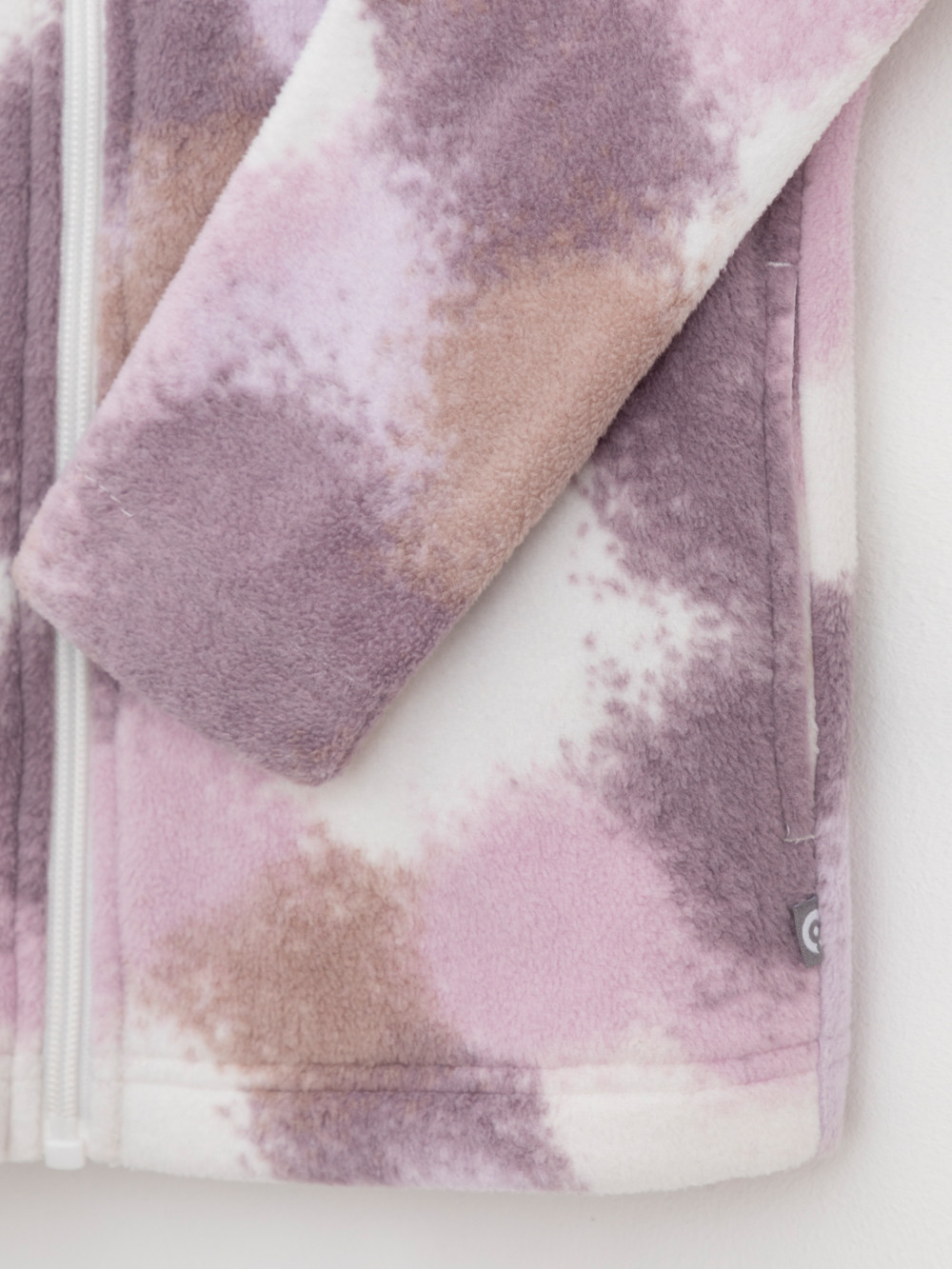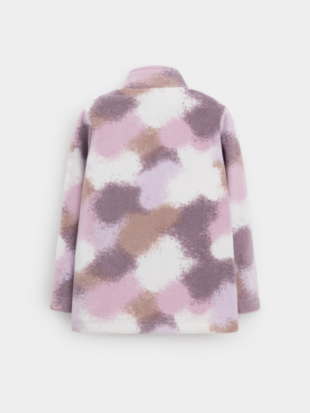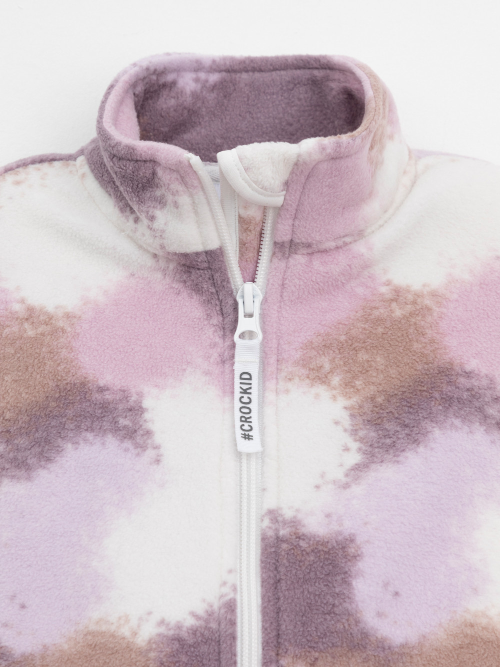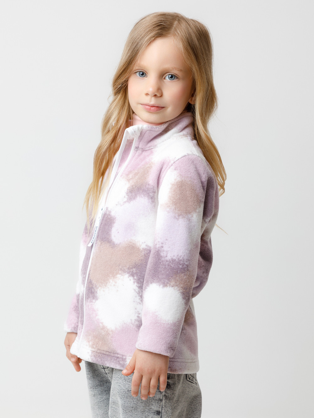 Флисовая куртка для девочки. У изделия высокий воротник и застёжка на молнию с мягкой защитой шеи и подбородка. По бокам два кармана. Оригинальная набивка выполнена из стойких гипоаллергенных текстильных красителей. Куртка сохраняет цвет и форму после многократных стирок.
