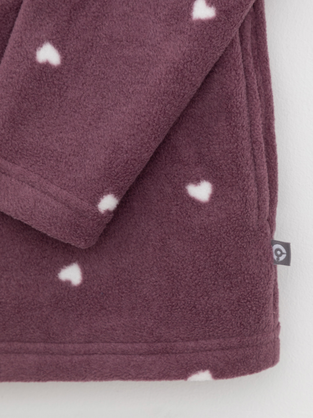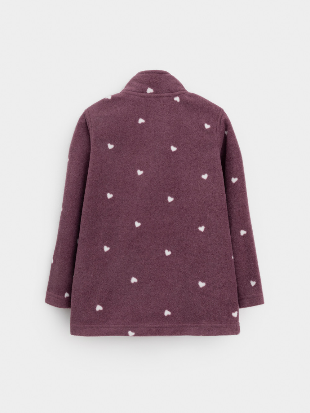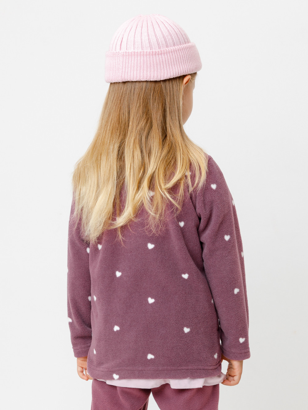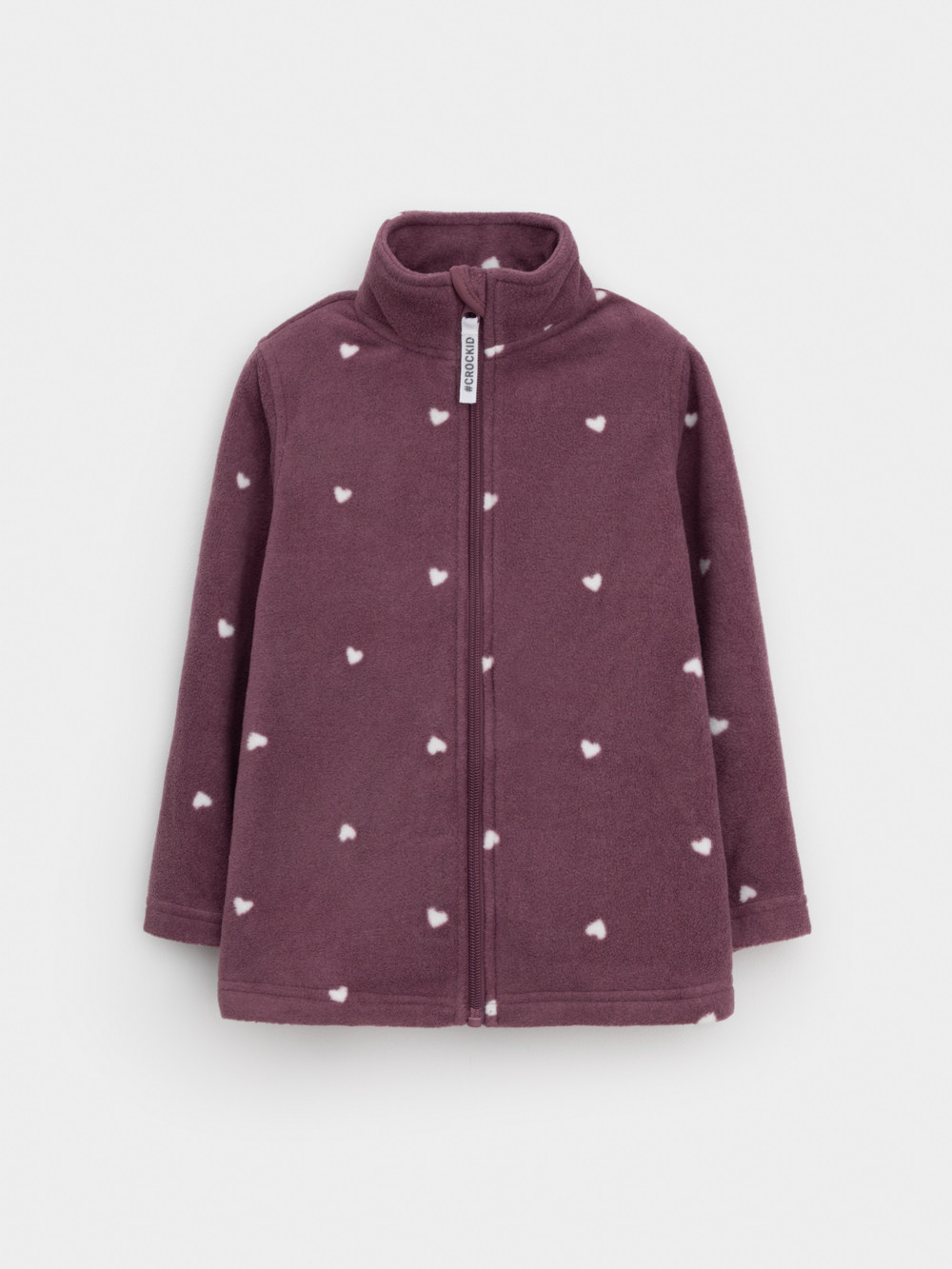 Флисовая куртка для девочки. У изделия высокий воротник и застёжка на молнию с мягкой защитой шеи и подбородка. По бокам два кармана. Оригинальная набивка выполнена из стойких гипоаллергенных текстильных красителей. Куртка сохраняет цвет и форму после многократных стирок.