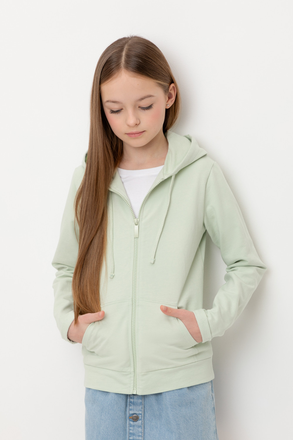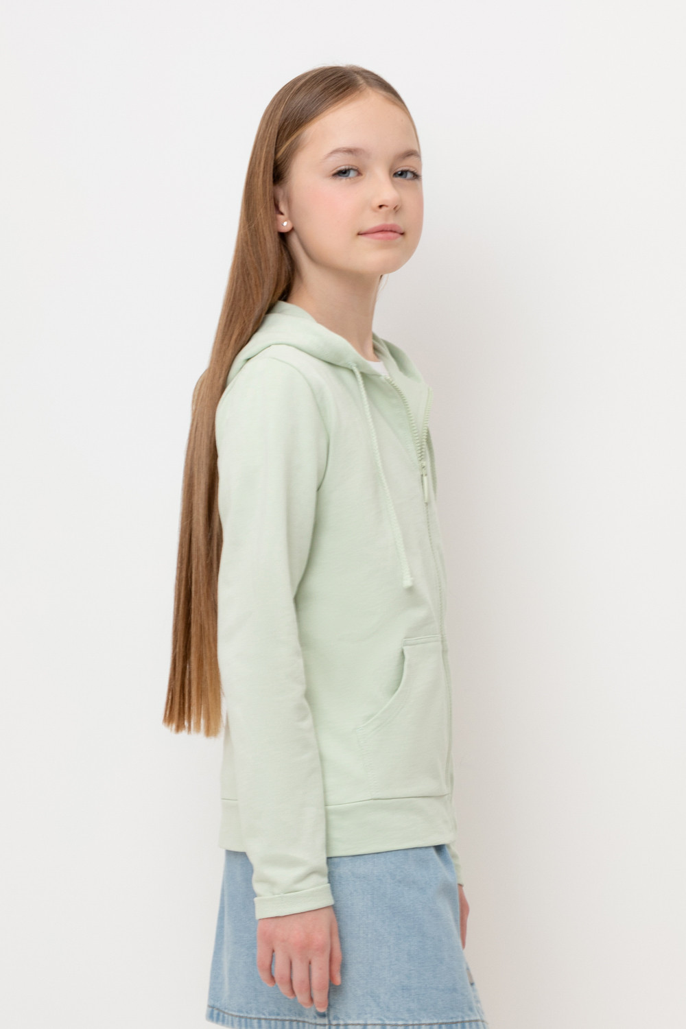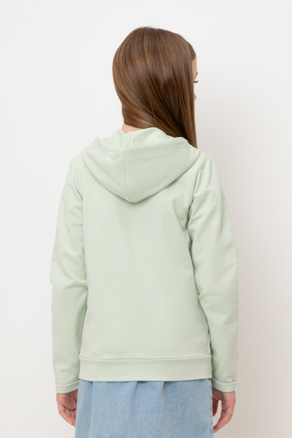 Трикотажная куртка с капюшоном для девочки из петельчатого футера. Спереди удобные накладные карманы, манжеты и пояс из основного полотна.
