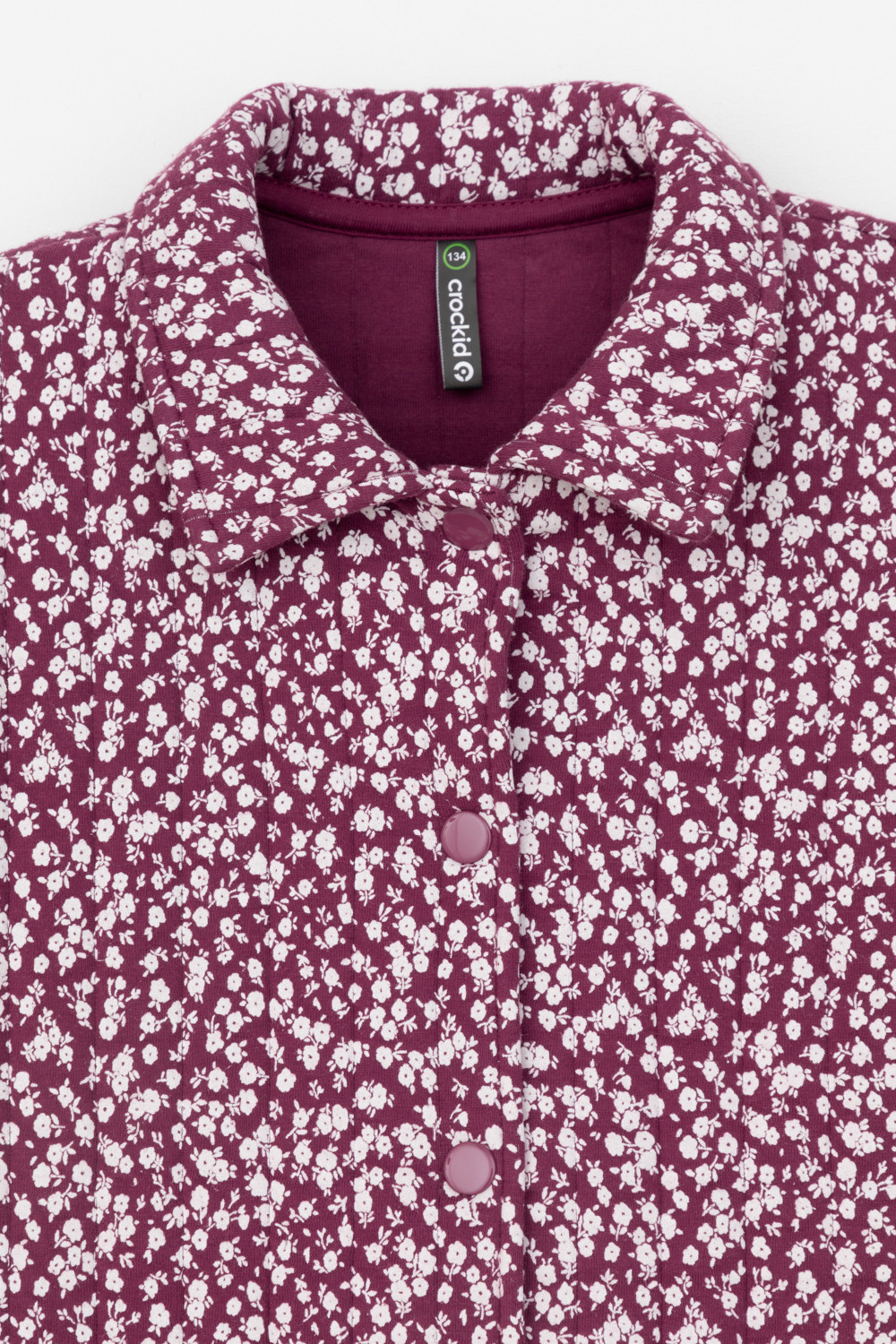 Свободная трикотажная рубашка для девочки из мягкого капитония на кнопках. Модель с закругленным низом и спущенным плечом. Оригинальная набивка выполнена из стойких текстильных гипоаллергенных красителей.