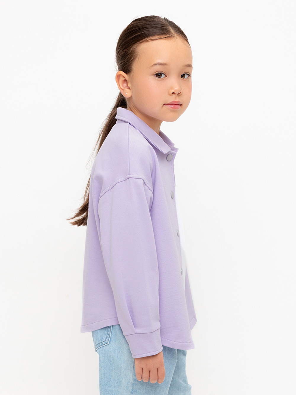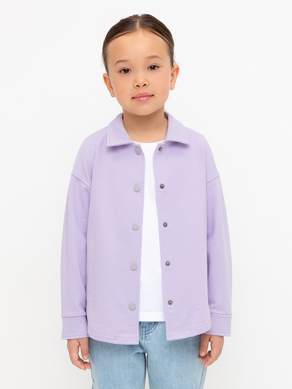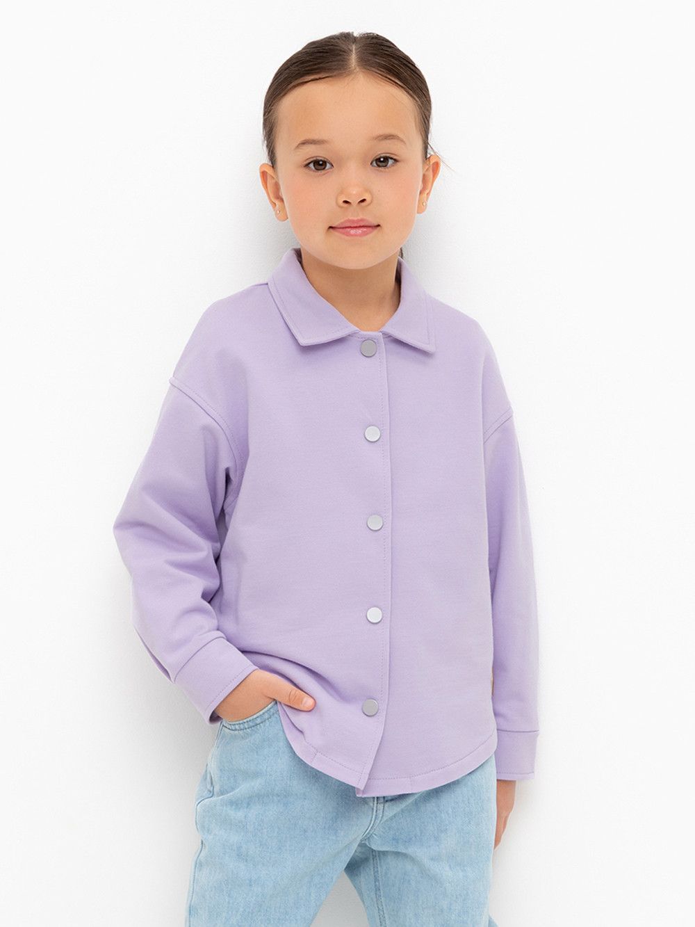 Свободная трикотажная рубашка для девочки из мягкого петельчатого футера. Застёгивается на кнопки. Модель с закругленным низом и спущенным плечом.