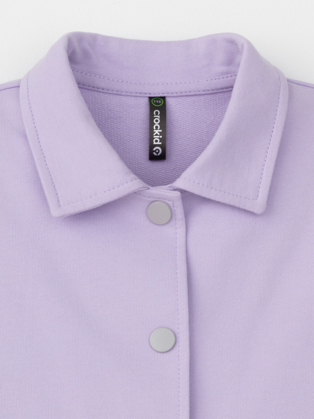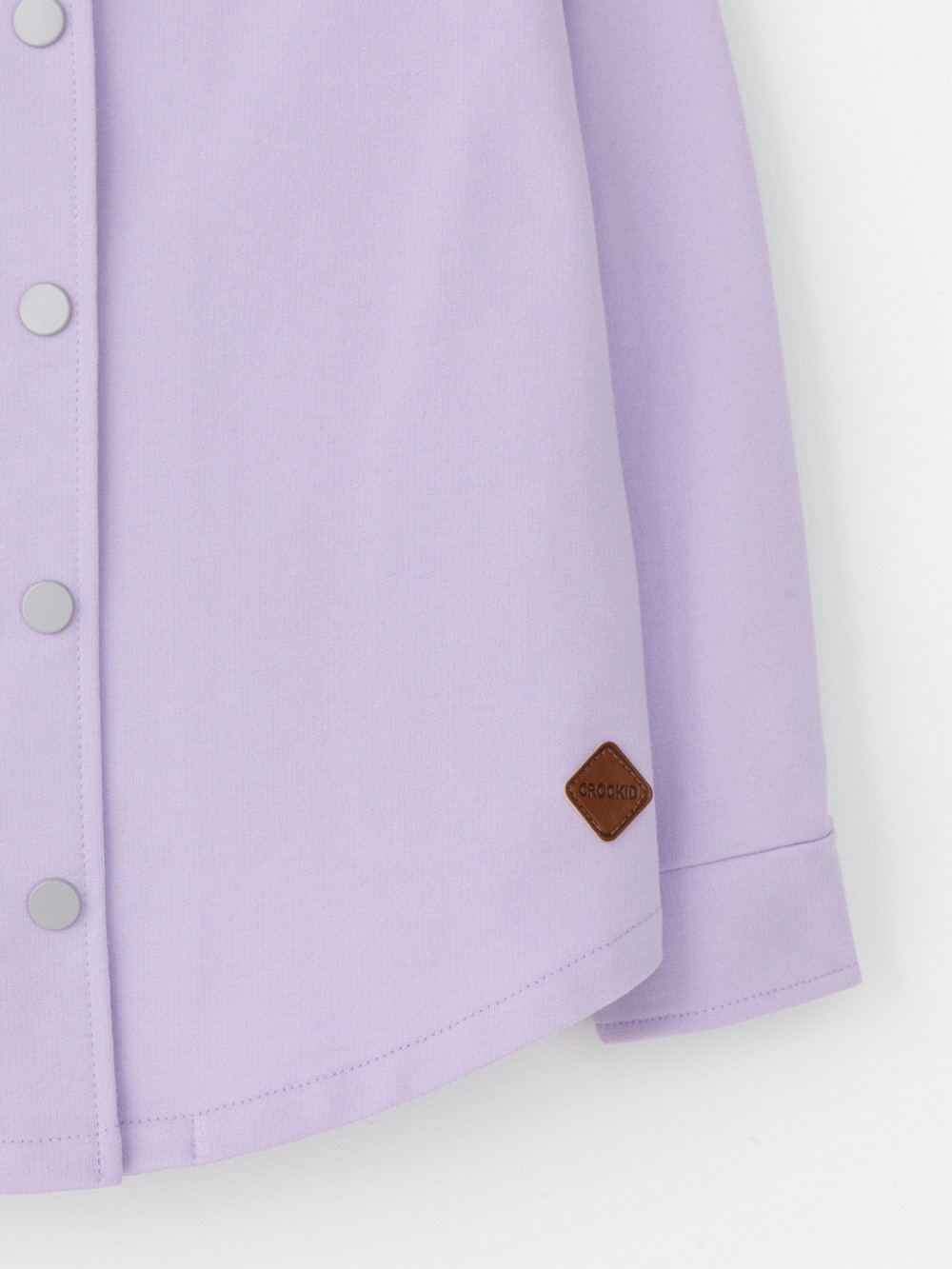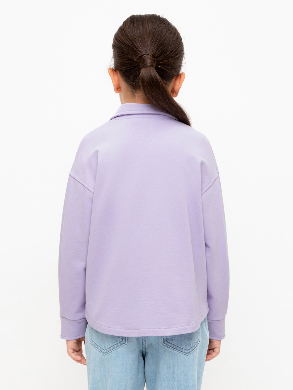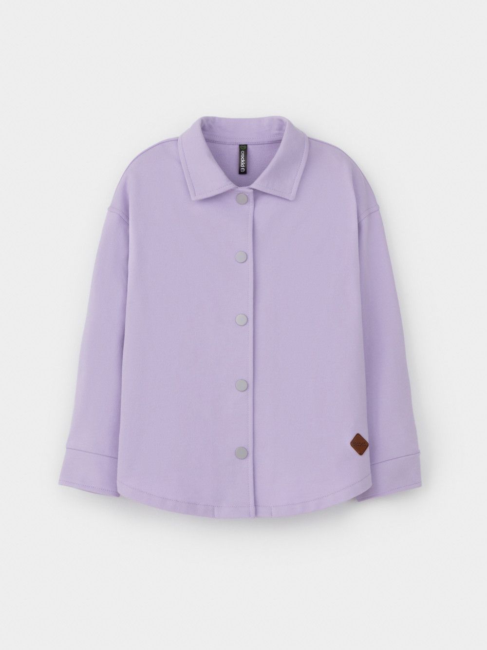 Свободная трикотажная рубашка для девочки из мягкого петельчатого футера. Застёгивается на кнопки. Модель с закругленным низом и спущенным плечом.
