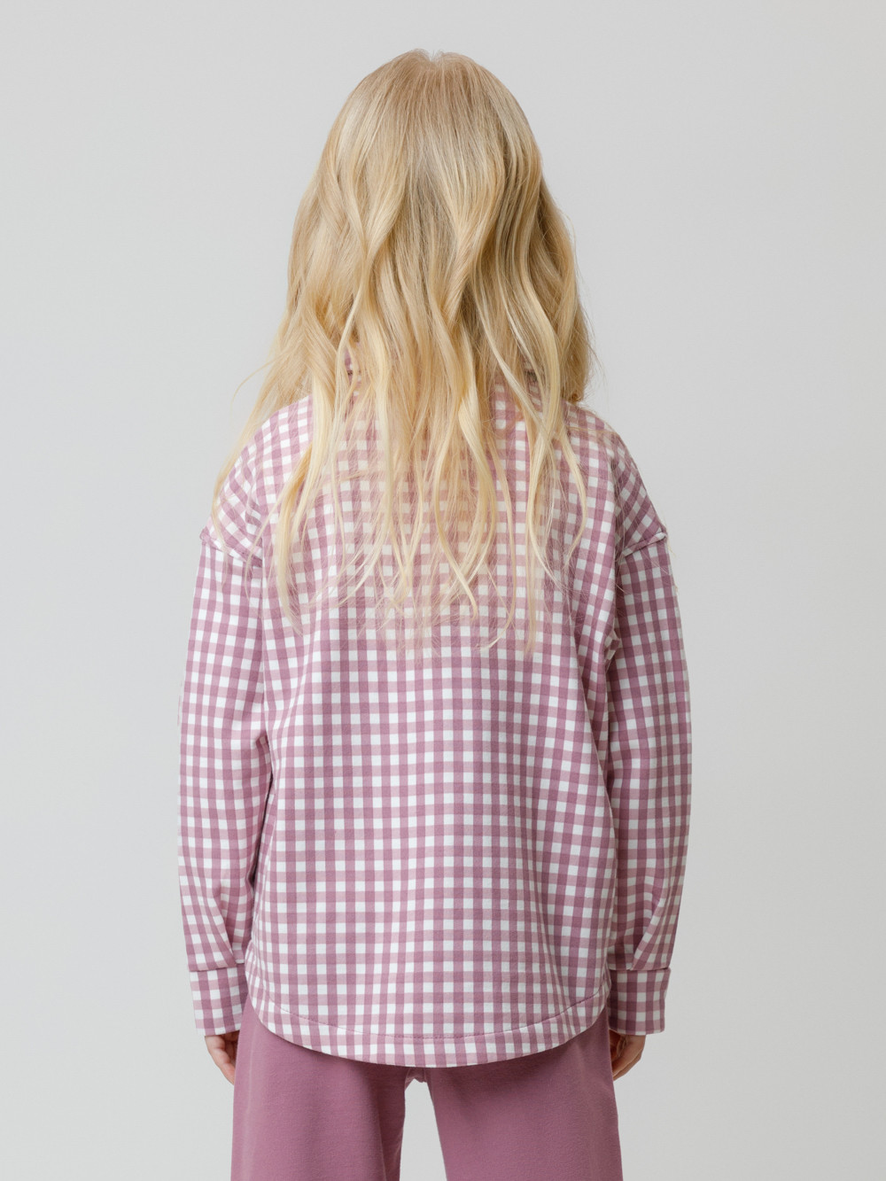 Свободная трикотажная рубашка для девочки из мягкого петельчатого футера. Застёгивается на кнопки. Модель с закругленным низом и спущенным плечом. Рисунок в клетку выполнен из стойких текстильных гипоаллергенных красителей. Изделие сохраняет цвет и форму после многократных стирок. Все трикотажные полотна производятся в соответствии с нормами швейцарского сертификата ЭкоТекс.