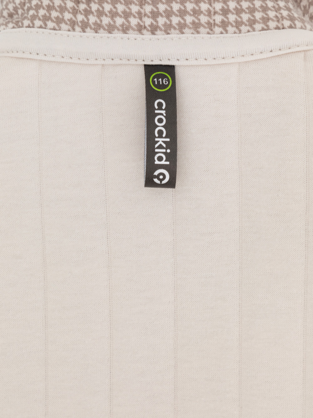 Тёплая рубашка свободного кроя для девочки из мягкого капитония. Капитоний – это стёганое трикотажное полотно с утеплителем из полиэстеровой нити. Модель с закругленным низом и спущенным плечом. Застёгивается на пуговицы. Рисунок в гусиную лапку выполнен из стойких текстильных гипоаллергенных красителей. Все трикотажные полотна производятся в соответствии с нормами швейцарского сертификата ЭкоТекс.