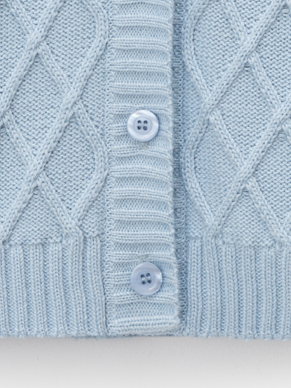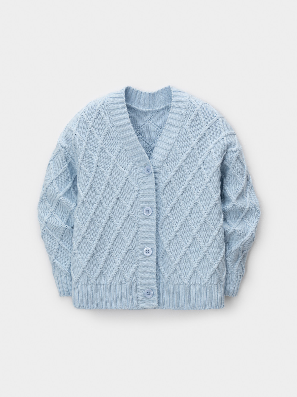 Вязаный кардиган для девочки. Изготовлен из мягкой хлопковой пряжи с добавлением акрила. Застёгивается на планку с пуговицами. Длинные рукава с манжетами. Внизу эластичный пояс. Изделие сохраняет форму и стойкий цвет после многочисленных стирок.
