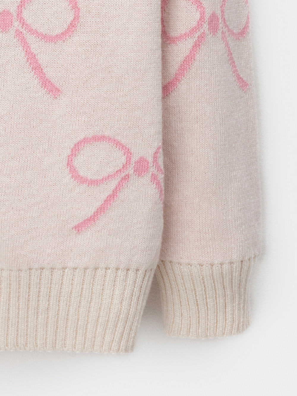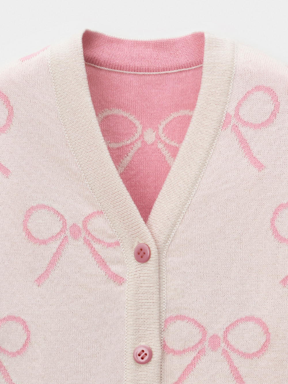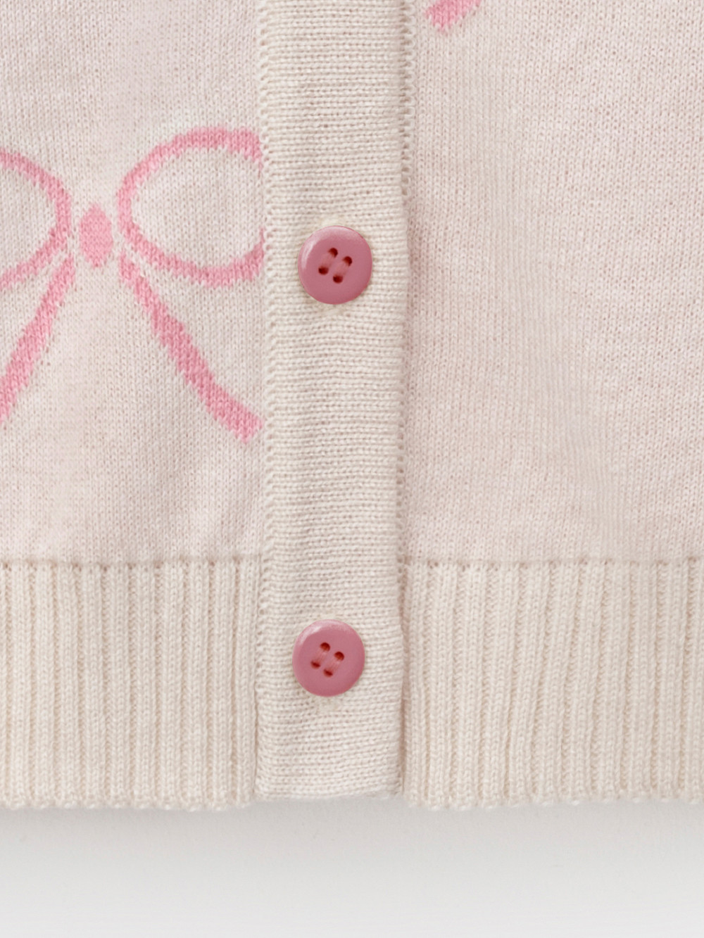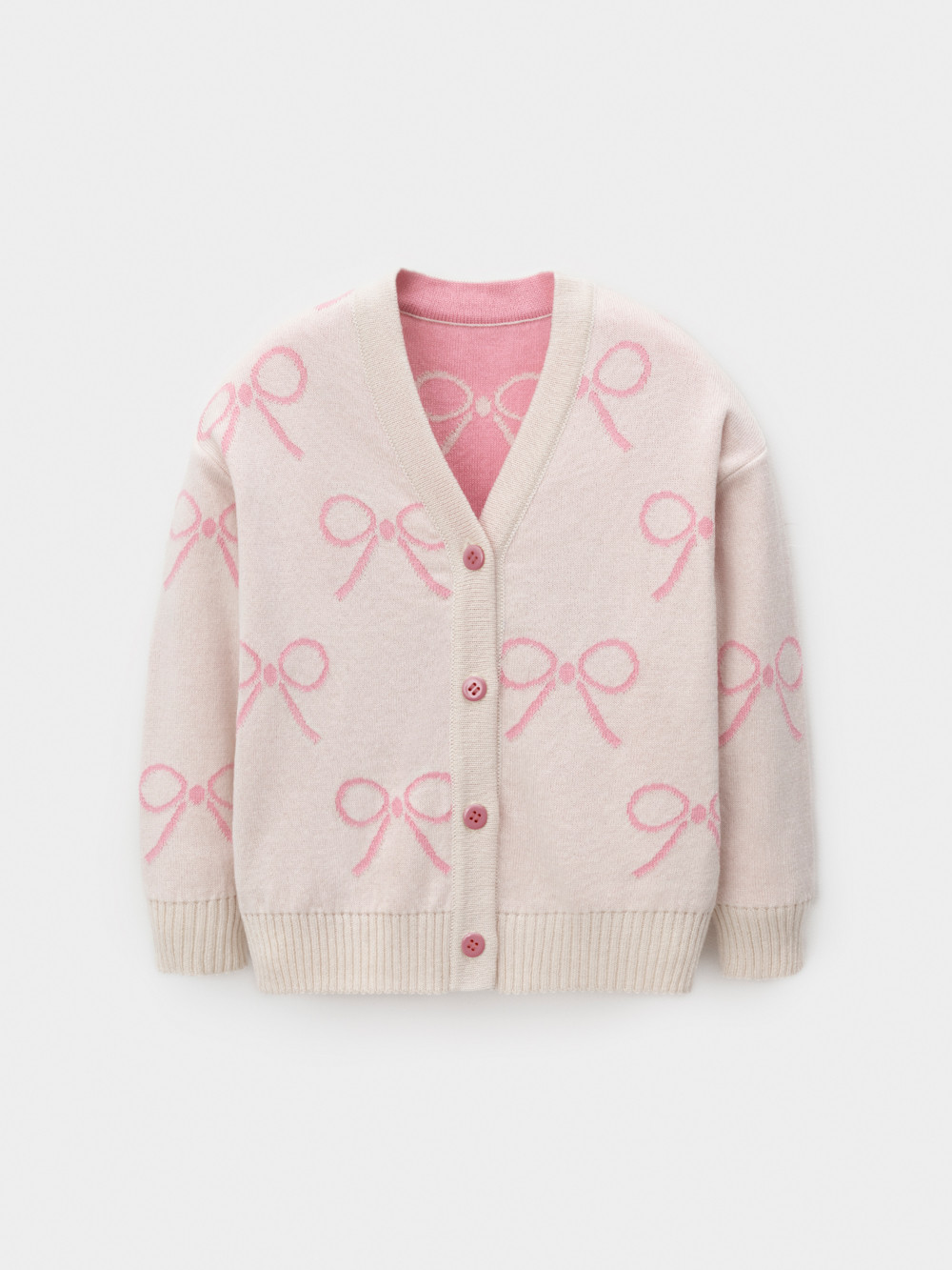Вязаный кардиган с бантиками для девочки. Изготовлен из мягкой хлопковой пряжи с добавлением акрила. Застёгивается на планку с пуговицами. Длинные рукава с манжетами. Внизу эластичный пояс. Изделие сохраняет форму и стойкий цвет после многочисленных стирок.