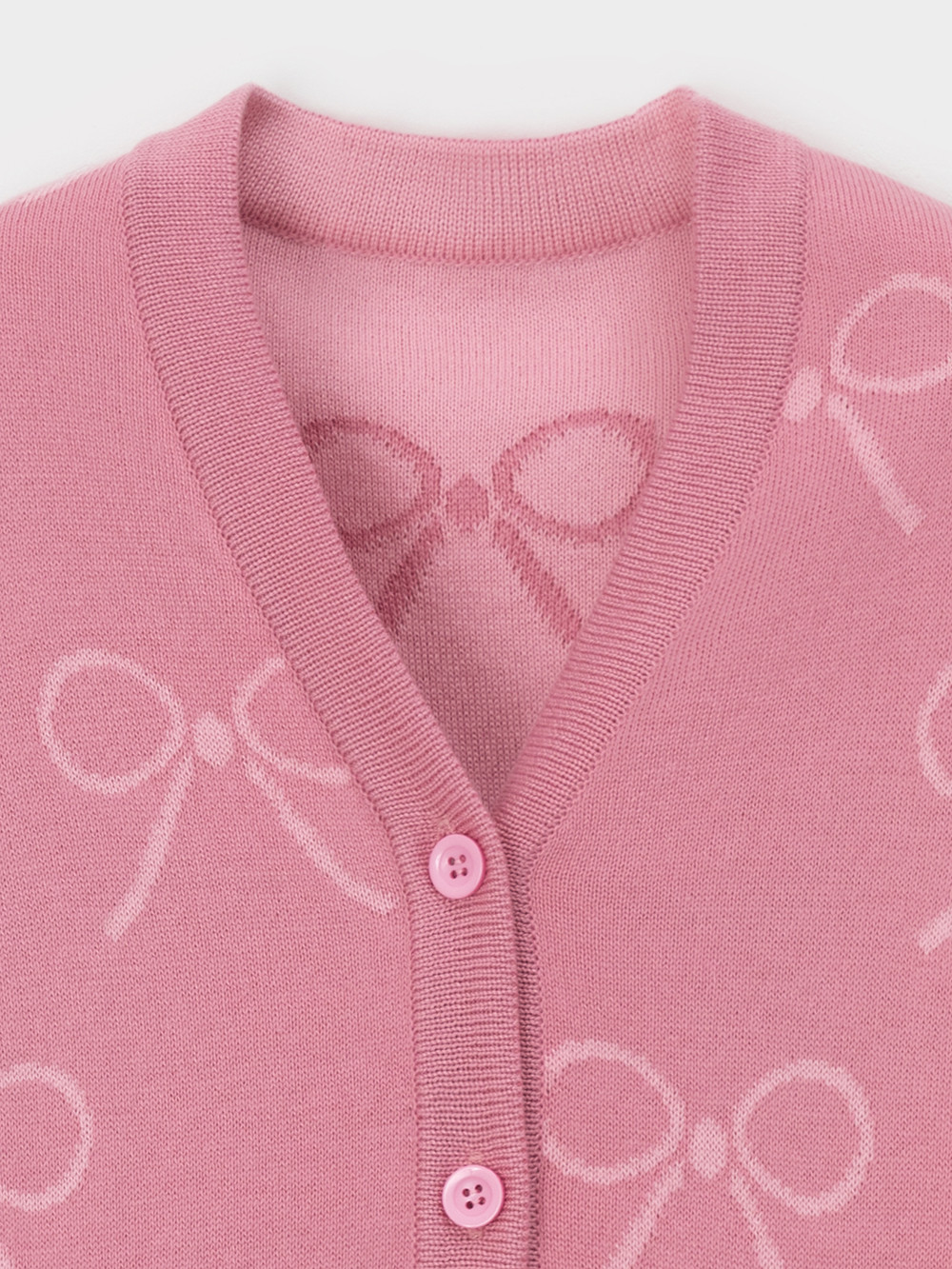 Вязаный кардиган с бантиками для девочки. Изготовлен из мягкой хлопковой пряжи с добавлением акрила. Застёгивается на планку с пуговицами. Длинные рукава с манжетами. Внизу эластичный пояс. Изделие сохраняет форму и стойкий цвет после многочисленных стирок.