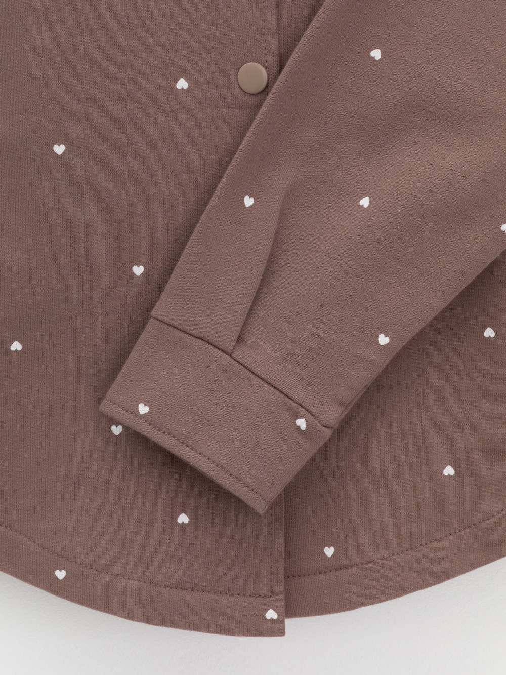 Свободная трикотажная рубашка для девочки из мягкого футера с начесом. Застёгивается на кнопки. Модель с закругленным низом и спущенным плечом. Рисунок выполнен из стойких текстильных гипоаллергенных красителей. Изделие сохраняет цвет и форму после многократных стирок. Все трикотажные полотна производятся в соответствии с нормами швейцарского сертификата ЭкоТекс.