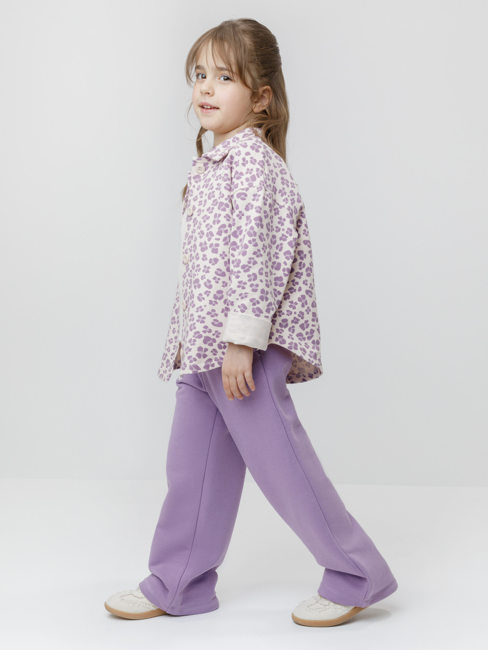 Свободная трикотажная рубашка для девочки из мягкого петельчатого футера. Застёгивается на пуговицы. Модель с закруглённым низом и спущенным плечом. Изделие сохраняет цвет и форму после многократных стирок. Все трикотажные полотна производятся в соответствии с нормами швейцарского сертификата ЭкоТекс.