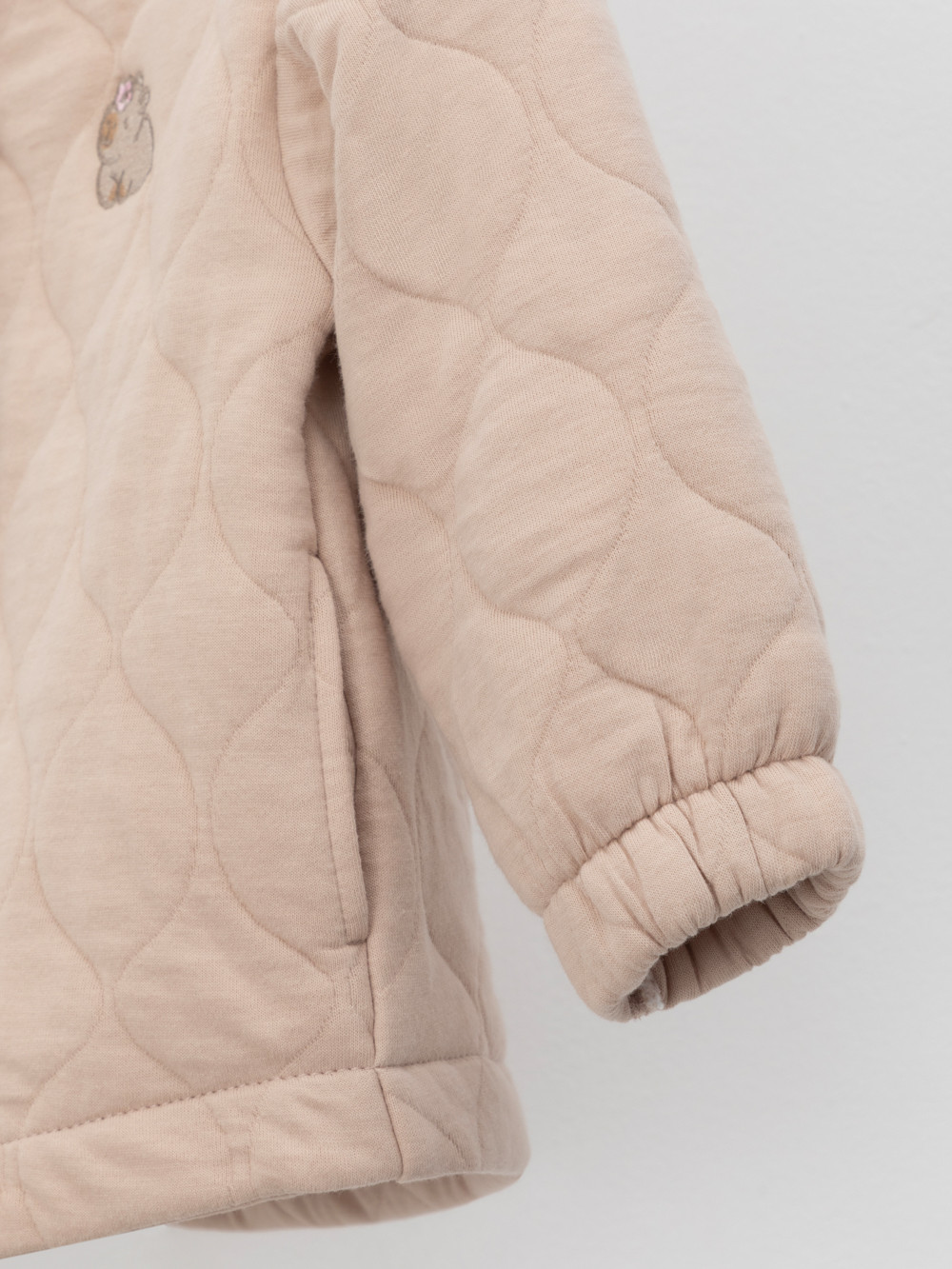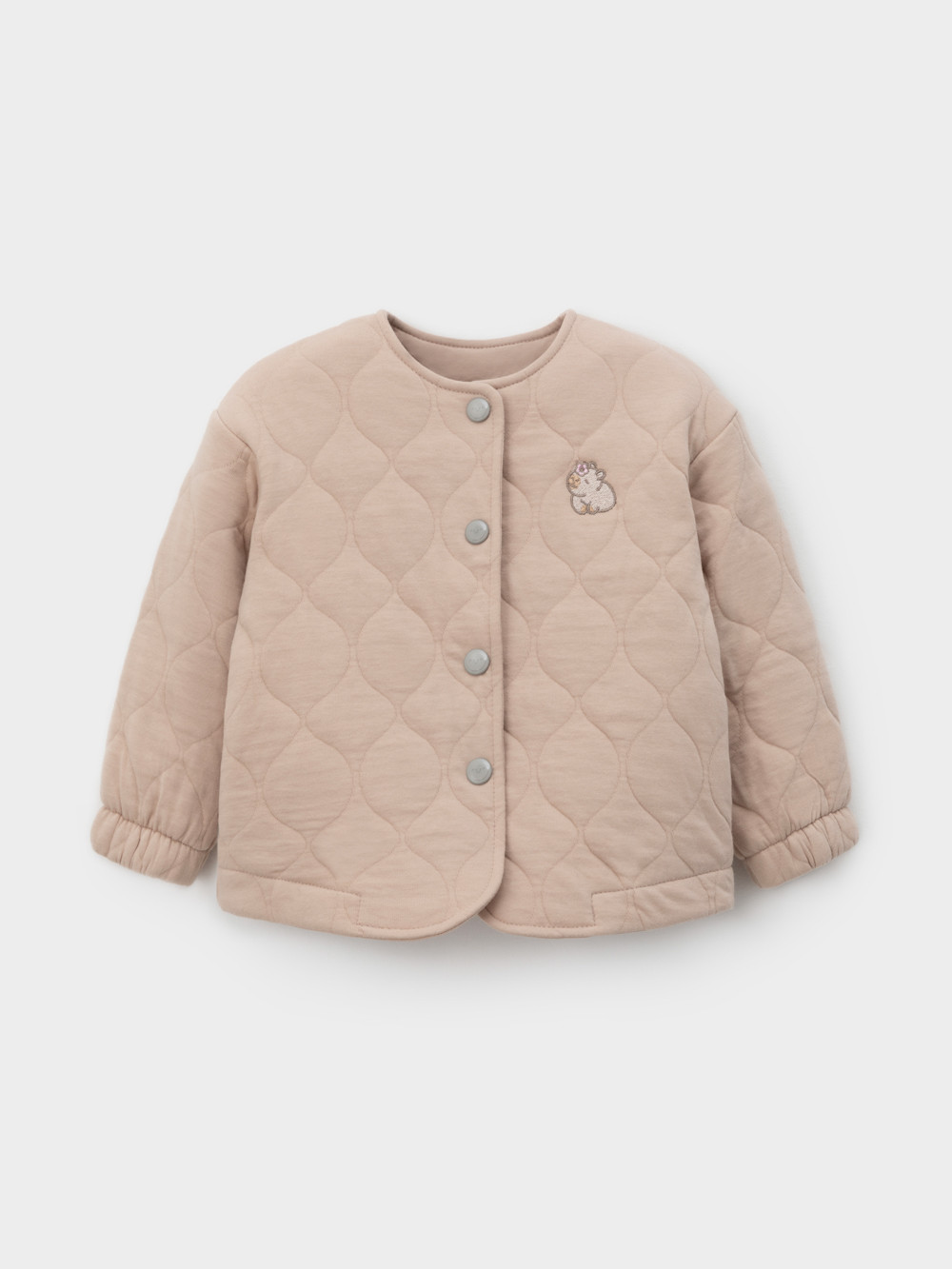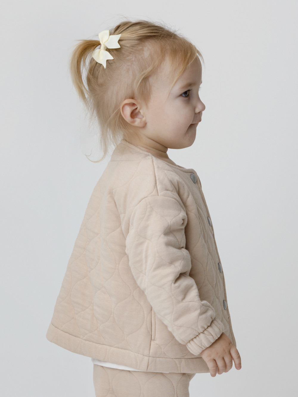 Тёплый бомбер из капитония для девочки.  Капитоний — это стёганое трикотажное полотно с утеплителем из полиэстеровой нити. Модель застёгивается на кнопки. На рукавах эластичные манжеты на резинке. Изделие сохраняет цвет и форму после многократных стирок. Все трикотажные полотна производятся в соответствии с нормами швейцарского сертификата ЭкоТекс.