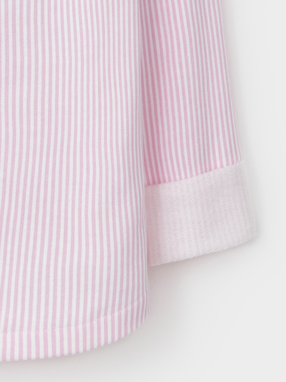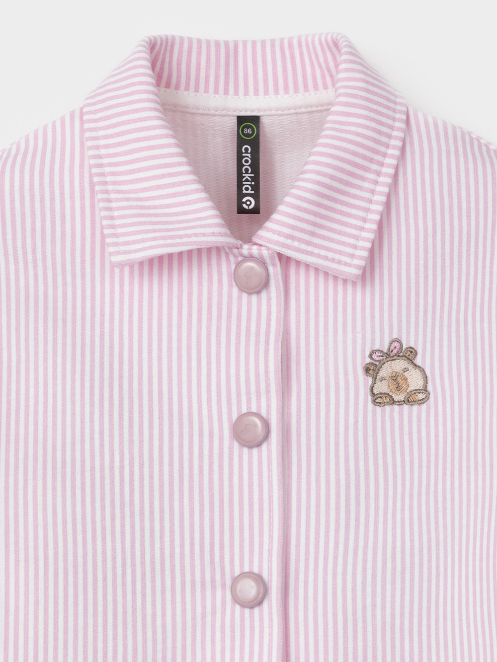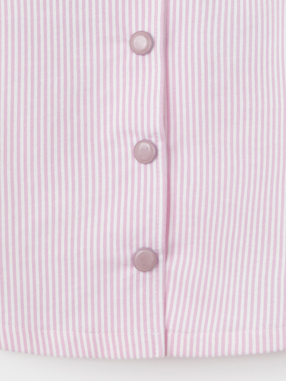 Свободная трикотажная рубашка для девочки из мягкого петельчатого футера. Застёгивается на кнопки. Модель с закруглённым низом и спущенным плечом. Рисунок в полоску выполнен из стойких текстильных гипоаллергенных красителей. Изделие сохраняет цвет и форму после многократных стирок. Все трикотажные полотна производятся в соответствии с нормами швейцарского сертификата ЭкоТекс.