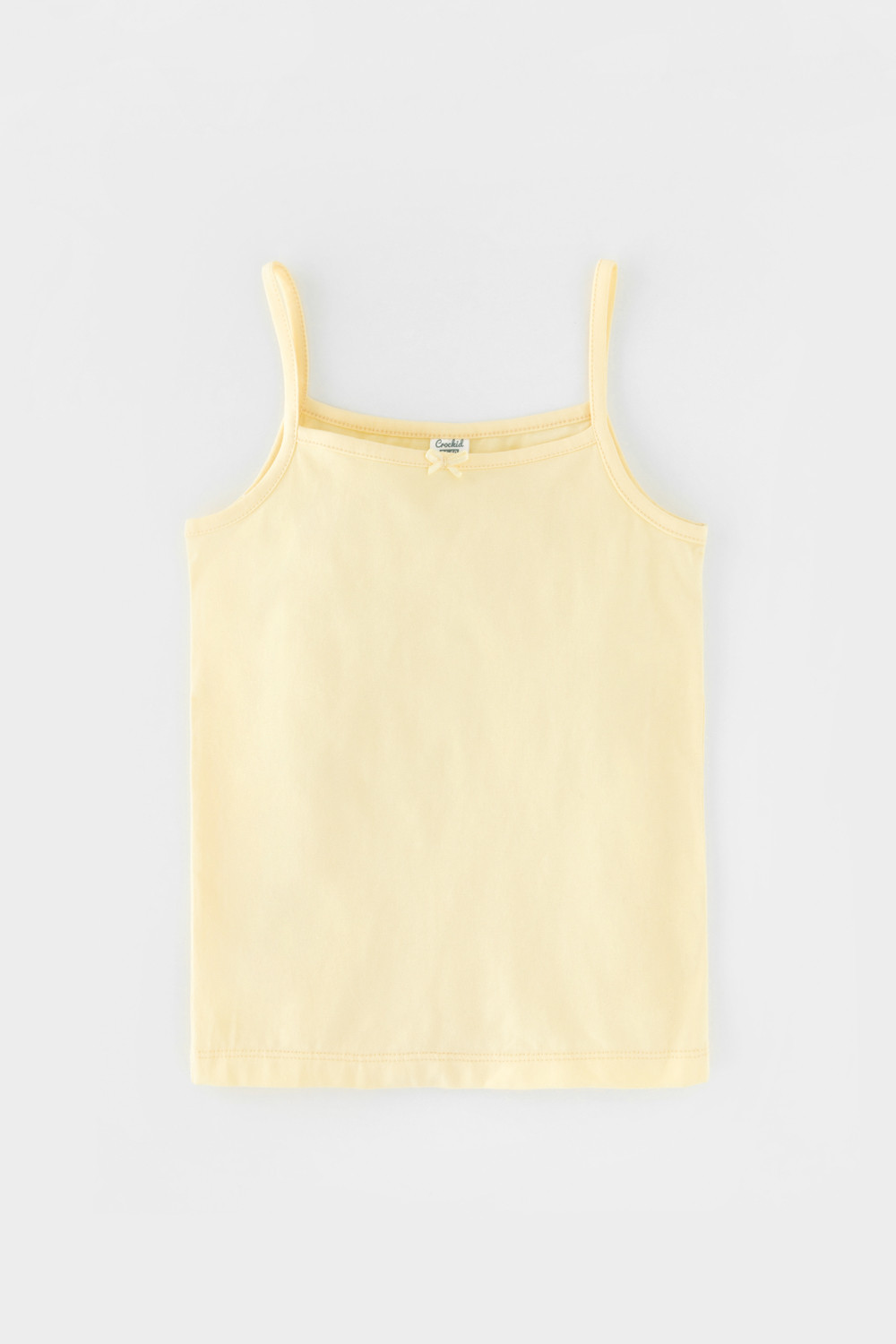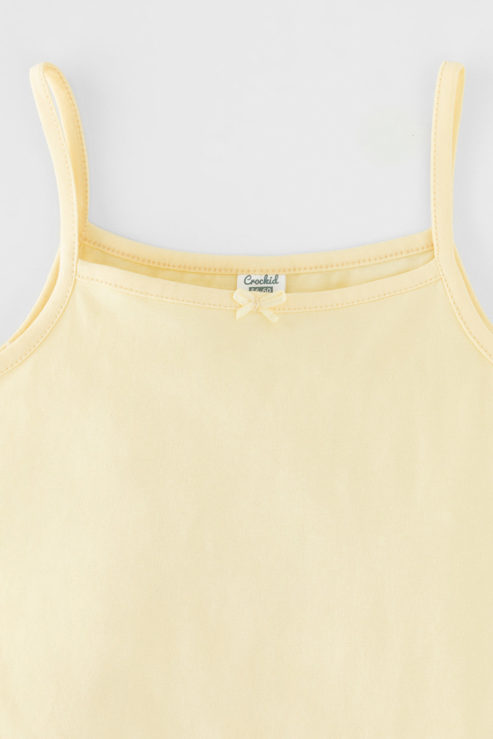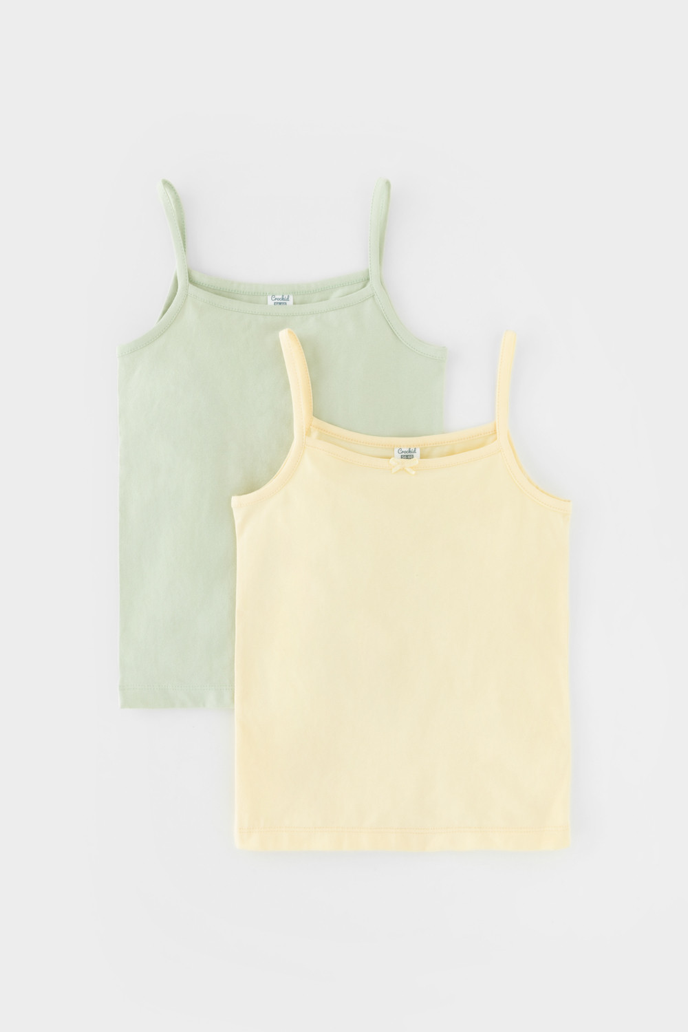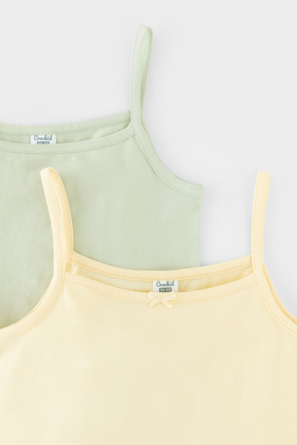 Трикотажные майки в комплекте 2 шт на тонких бретелях из однотонного супрема с эластаном, горловина спинки и проймы обработаны кантом, по горловине полочки декоративная эластичная тесьма и атласный бантик. Сохраняют цвет и форму после многократных стирок. Все трикотажные полотна производятся в соответсвии с нормами Швейцарского сертификата ЭкоТекс.