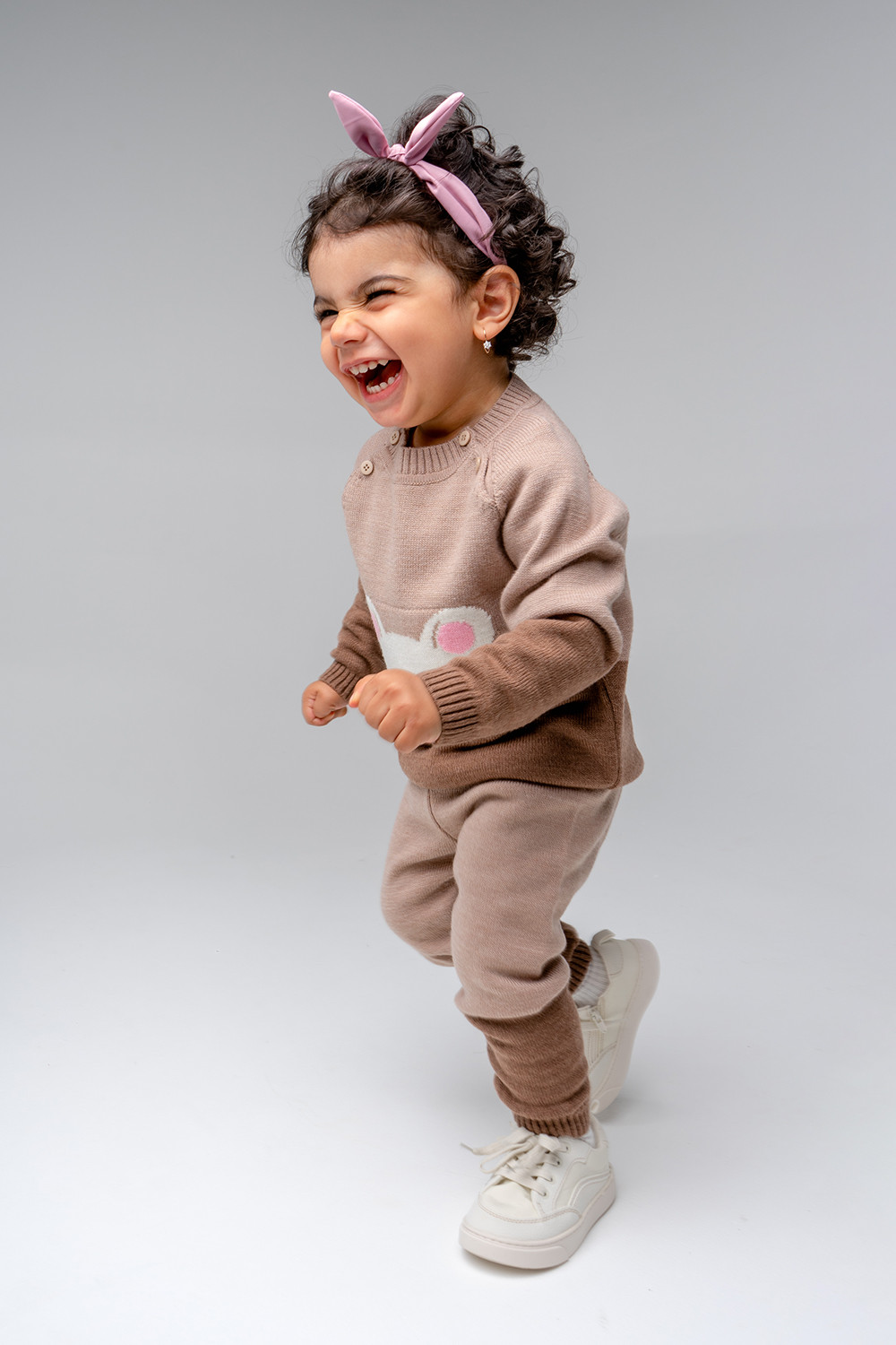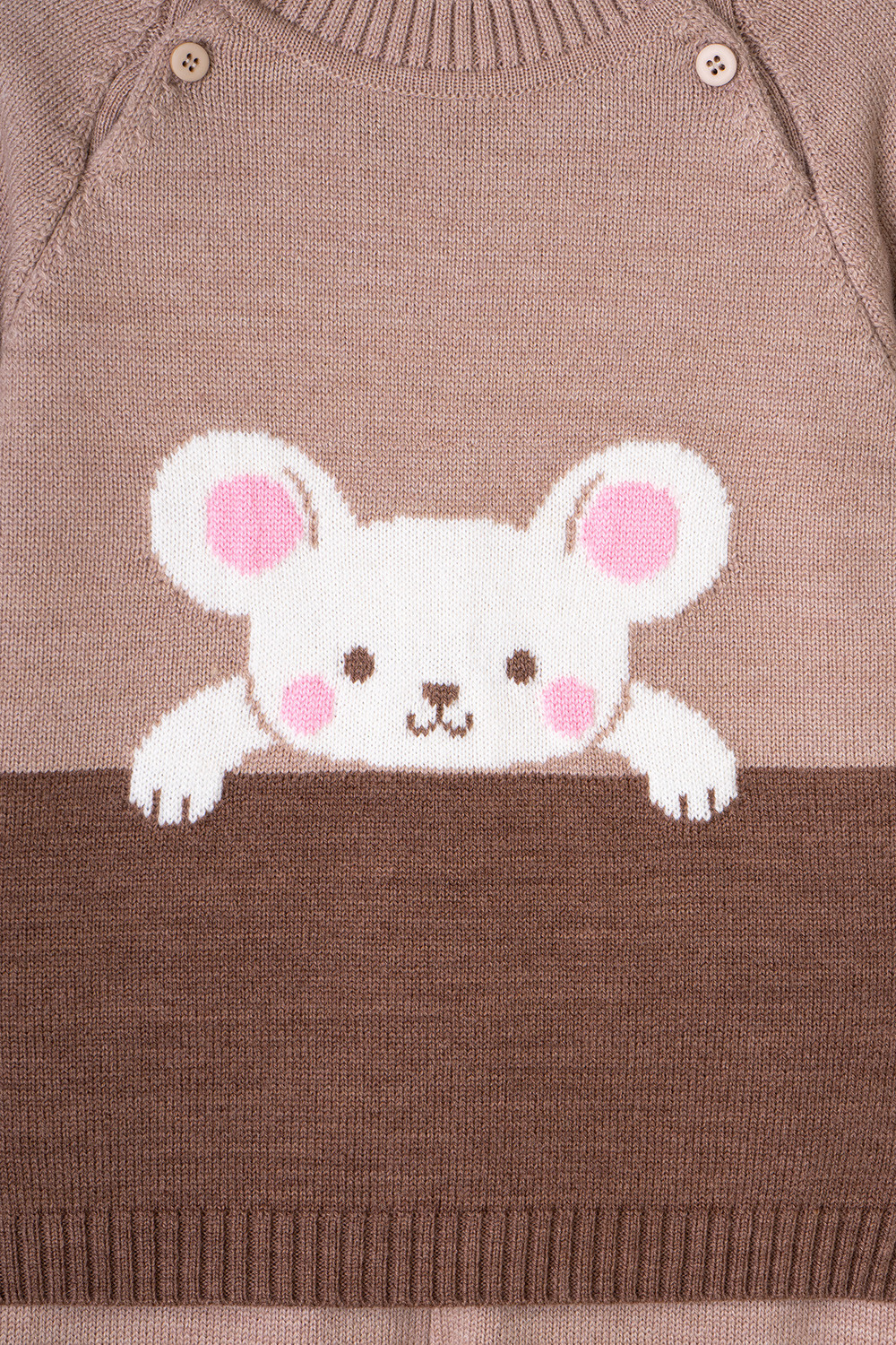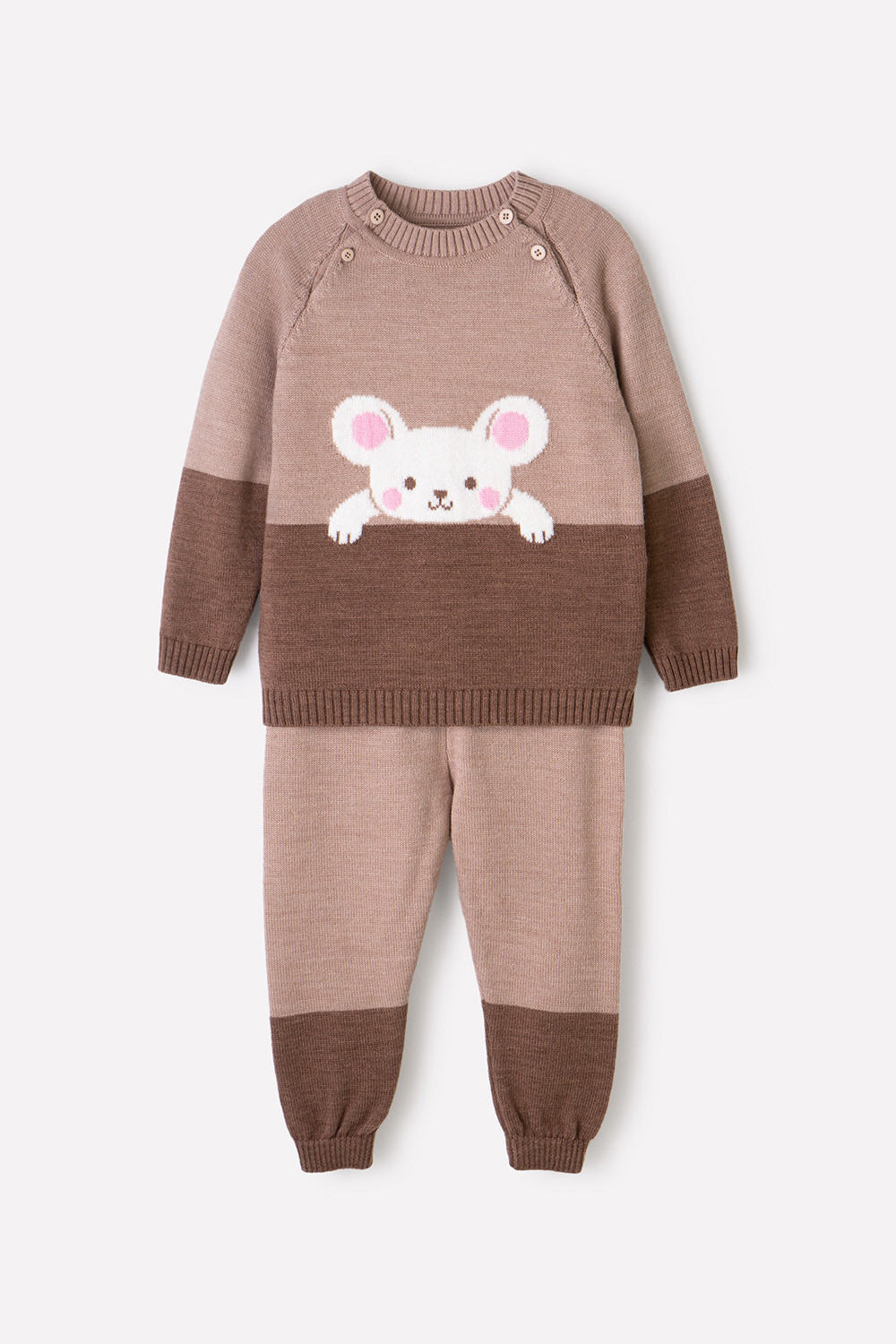 Теплый вязанный комплект из полушерстяной пряжи в состав которой входит шерсть австралийского мериноса. У изделия рукава-реглан, эластичные манжеты и пояс на резинке. Для удобства джемпер застегивается на пуговицы с двух сторон.