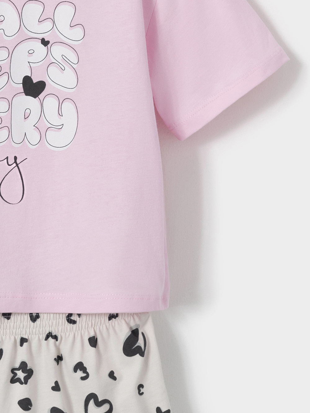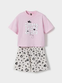 Набор трикотажный для девочки: футболка с короткими спущенными рукавами и свободные шорты. Комплект изготовлен из гладкого трикотажа супрем, который произведён из 100% натурального хлопка высокого качества. Изделия отлично дышат, а свободный крой не стесняет движения, поэтому футболка и шорты комфортны для активных игр, отдыха и занятий спортом. Оригинальный принт и набивка выполнены из стойких текстильных гипоаллергенных красителей. Комплект сохраняет цвет и форму после многократных стирок. Все трикотажные полотна производятся в соответствии с нормами швейцарского сертификата ЭкоТекс.