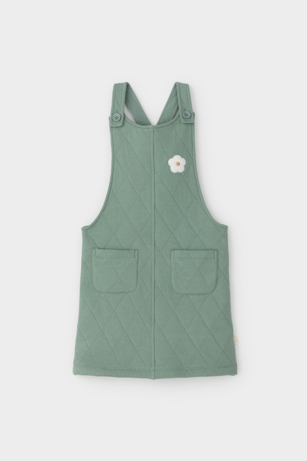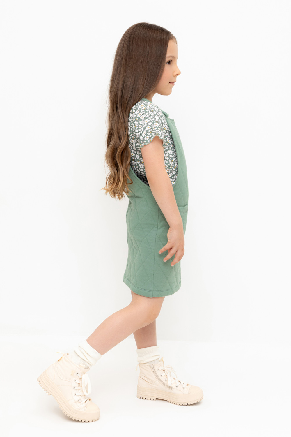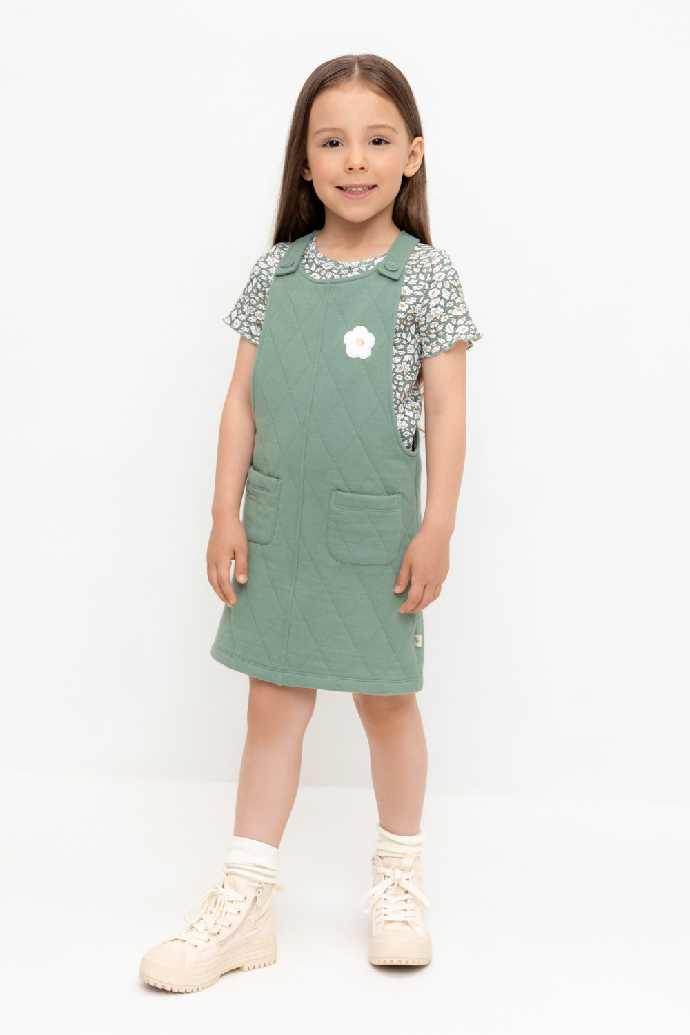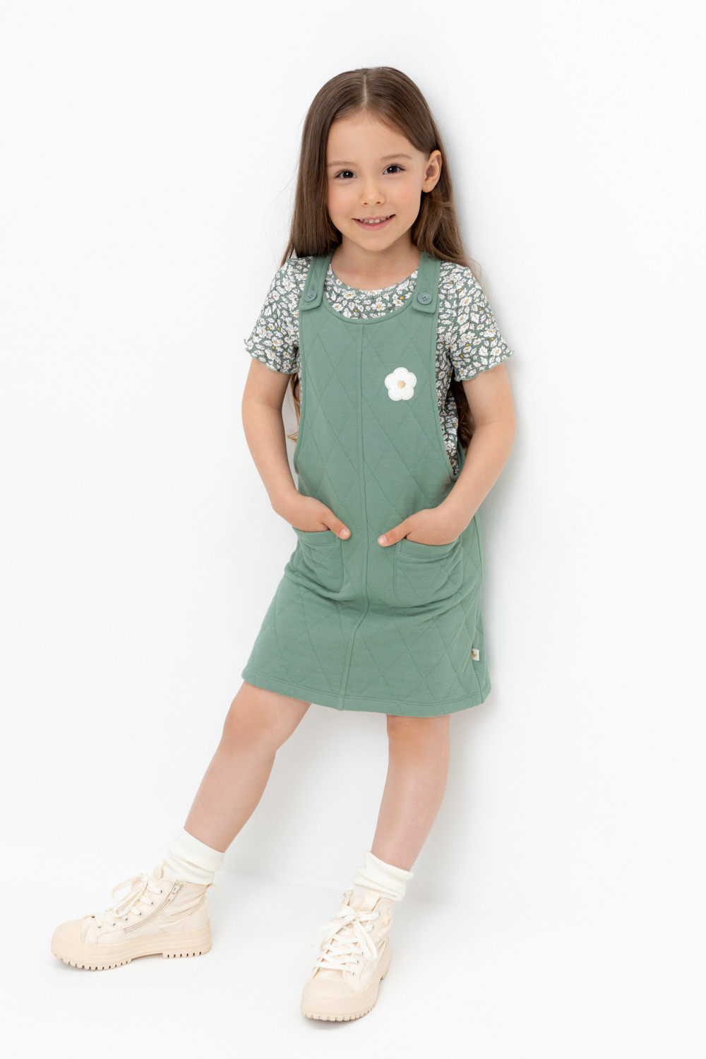 Сарафан из высококачественного капитония с двумя накладными карманами. Лямки застегиваются на пуговицы