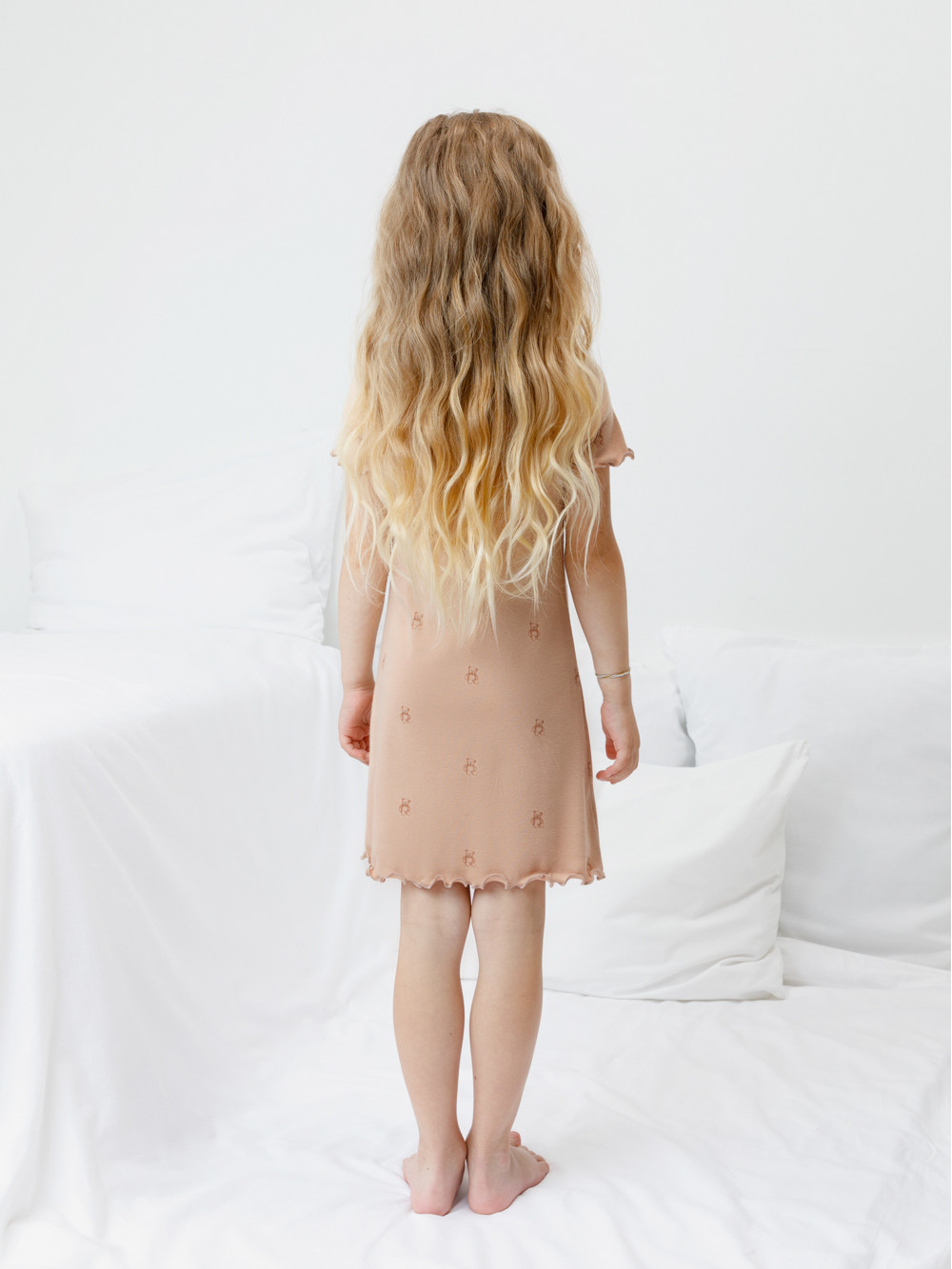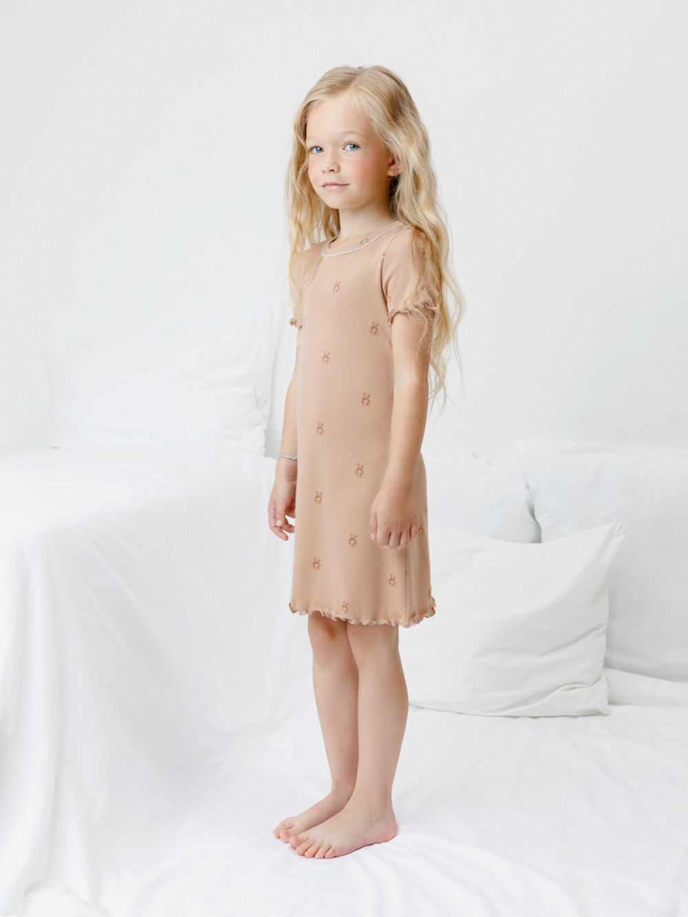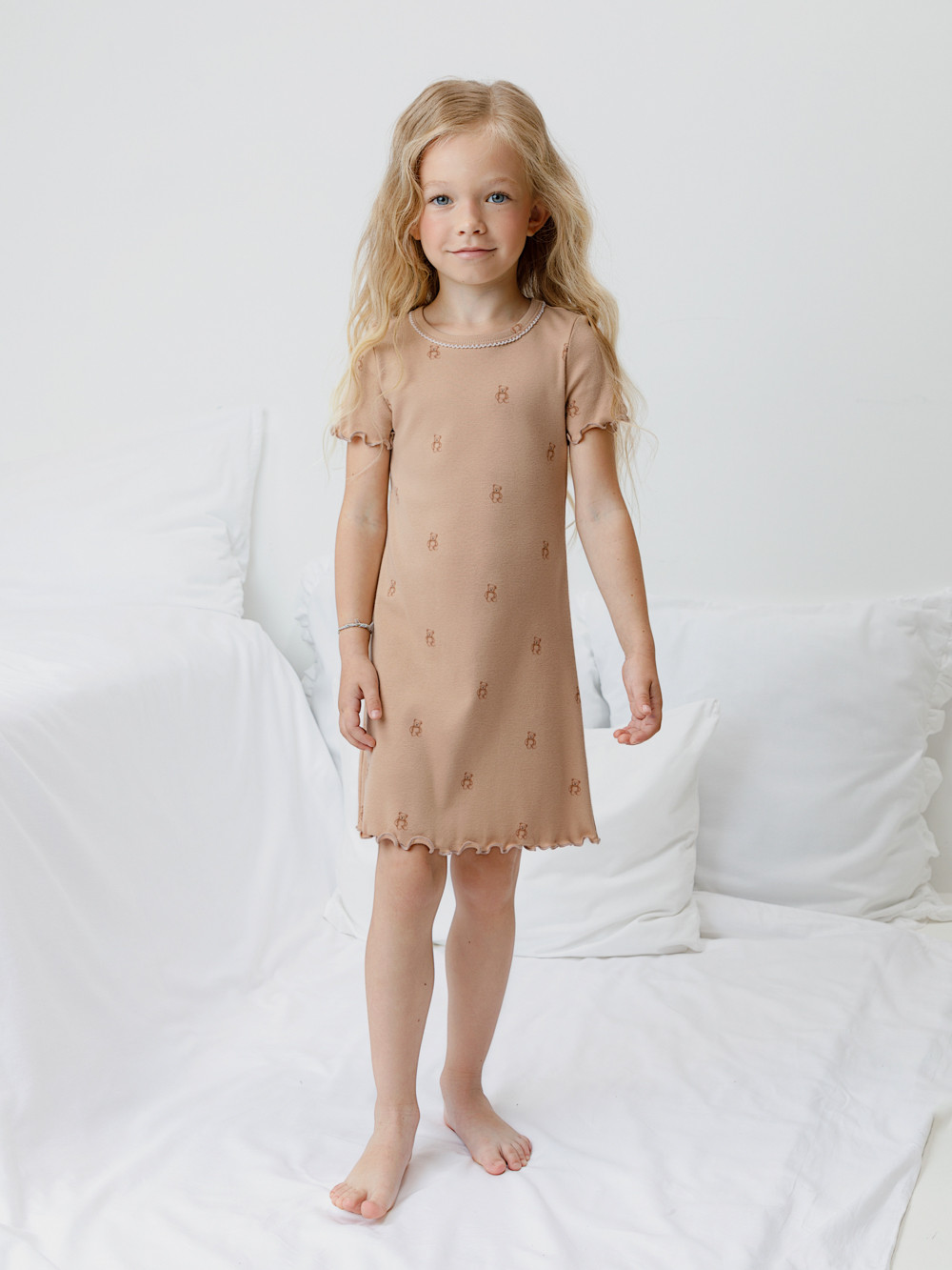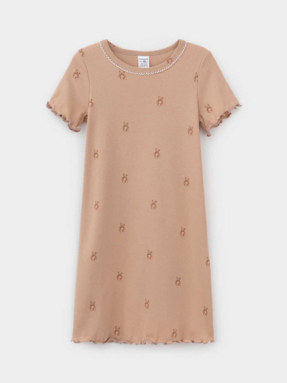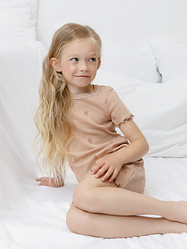 Сорочка с короткими втачными рукавами для девочки. Изготовлена из мягкого эластичного трикотажа в рубчик, произведённого из натурального хлопка. Оригинальная набивка выполнена из стойких гипоаллергенных текстильных красителей. Изделие сохраняет цвет и форму после многократных стирок. Все трикотажные полотна производятся в соответствии с нормами швейцарского сертификата ЭкоТекс.