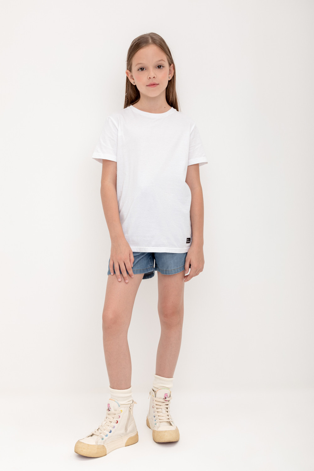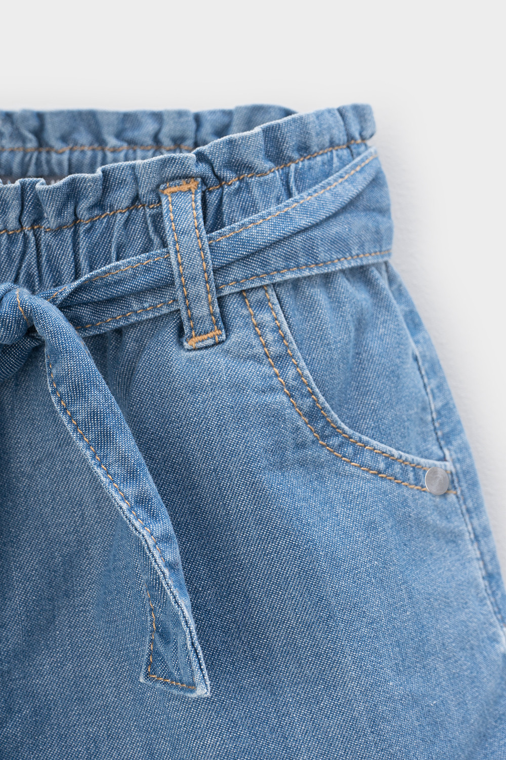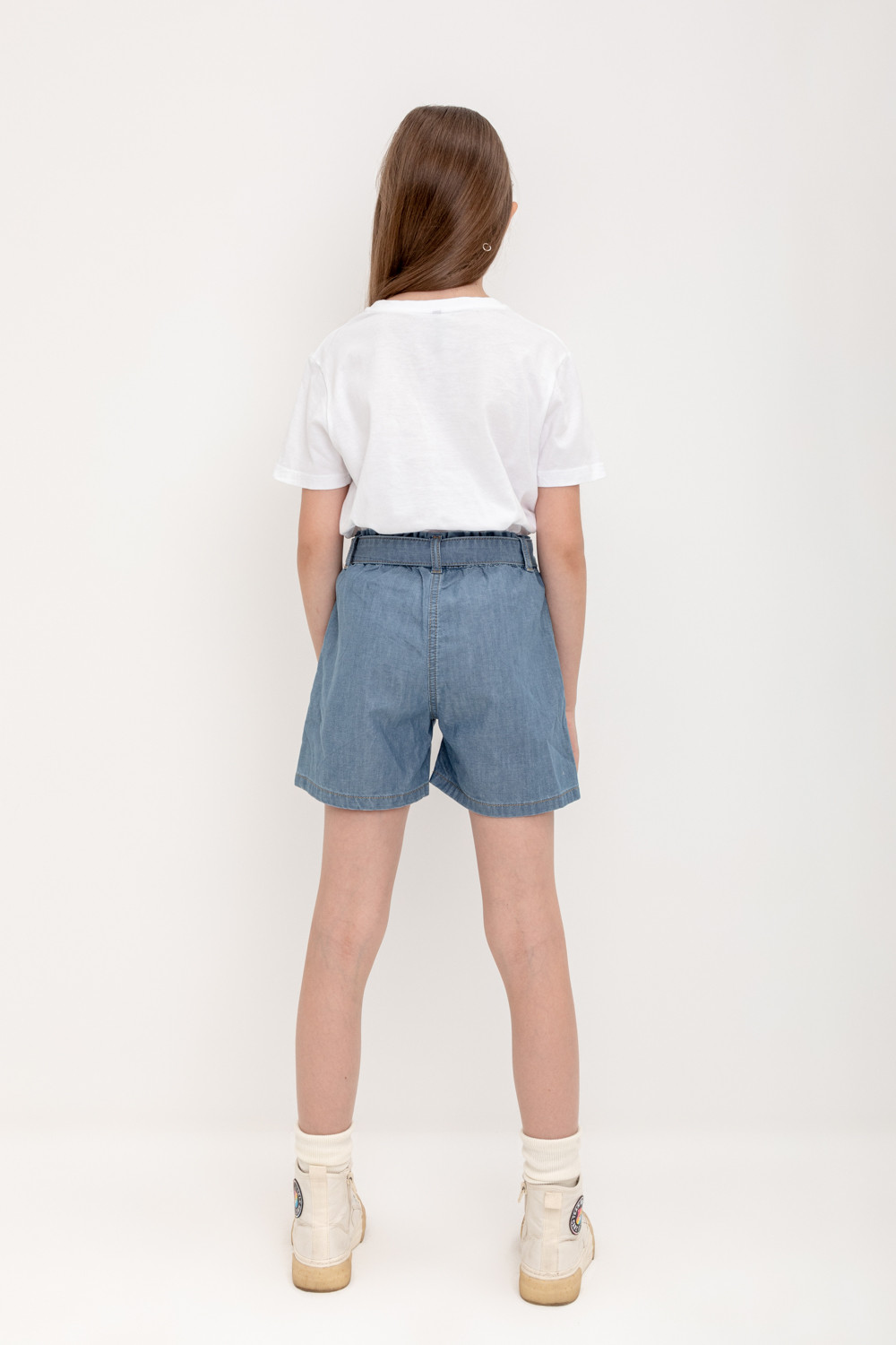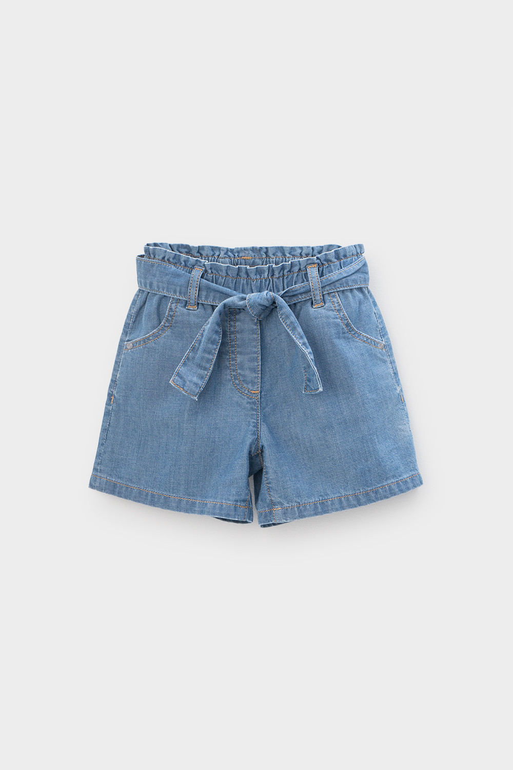 Джинсовые шорты для девочки на резинке. По бокам карманы. Пояс выполнен из основного полотна.