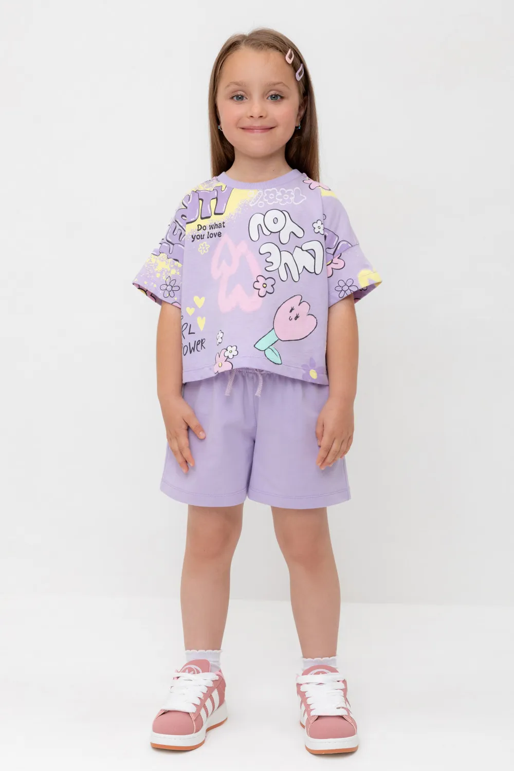 Трикотажные шорты для девочки свободного кроя из петельчатого футера. Эластичный пояс на резинке регулируется по ширине с помощью шнурка, по бокам два удобных кармана.