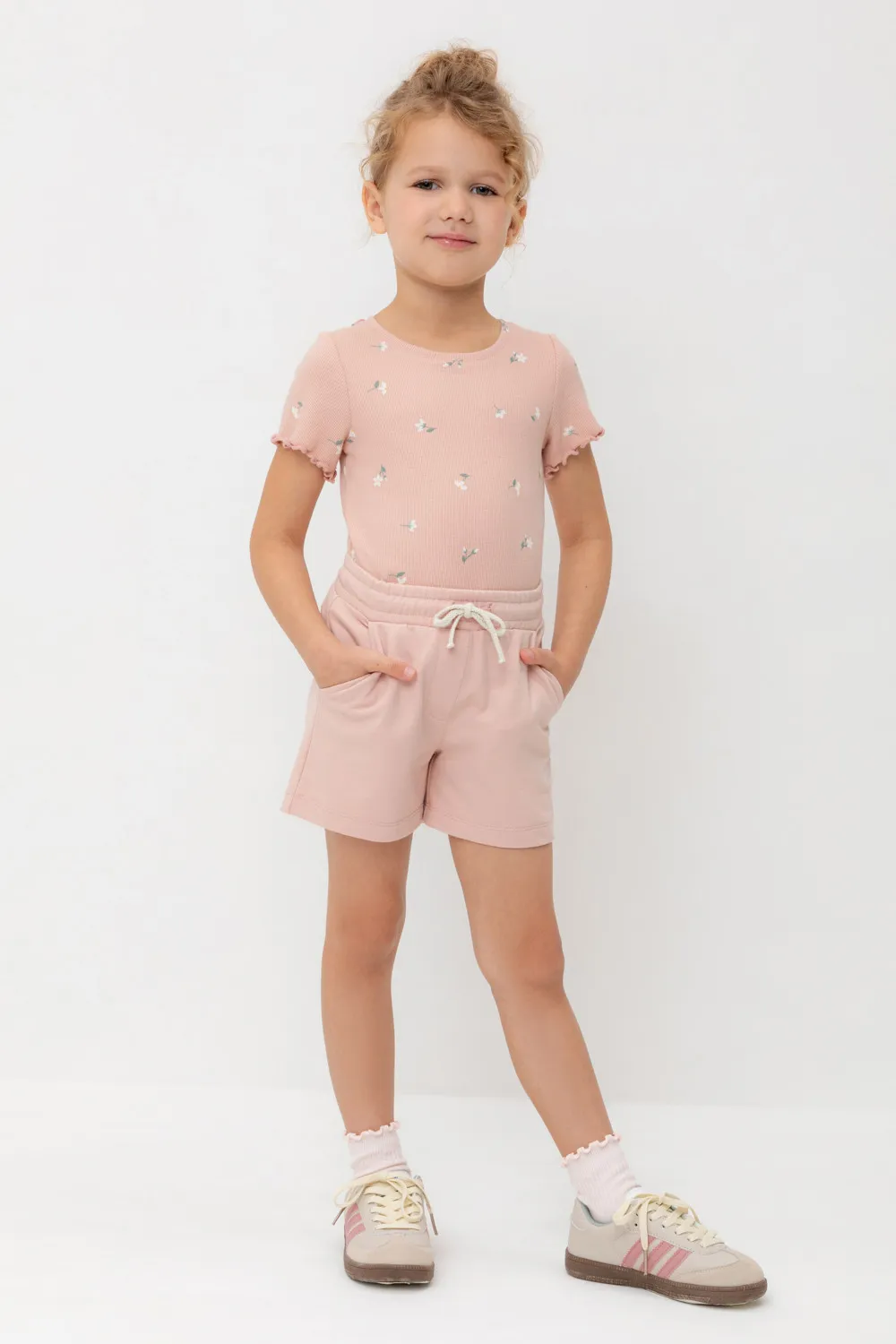 Трикотажные шорты для девочки из петельчатого футера. Эластичный пояс на резинке регулируется по ширине с помощью шнурка, по бокам два удобных кармана.