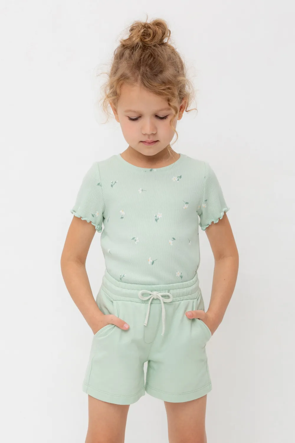 Трикотажные шорты для девочки из петельчатого футера. Эластичный пояс на резинке регулируется по ширине с помощью шнурка, по бокам два удобных кармана.