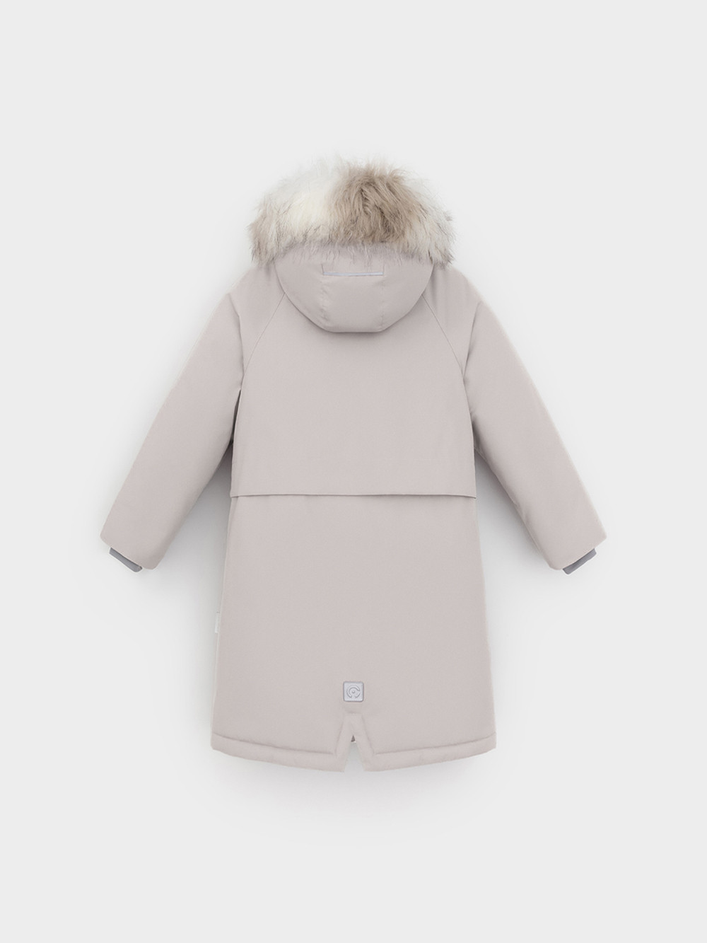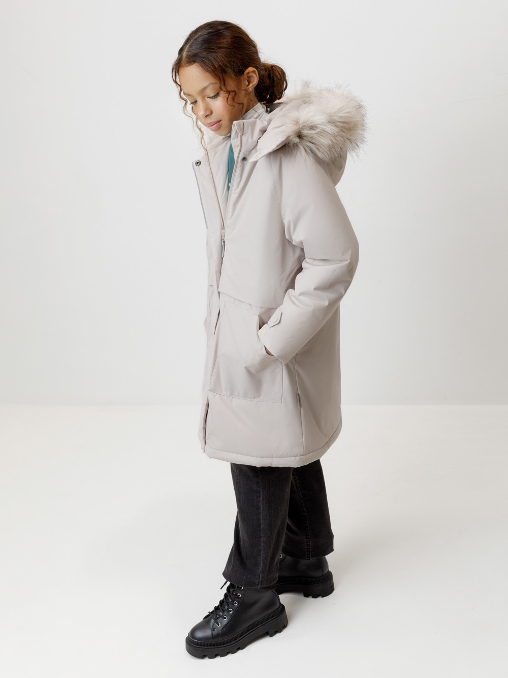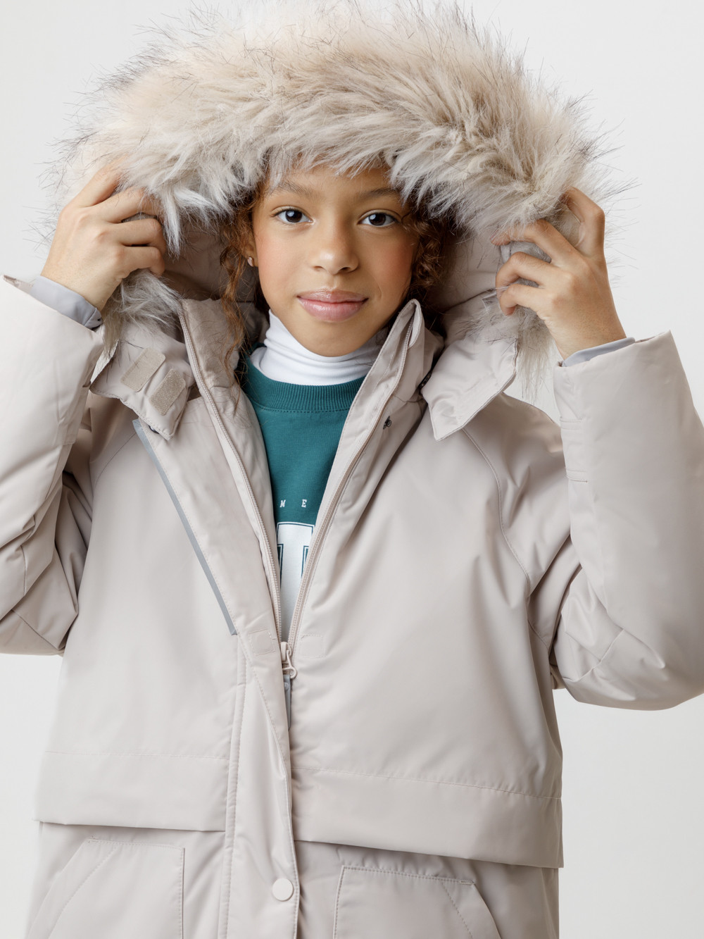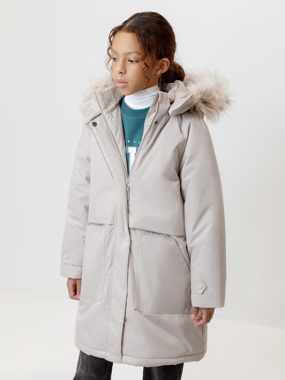 Зимняя удлинённая куртка для девочки с утеплителем SEE®: 250 г/м2. Выполнена из мембранной ткани с дополнительной тефлоновой обработкой, которая предохраняет изделие от загрязнений и отталкивает влагу. Подклад выполнен из 100% полиэстера Tricot. Куртка застёгивается на молнию, предусмотрена защита подбородка. Съёмный капюшон на кнопках и липучках имеет отстёгивающийся искусственный мех. На рукавах мягкие манжеты. По бокам два кармана с клапанами, внутри карман на молнии. По талии эластичная утяжка со стопперами для регулировки ширины пальто. Во всех изделиях верхнего ассортимента для безопасности ребёнка предусмотрены светоотражающие элементы.