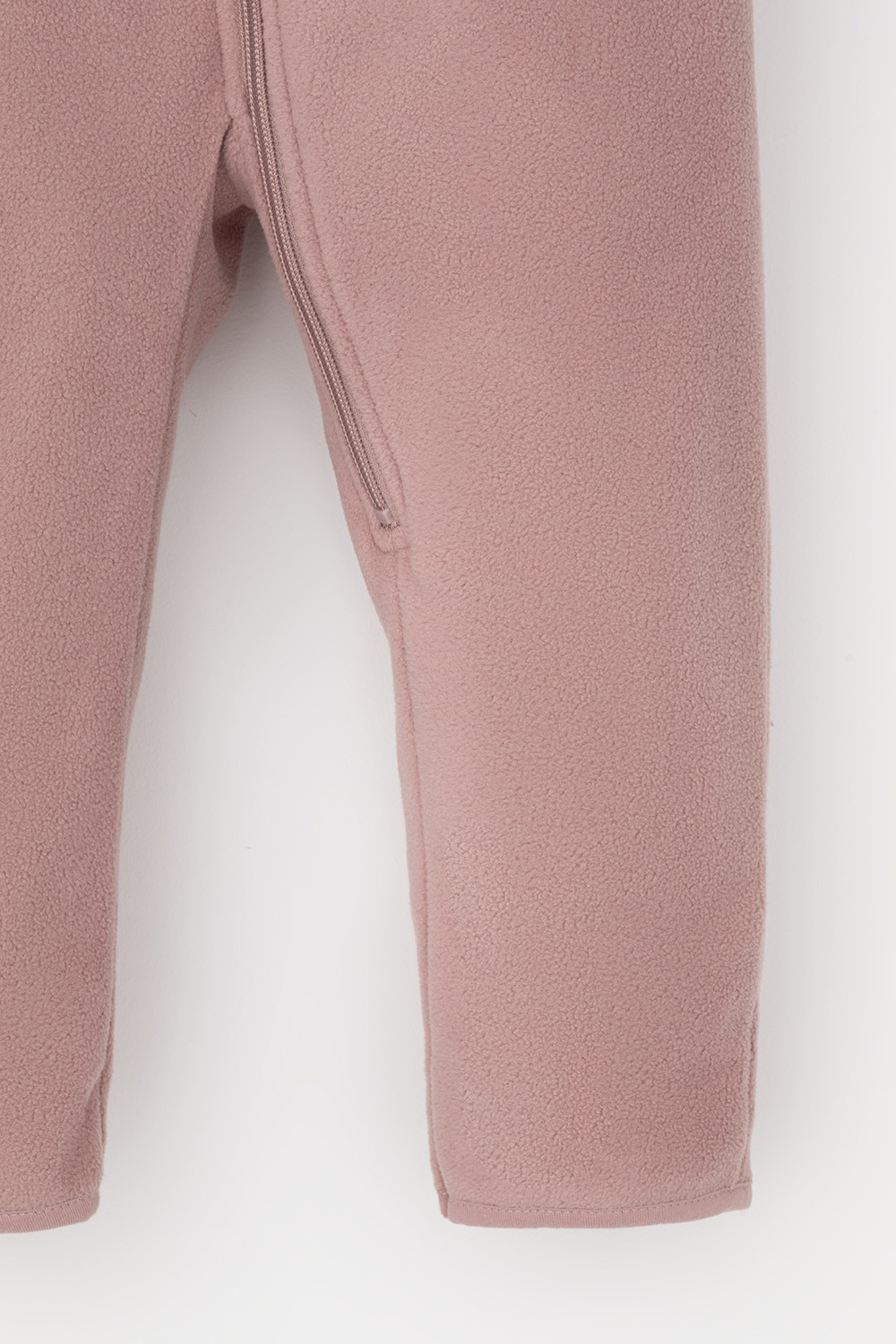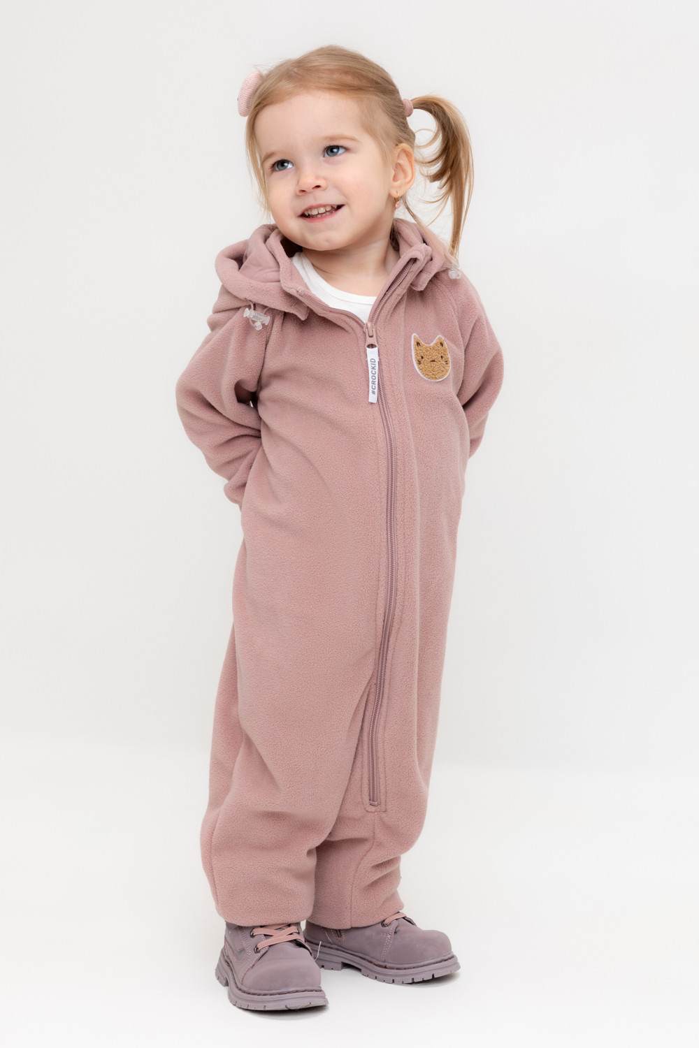 Флисовый комбинезон со съёмным капюшоном для девочки. У изделия высокий воротник и съёмный капюшон на кнопках. Застёгивается на удлинённую молнию. Предусмотрена защита шеи и подбородка. В размерах 40/62 - 48/74 на рукавах и штанинах есть удобные отвороты. Комбинезон сохраняет цвет и форму после многократных стирок.