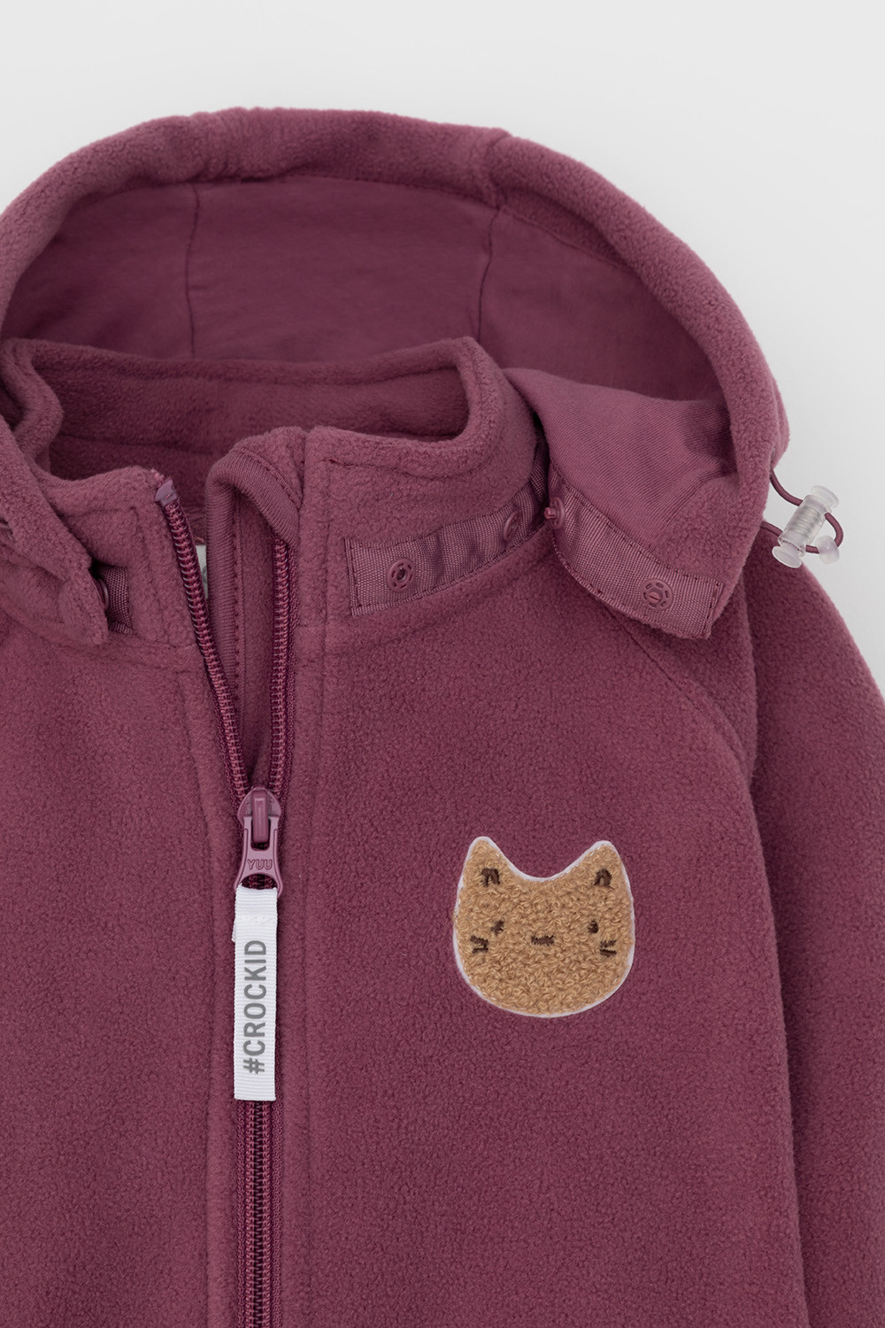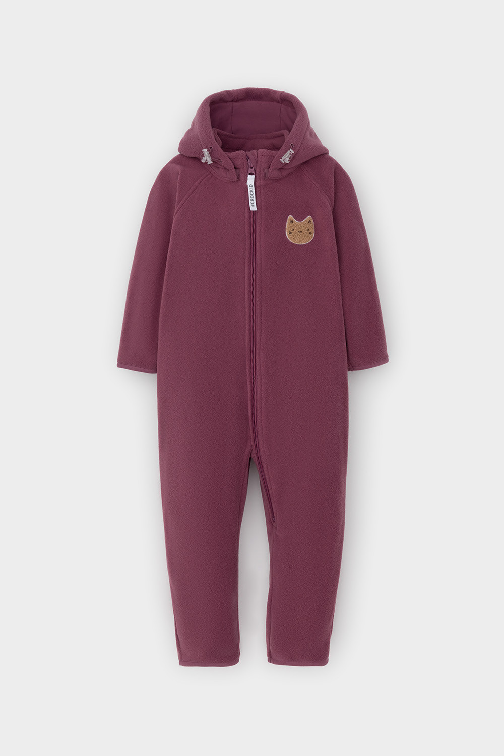 Флисовый комбинезон со съёмным капюшоном для девочки. У изделия высокий воротник и съёмный капюшон на кнопках. Застёгивается на удлинённую молнию. Предусмотрена защита шеи и подбородка. В размерах 40/62 - 48/74 на рукавах и штанинах есть удобные отвороты. Комбинезон сохраняет цвет и форму после многократных стирок.