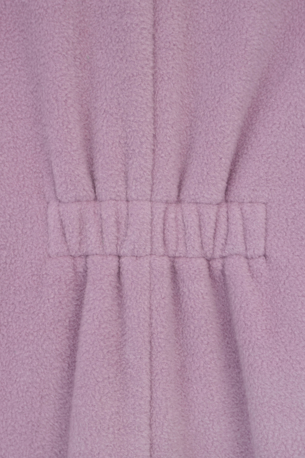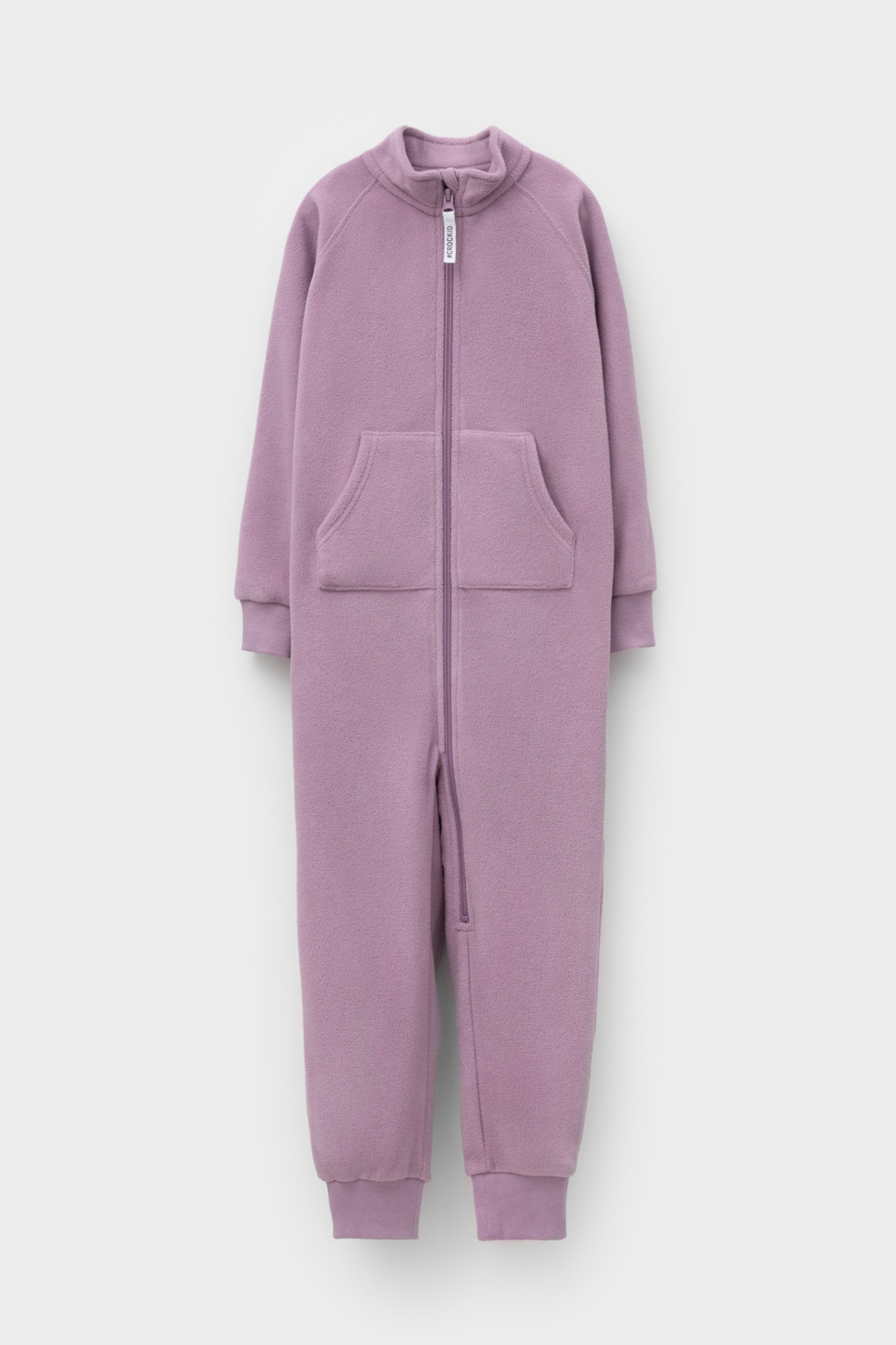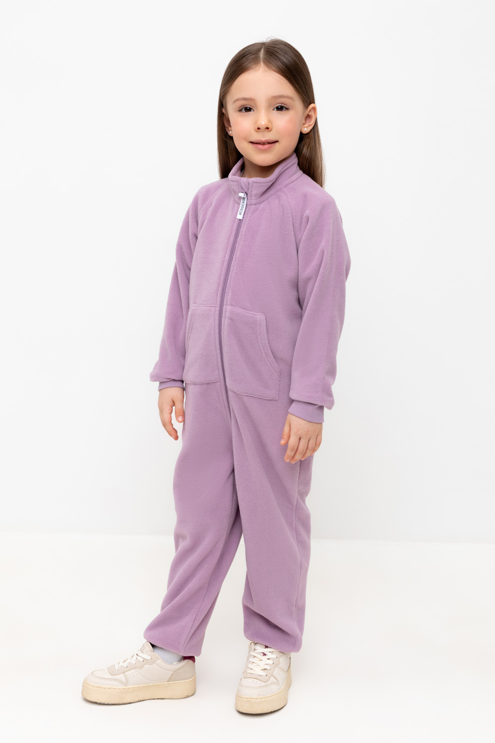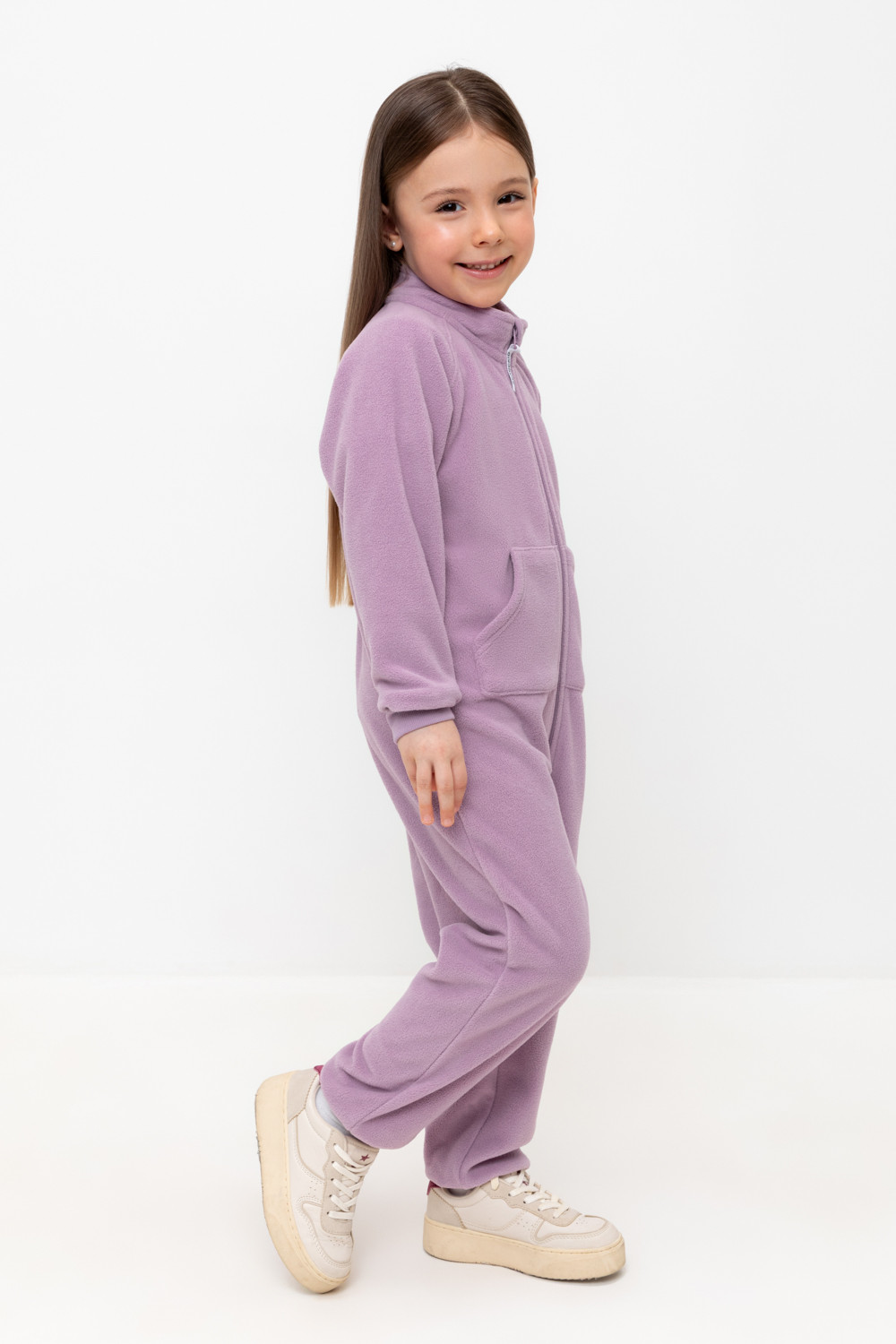Однотонный флисовый комбинезон для девочки с высоким воротником. Застёгивается на удлинённую молнию с мягкой защитой шеи и подбородка. Рукава и низ изделия на манжетах из трикотажа в рубчик. Эластичная резинка по спинке обеспечивает идеальную посадку. Спереди удобный карман-кенгуру. Комбинезон сохраняет цвет и форму после многократных стирок.