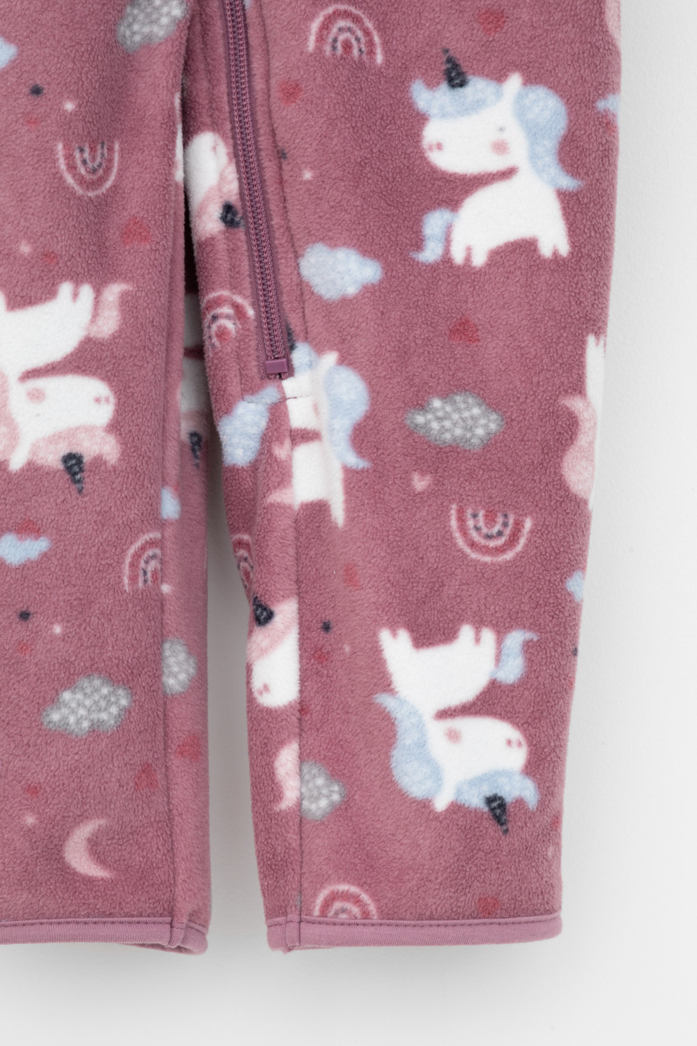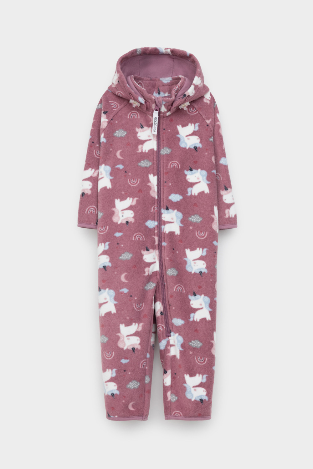 Флисовый комбинезон со съёмным капюшоном для девочки. У изделия высокий воротник и съёмный капюшон на кнопках с подкладом из супрема. Застёгивается на удлинённую молнию. Предусмотрена защита шеи и подбородка. В размерах 40/62 - 48/74 на рукавах и штанинах есть удобные отвороты. Оригинальная набивка выполнена из стойких, гипоаллергенных текстильных красителей. Комбинезон сохраняет цвет и форму после многократных стирок.