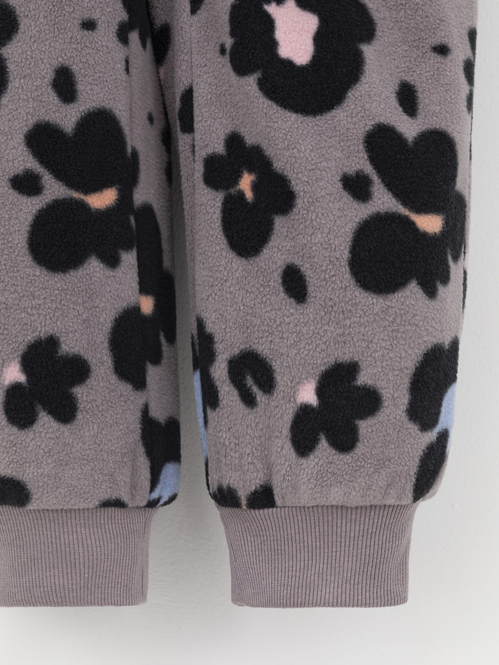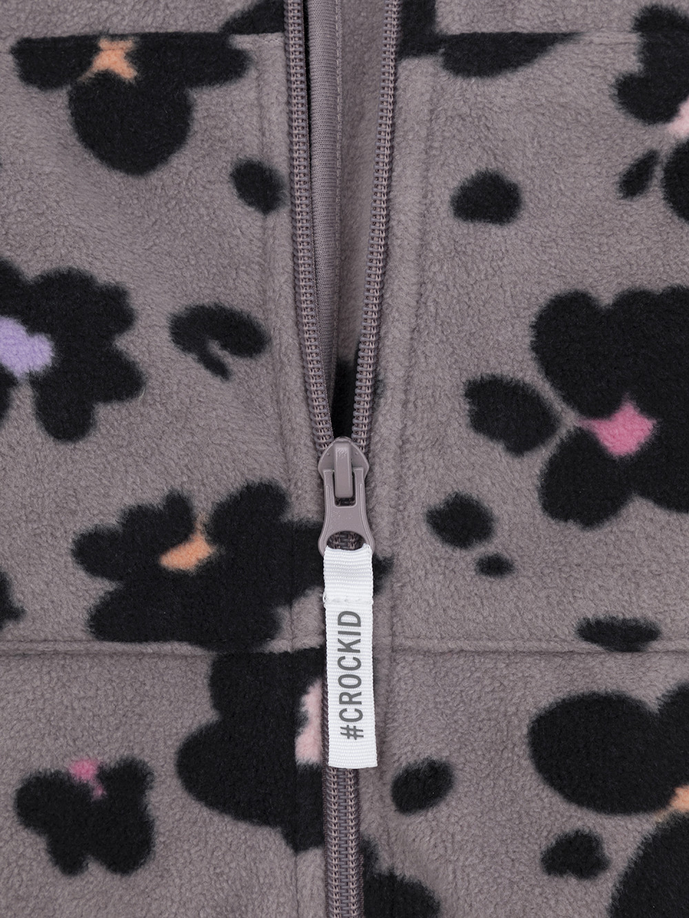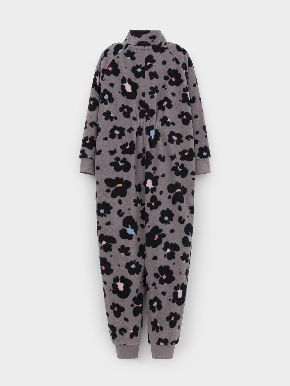 Флисовый комбинезон для девочки с высоким воротником. Застёгивается на удлинённую молнию с мягкой защитой шеи и подбородка. Рукава и низ изделия на манжетах из  трикотажа в рубчик. Эластичная резинка по спинке обеспечивает идеальную посадку. Спереди удобный карман-кенгуру. Оригинальная набивка выполнена из стойких гипоаллергенных текстильных красителей. Комбинезон сохраняет цвет и форму после многократных стирок.