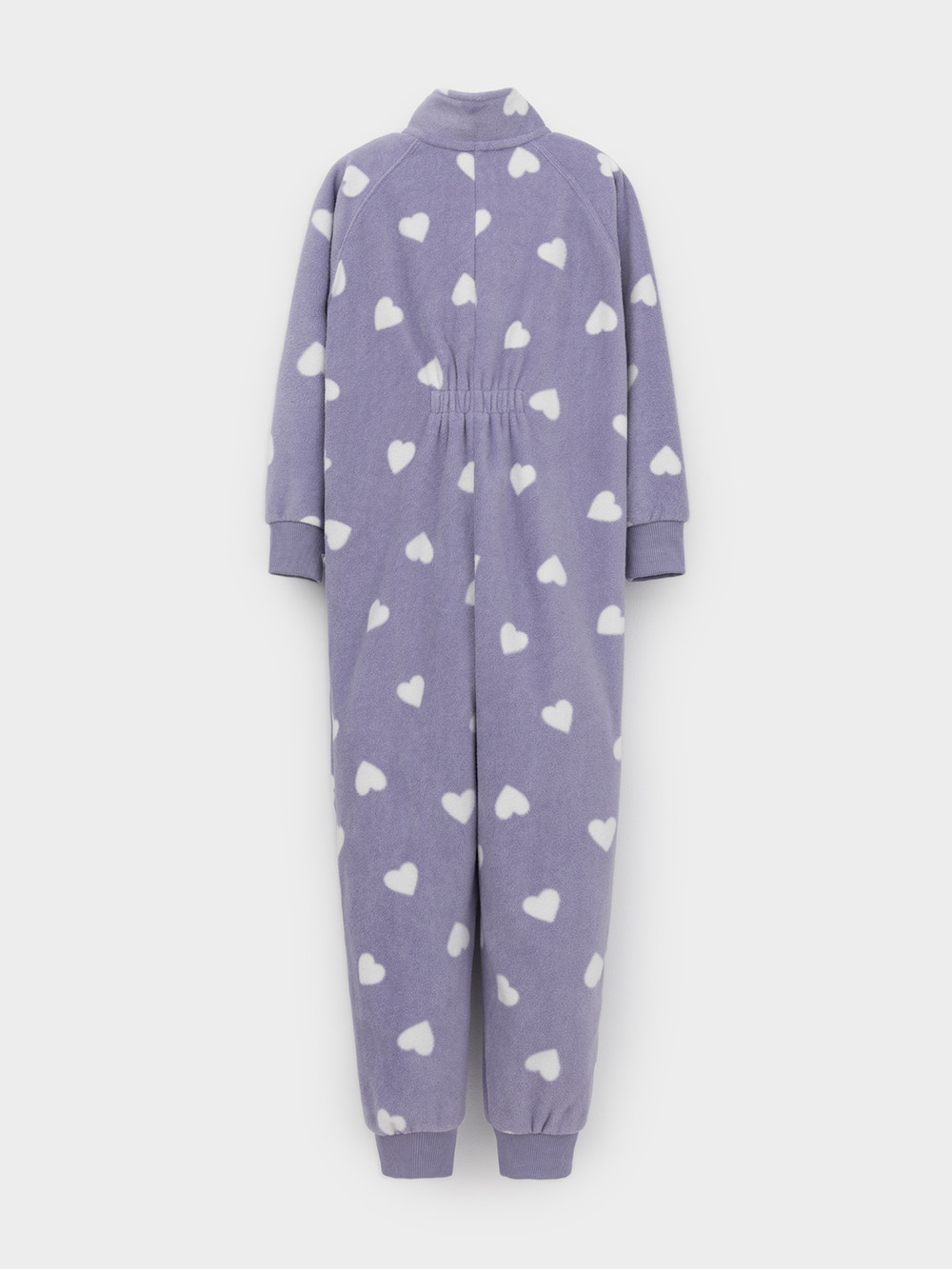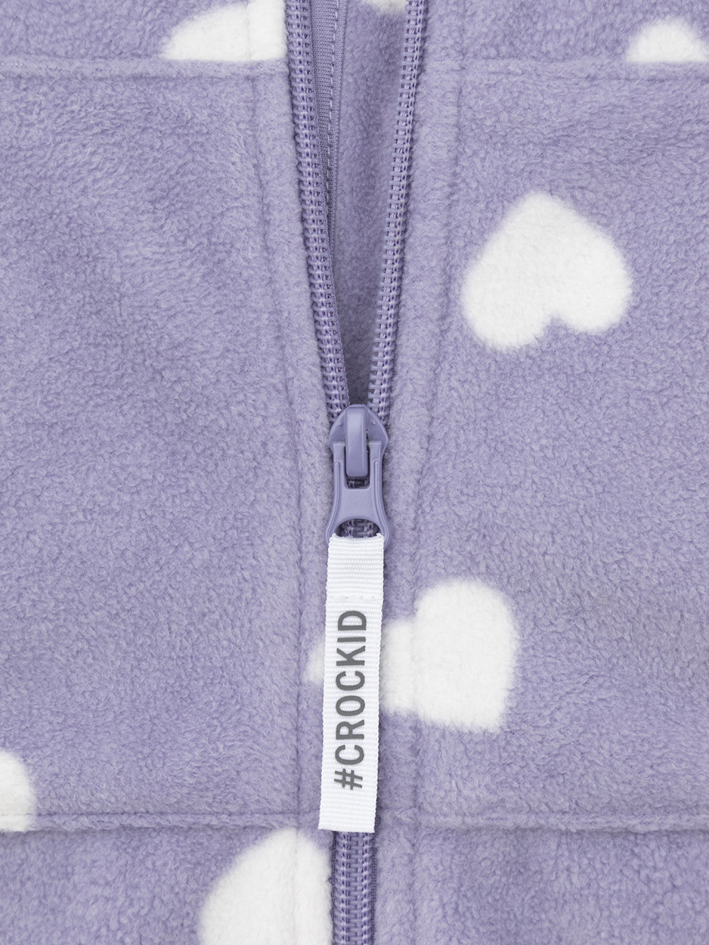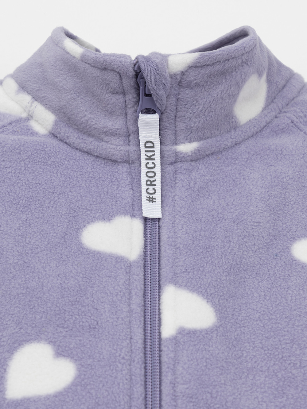 Флисовый комбинезон для девочки с высоким воротником. Застёгивается на удлинённую молнию с мягкой защитой шеи и подбородка. Рукава и низ изделия на манжетах из  трикотажа в рубчик. Эластичная резинка по спинке обеспечивает идеальную посадку. Спереди удобный карман-кенгуру. Оригинальная набивка выполнена из стойких гипоаллергенных текстильных красителей. Комбинезон сохраняет цвет и форму после многократных стирок.