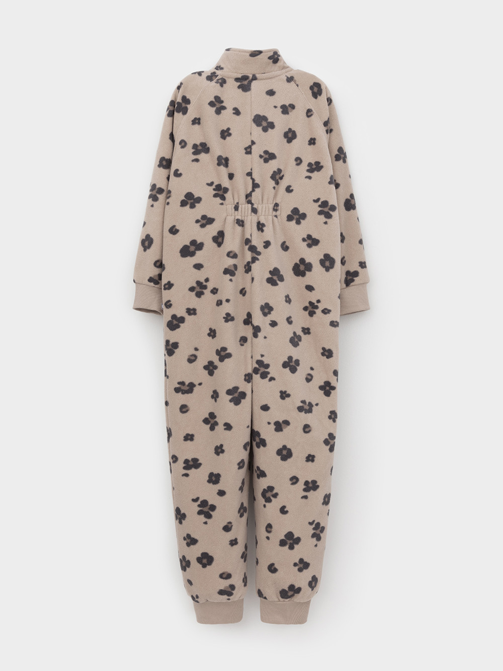 Флисовый комбинезон для девочки с высоким воротником. Застёгивается на удлинённую молнию с мягкой защитой шеи и подбородка. Рукава и низ изделия на манжетах из  трикотажа в рубчик. Эластичная резинка по спинке обеспечивает идеальную посадку. Спереди удобный карман-кенгуру. Оригинальная набивка выполнена из стойких гипоаллергенных текстильных красителей. Комбинезон сохраняет цвет и форму после многократных стирок.