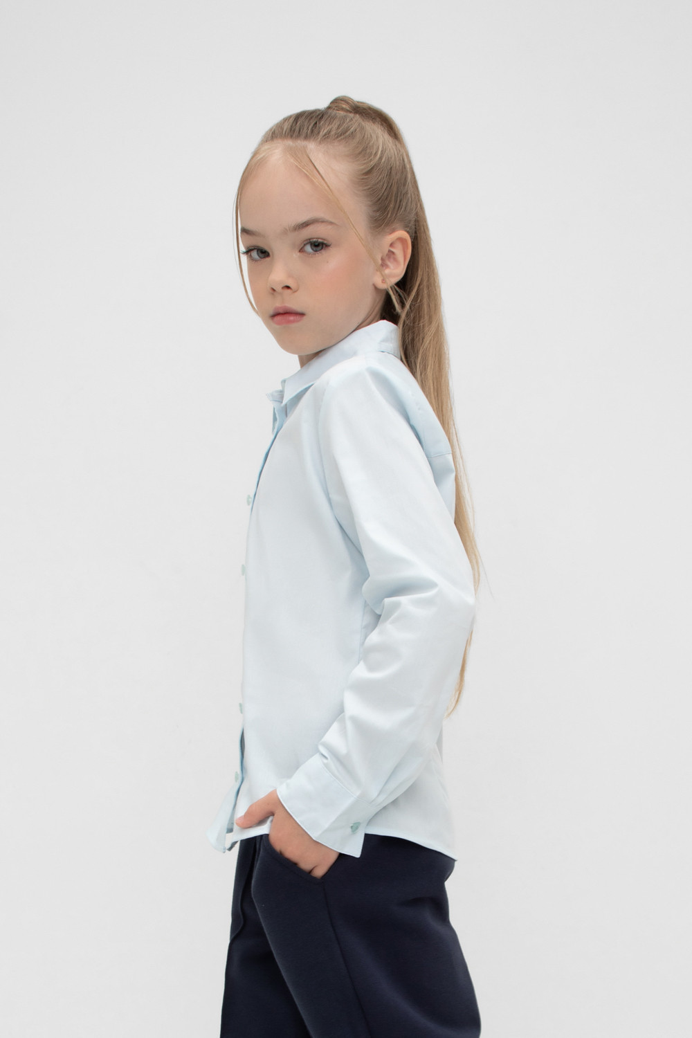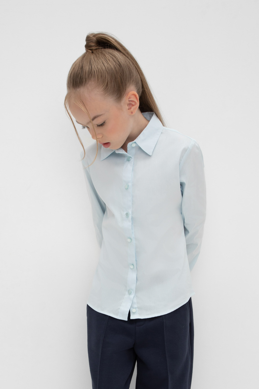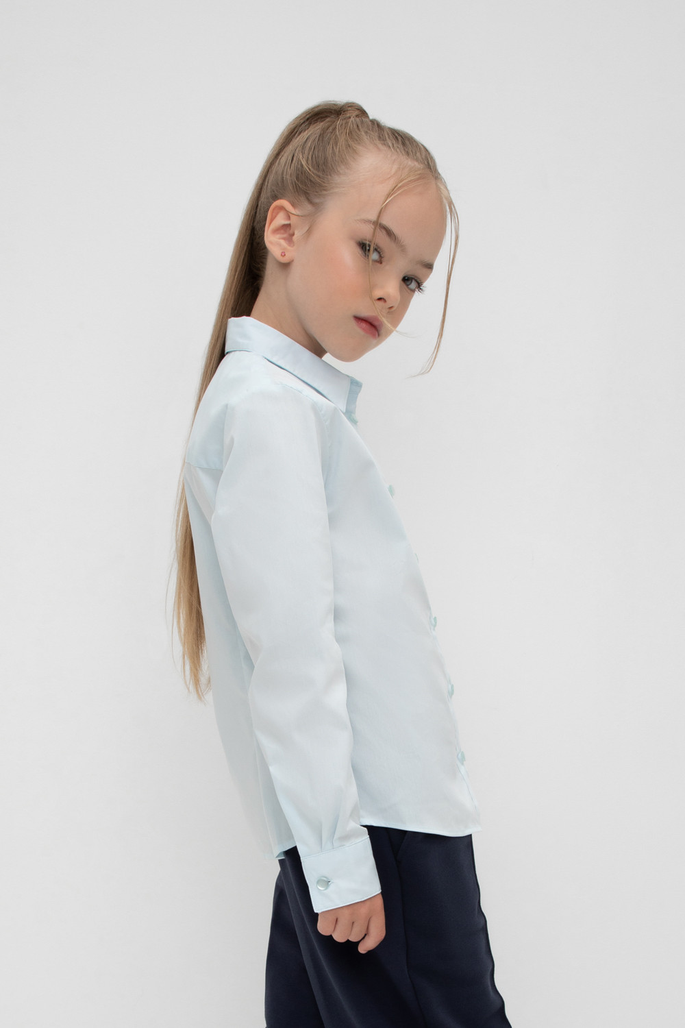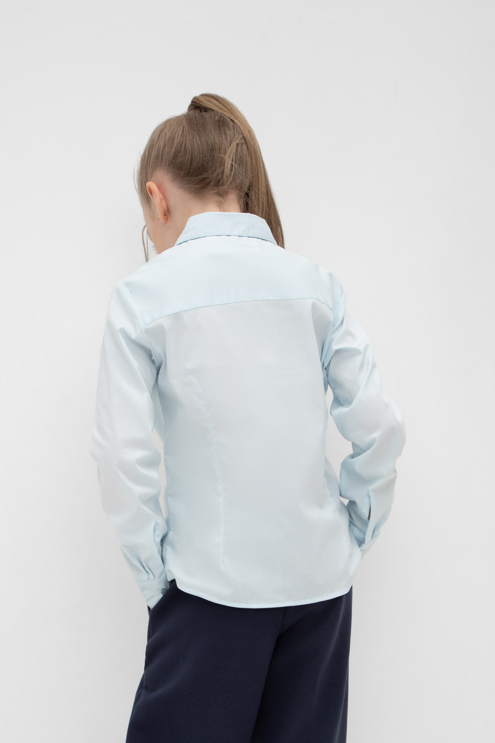Классическая блузка для девочки с отложным воротником. Застегивается спереди на планку с пуговицами. Длинные втачанные рукава с манжетами регулируются по ширине.