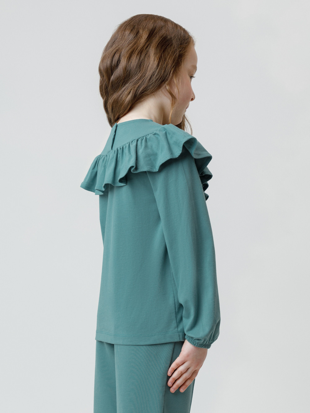 Блузка с воланом для девочки. Изготовлена из высококачественного трикотажного полотна и украшена вышивкой на груди. Блузка сохраняет форму и стойкий цвет после многочисленных стирок и идеально подходит на каждый день. Все трикотажные полотна производятся в соответствии с нормами швейцарского сертификата ЭкоТекс.