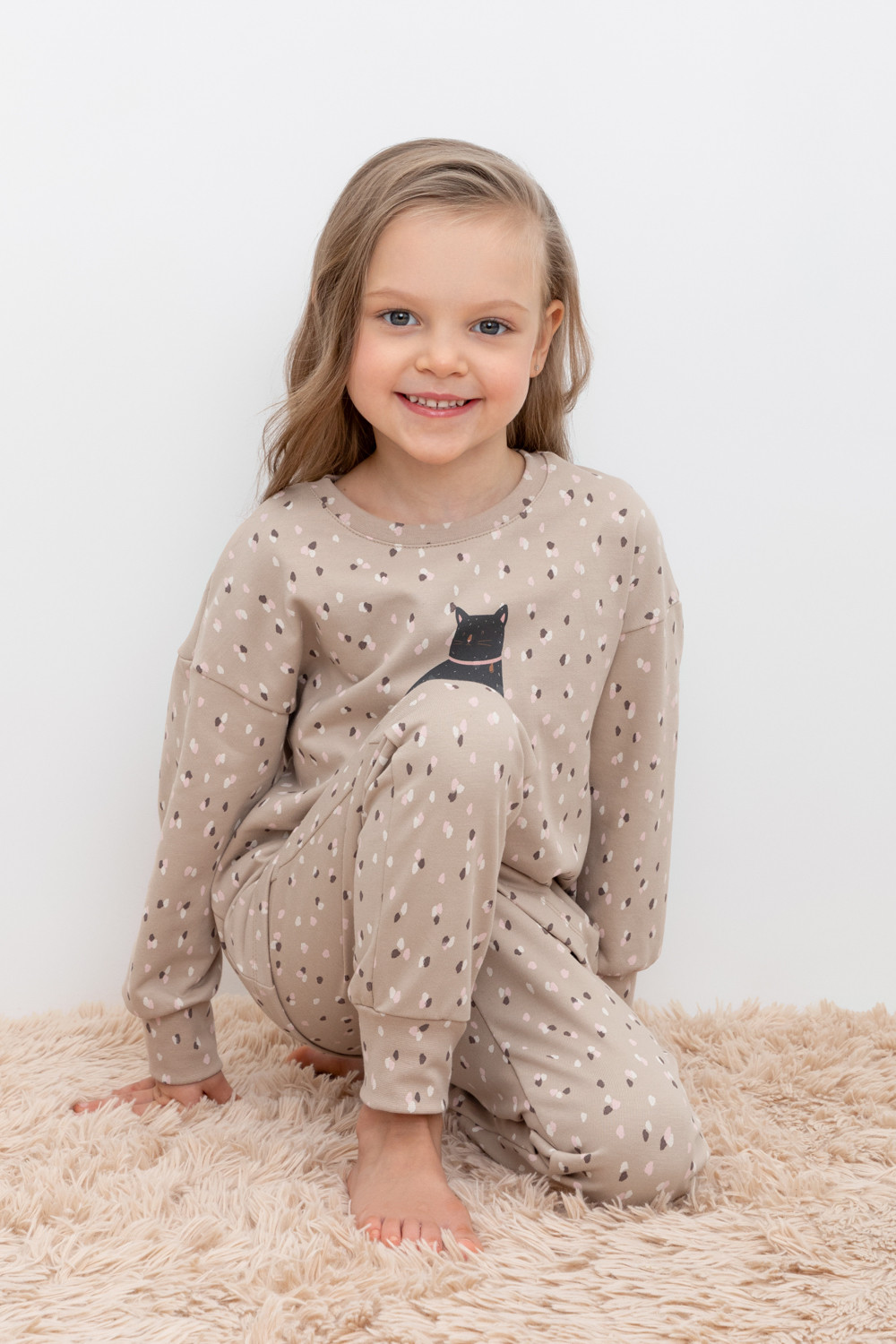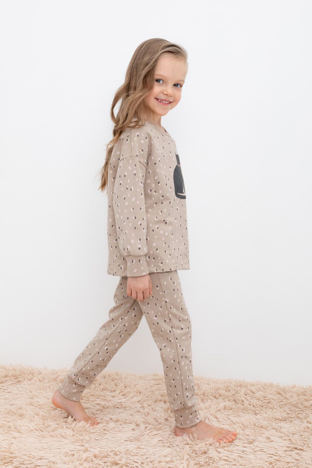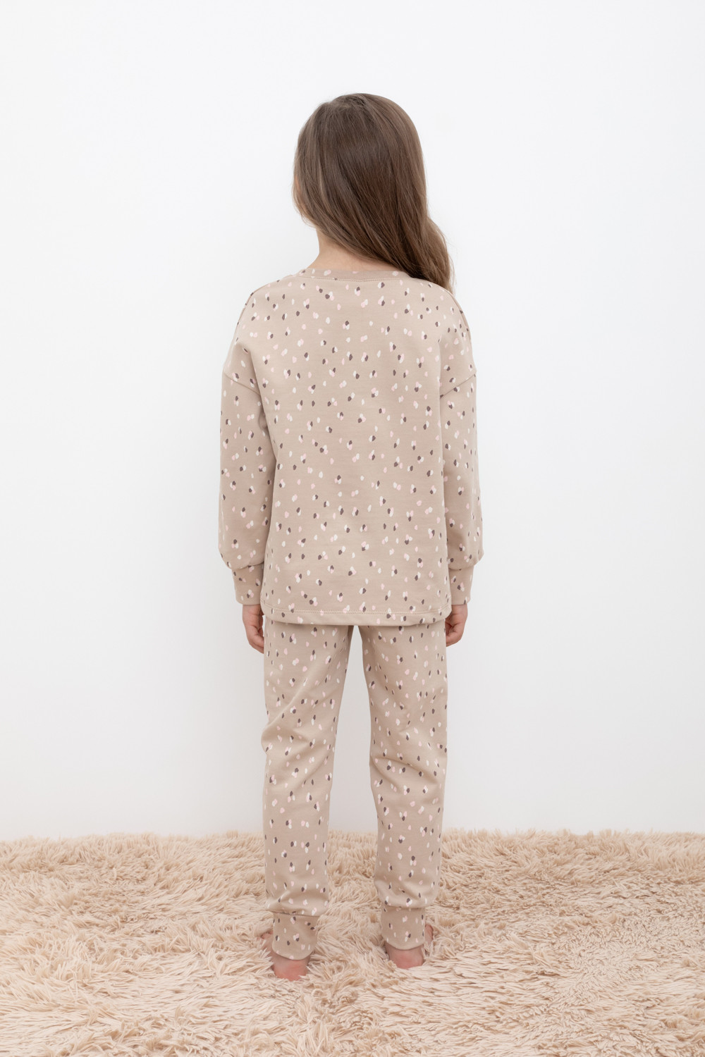 Трикотажный пижамный комплект из футера петли, произведённого из натурального хлопка. У джемпера длинные рукава со спущенными плечами и эластичная мягкая горловина и манжеты. Брюки с удобным поясом на резинке, внизу манжеты. Оригинальная набивка и принт выполнены из стойких, гипоаллергенных текстильных красителей. Все трикотажные полотна производятся в соответствии с нормами Швейцарского сертификата ЭкоТекс.