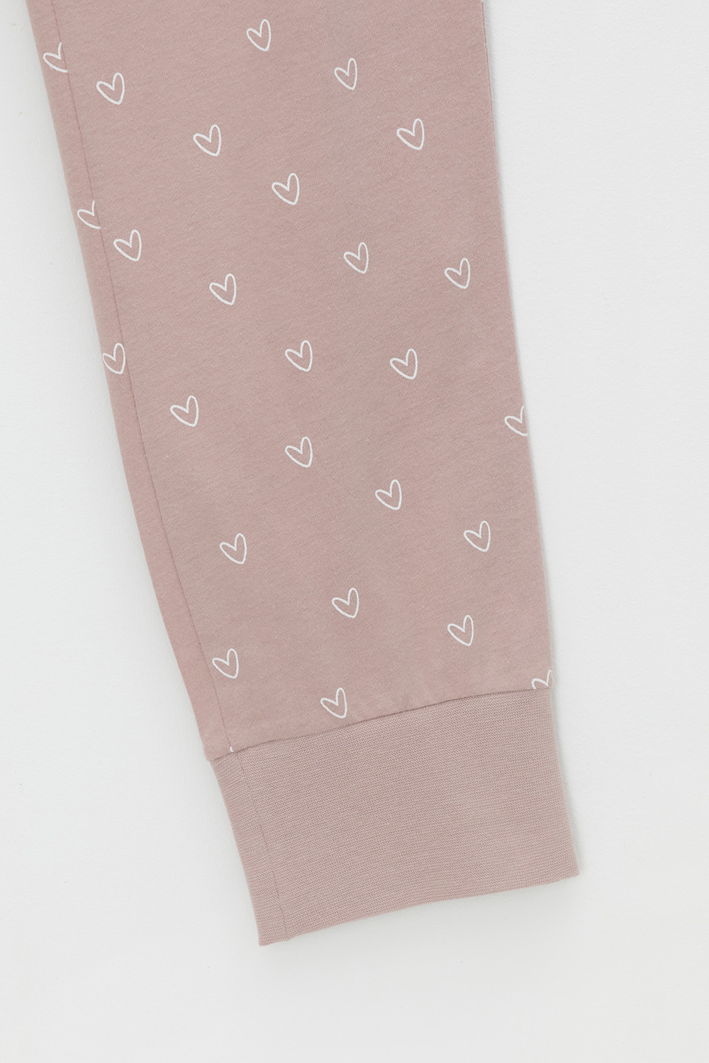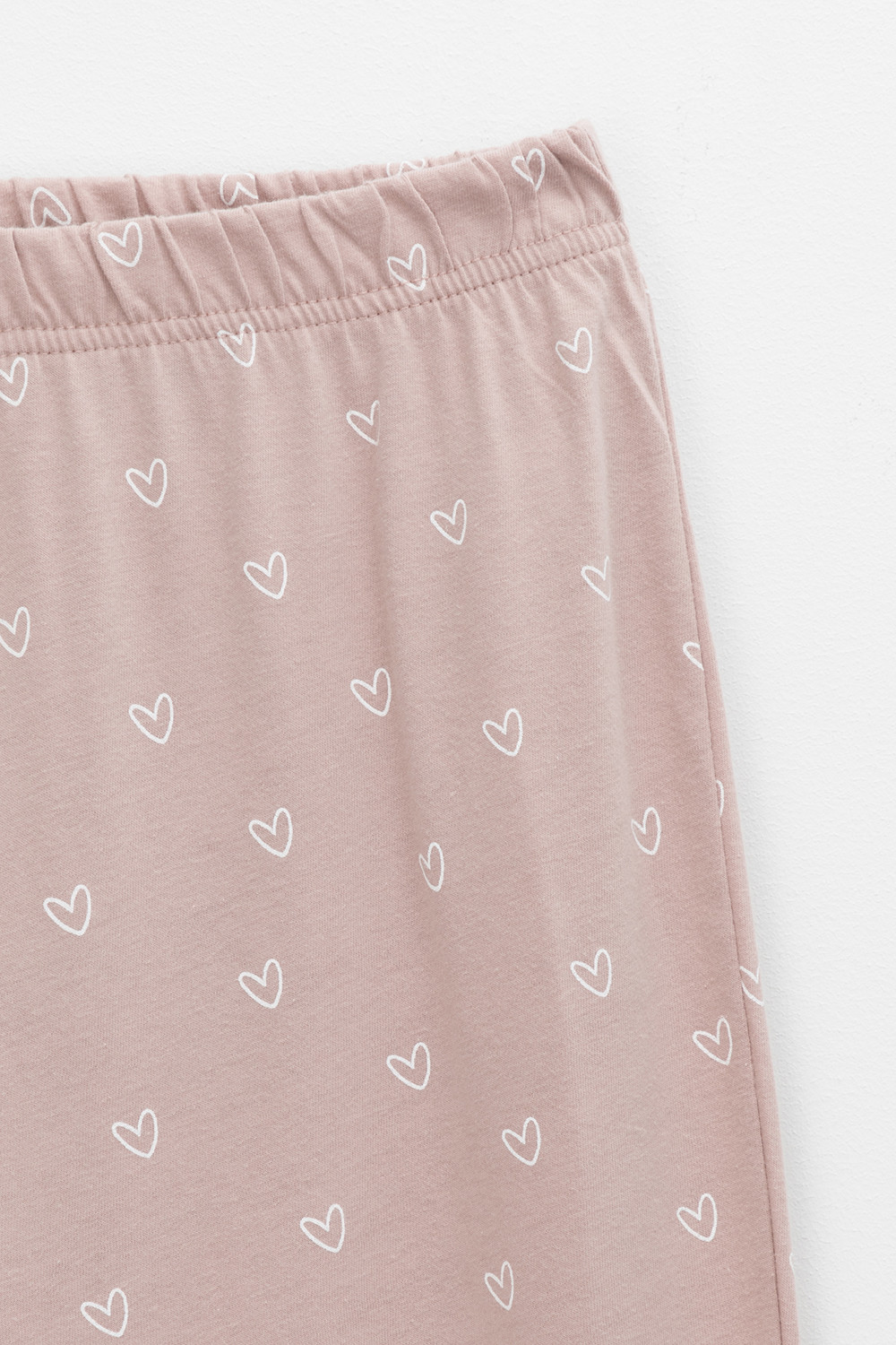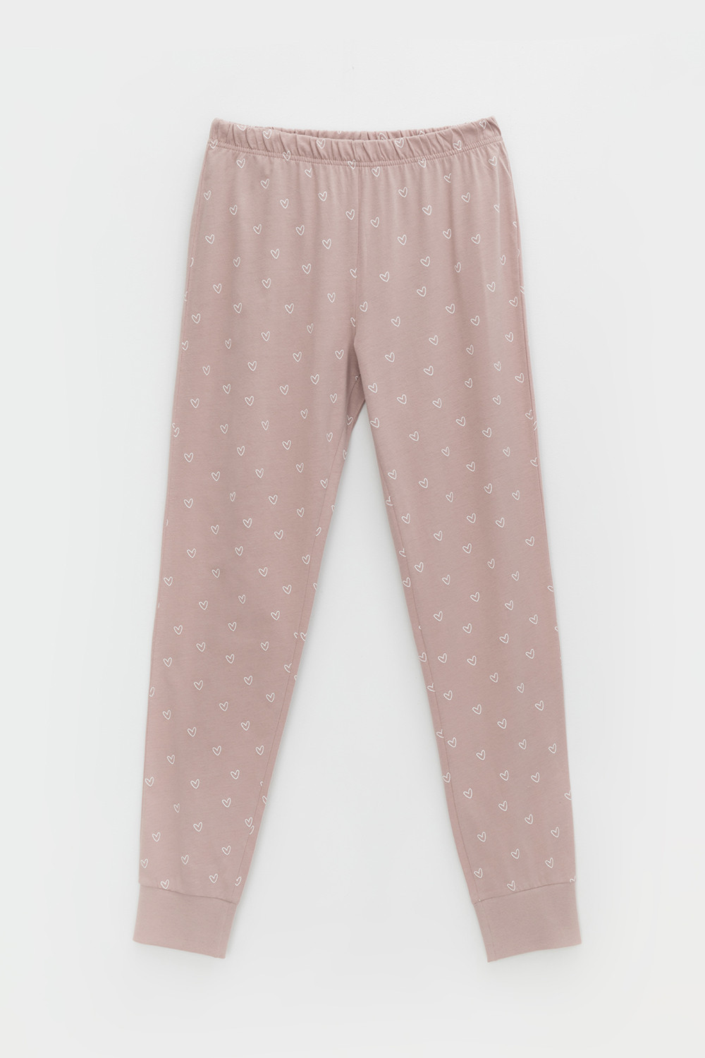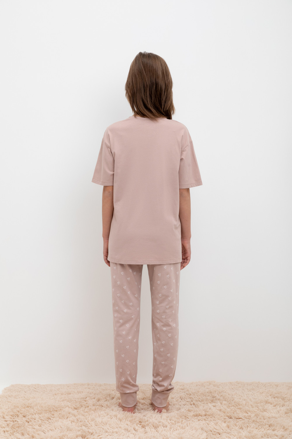 Трикотажный пижамный комплект из натурального хлопка. У футболки короткие рукава со спущенными плечами. Брюки с удобным поясом на резинке и эластичными манжетами. Оригинальная набивка и принт выполнены из стойких, гипоаллергенных текстильных красителей. Все трикотажные полотна производятся в соответствии с нормами Швейцарского сертификата ЭкоТекс.