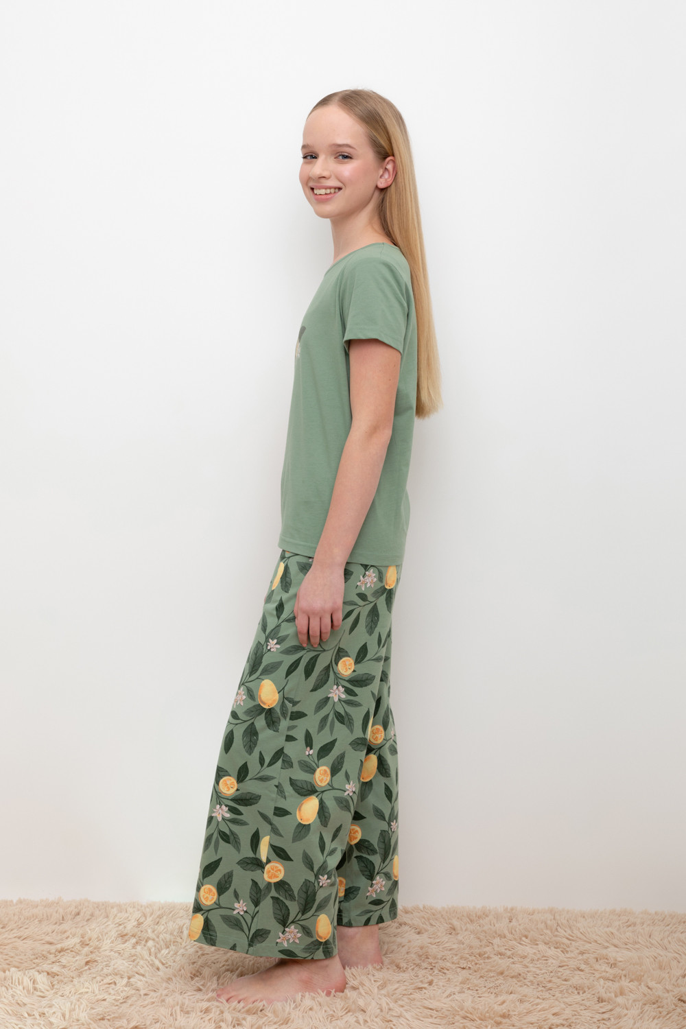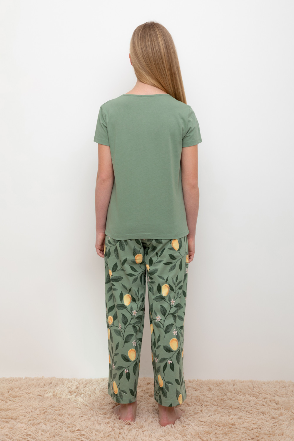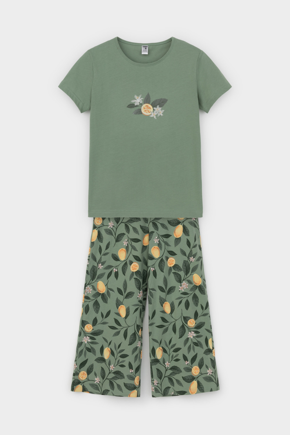 Трикотажный пижамный комплект из натурального хлопка. В комплекте футболка с короткими рукавами и  со спущенными плечами. Укороченные брюки с удобным поясом на резинке. Оригинальная набивка и принт выполнены из стойких, гипоаллергенных текстильных красителей. Все трикотажные полотна производятся в соответствии с нормами Швейцарского сертификата ЭкоТекс.