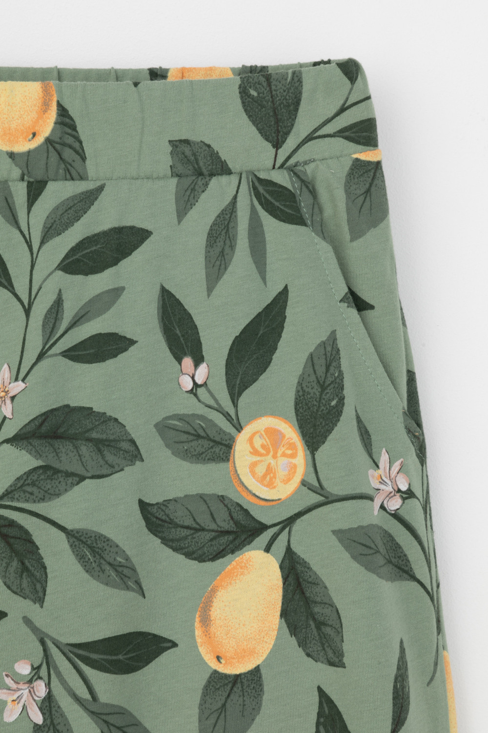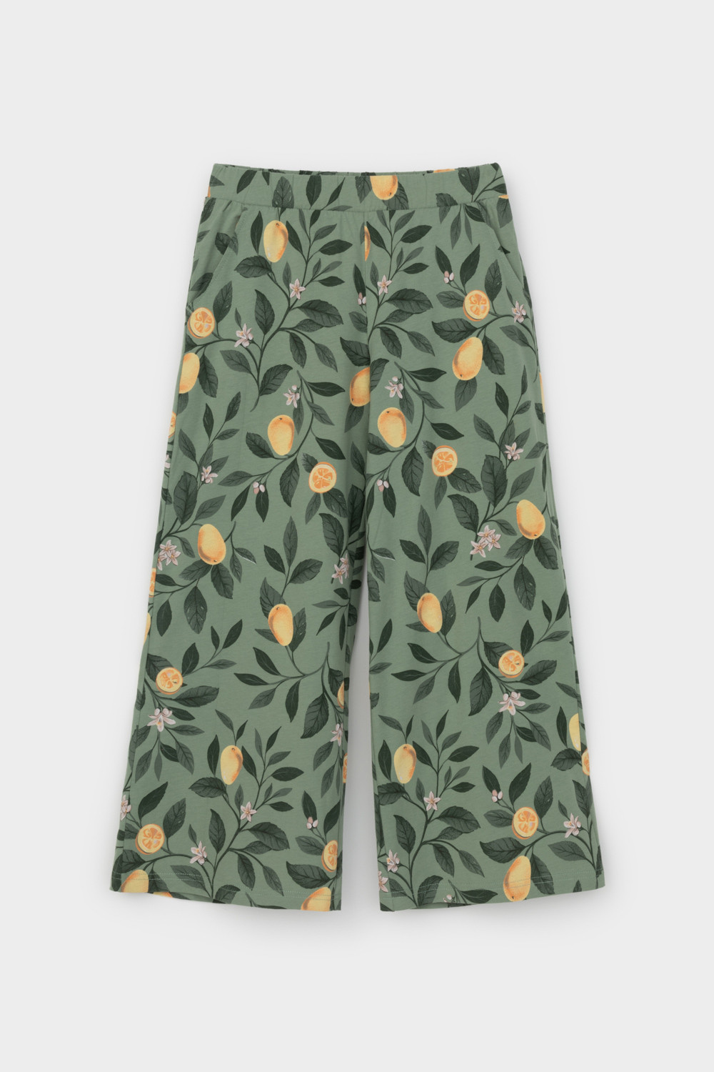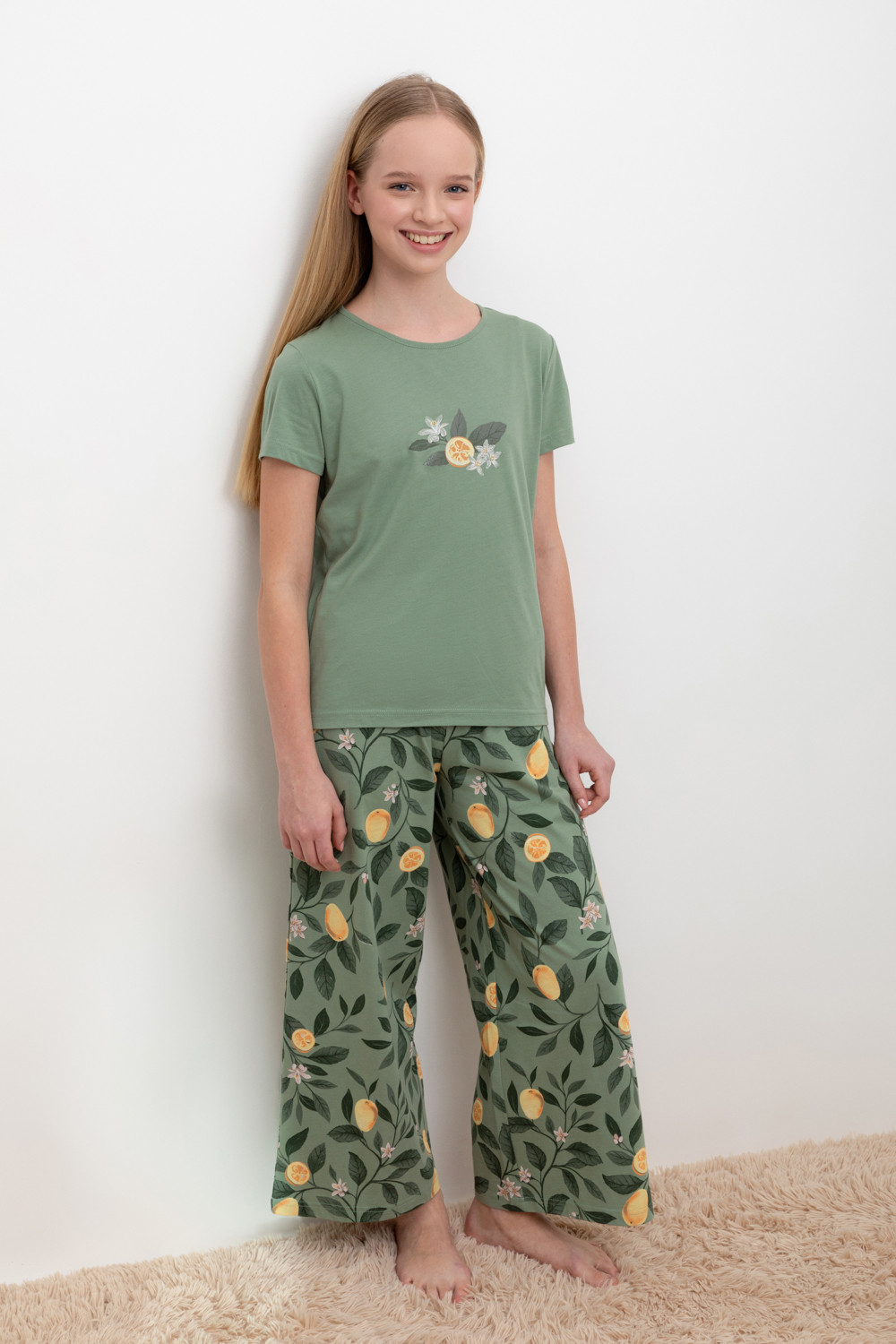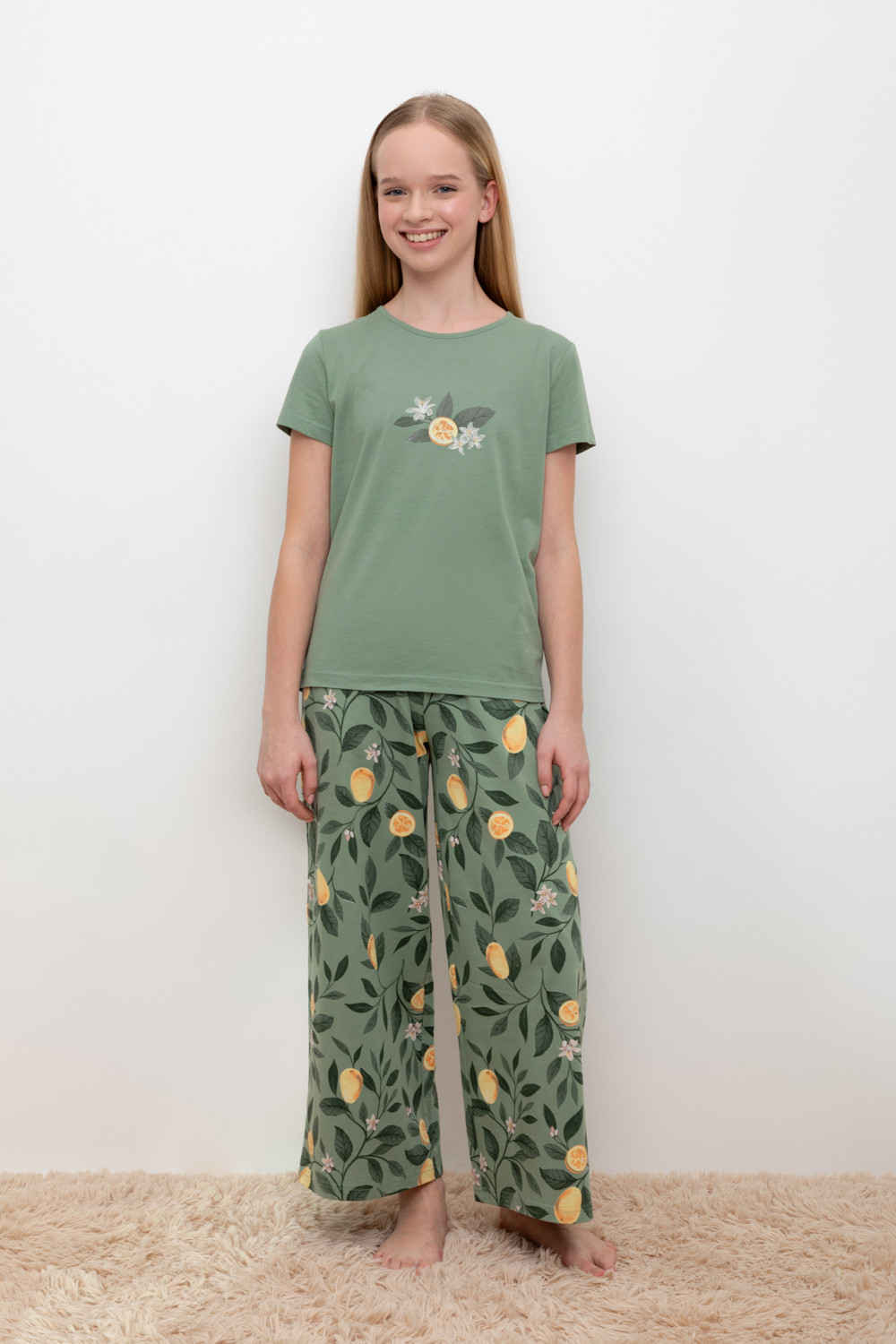 Трикотажный пижамный комплект из натурального хлопка. В комплекте футболка с короткими рукавами и  со спущенными плечами. Укороченные брюки с удобным поясом на резинке. Оригинальная набивка и принт выполнены из стойких, гипоаллергенных текстильных красителей. Все трикотажные полотна производятся в соответствии с нормами Швейцарского сертификата ЭкоТекс.