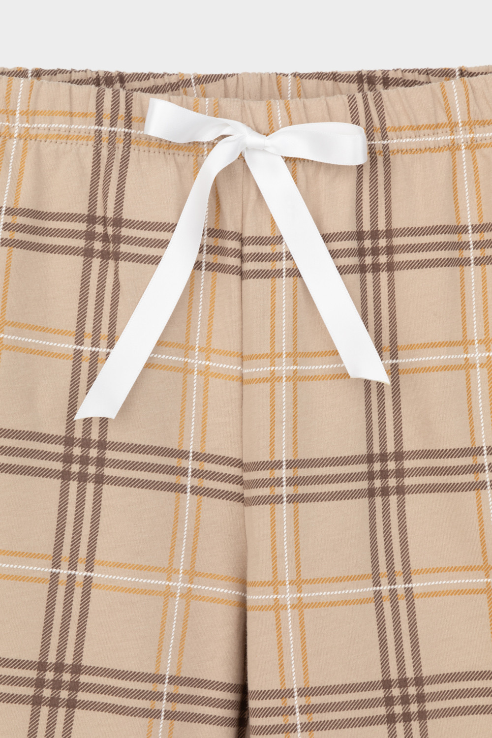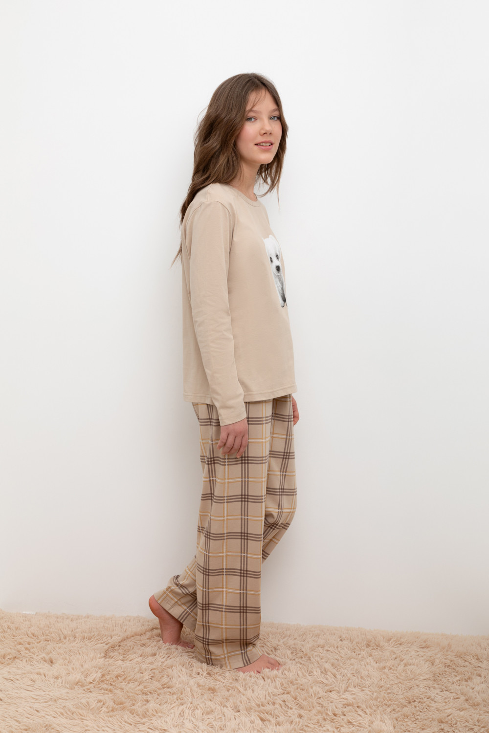 Трикотажный пижамный комплект из натурального хлопка. У джемпера длинные втачные рукава. Брюки с удобным поясом на резинке и атласной лентой . Оригинальная набивка и принт выполнены из стойких, гипоаллергенных текстильных красителей. Все трикотажные полотна производятся в соответствии с нормами Швейцарского сертификата ЭкоТекс.