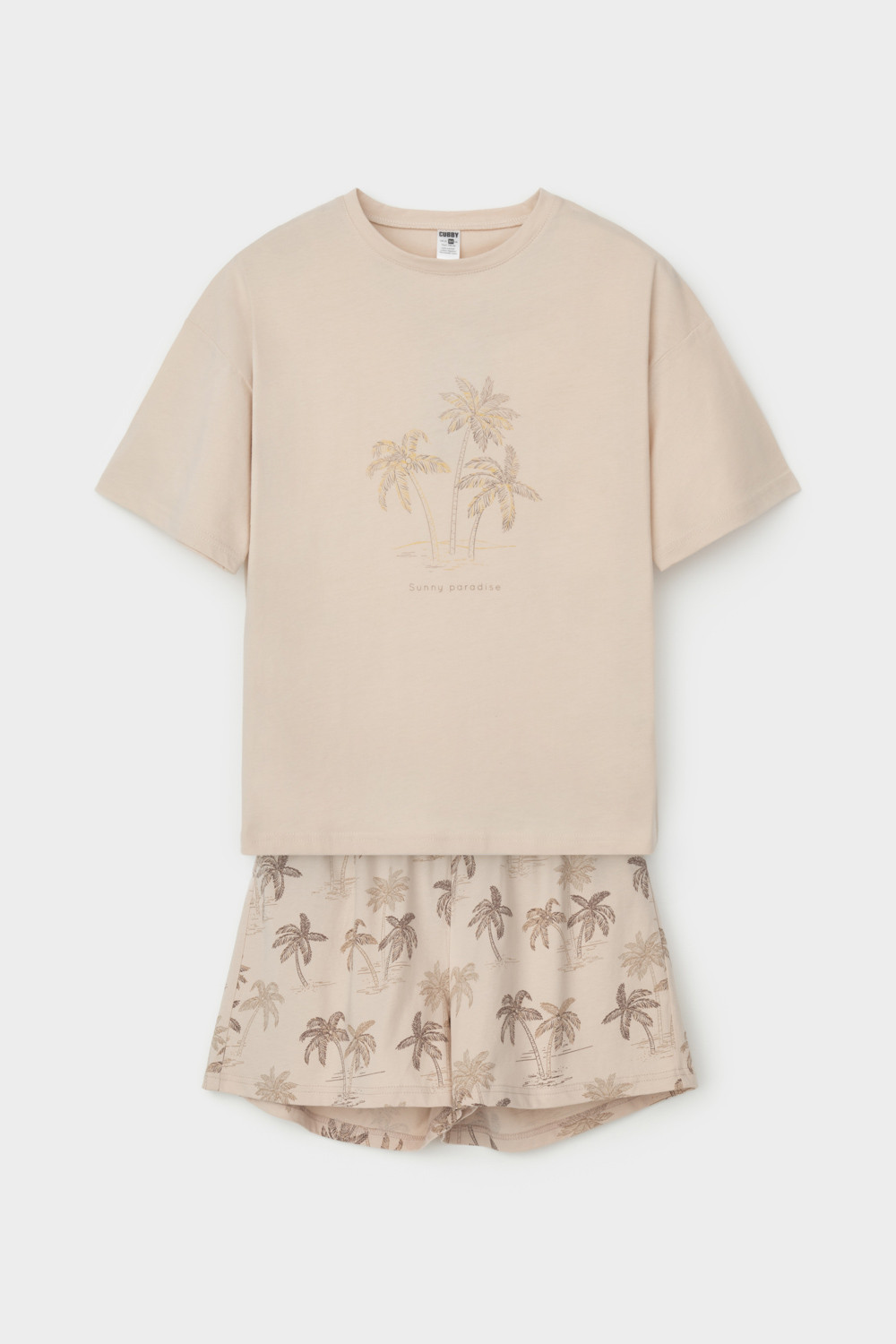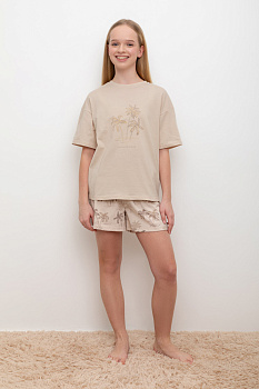 Трикотажный пижамный комплект из натурального хлопка. У футболки короткие рукава со спущенными плечами. Шорты с поясом на резинке. Оригинальная набивка выполнена из стойких, гипоаллергенных текстильных красителей. Все трикотажные полотна производятся в соответствии с нормами Швейцарского сертификата ЭкоТекс.