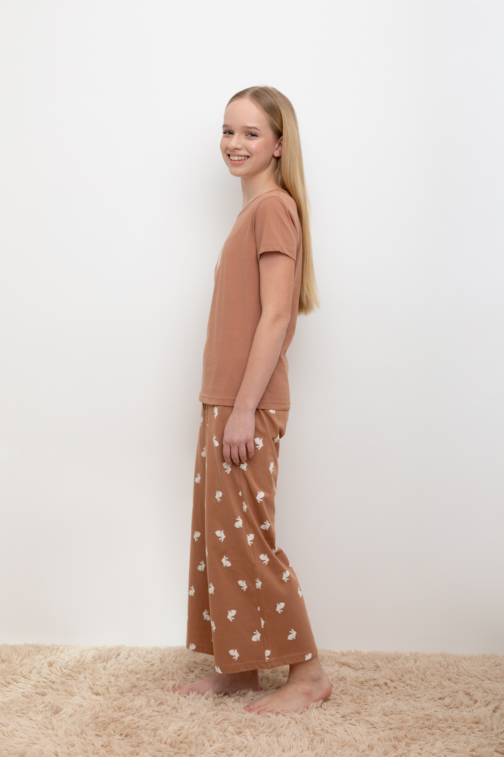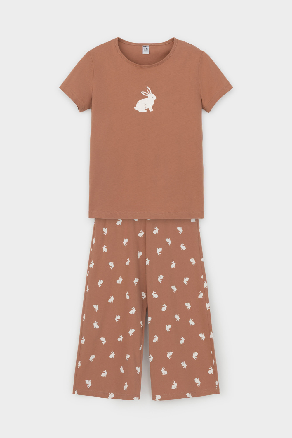 Трикотажный пижамный комплект из натурального хлопка. В комплекте футболка с короткими рукавами и  со спущенными плечами. Укороченные брюки с удобным поясом на резинке. Оригинальная набивка и принт выполнены из стойких, гипоаллергенных текстильных красителей. Все трикотажные полотна производятся в соответствии с нормами Швейцарского сертификата ЭкоТекс.