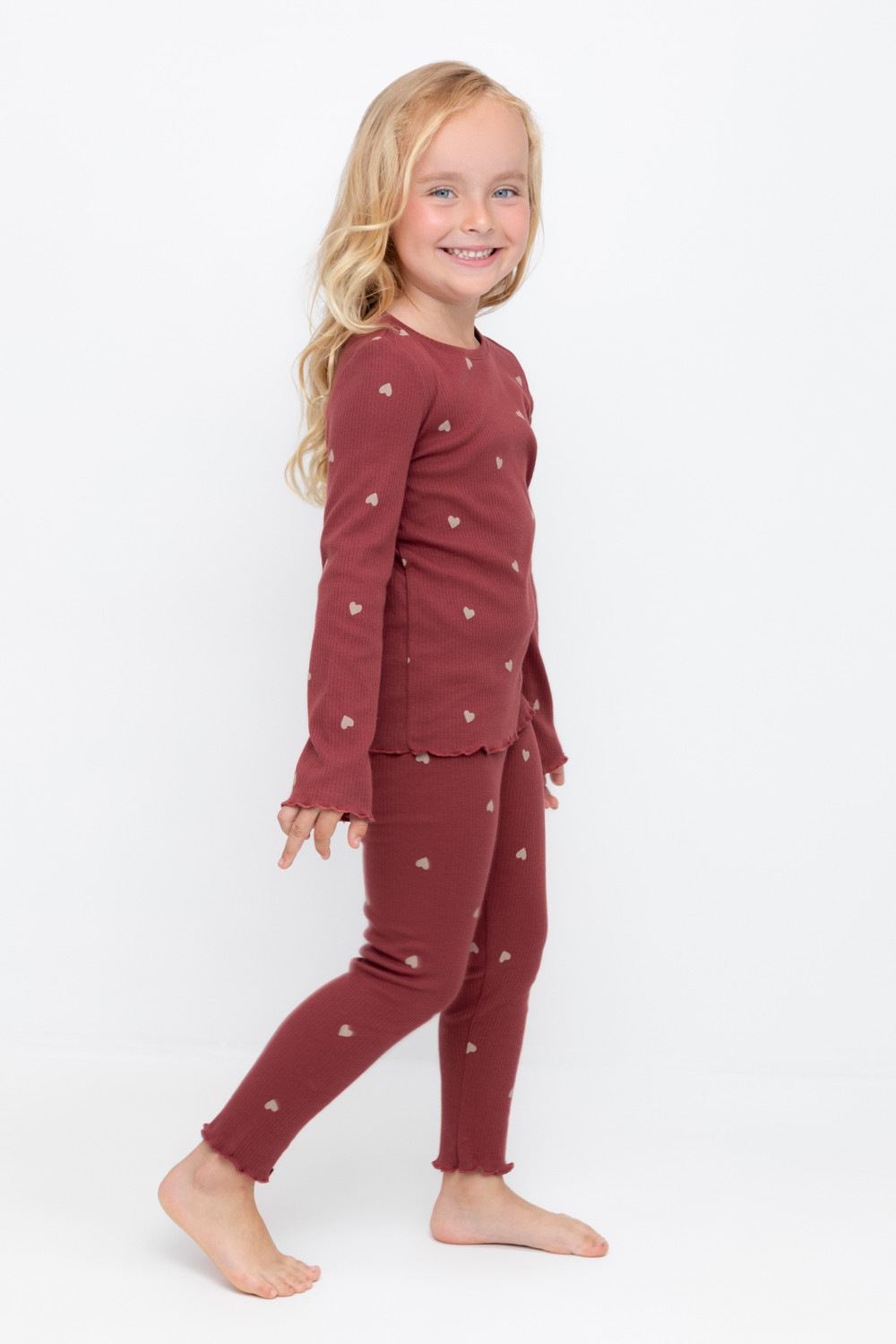 Трикотажная пижама в рубчик из натурального хлопка. Джемпер с длинными втачными рукавами и лосины с эластичной резинкой в поясе. Оригинальная набивка выполнена из стойких текстильных гипоаллергенных красителей. Изделие сохраняет цвет и форму после многократных стирок. Все трикотажные полотна производятся в соответствии с нормами швейцарского сертификата ЭкоТекс.
