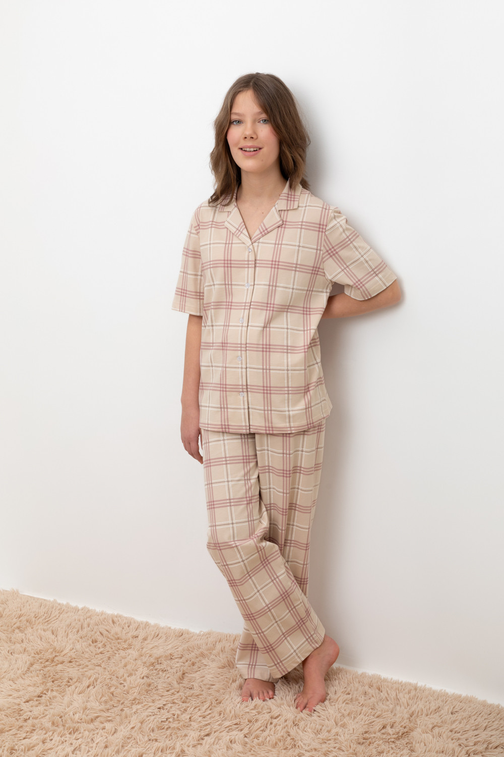 Трикотажный пижамный комплект из натурального хлопка. В комплекте рубашка с короткими рукавами и  застежкой на пуговицы. Прямые  брюки с удобным поясом на резинке. Оригинальная набивка выполнена из стойких, гипоаллергенных текстильных красителей. Все трикотажные полотна производятся в соответствии с нормами Швейцарского сертификата ЭкоТекс.