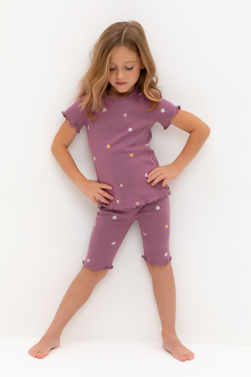 Трикотажная пижама в рубчик из натурального хлопка. Футболка с короткими втачными рукавами и шорты с эластичной резинкой в поясе. Оригинальная набивка выполнена из стойких текстильных гипоаллергенных красителей. Изделие сохраняет цвет и форму после многократных стирок. Все трикотажные полотна производятся в соответсвии с нормами швейцарского сертификата ЭкоТекс.