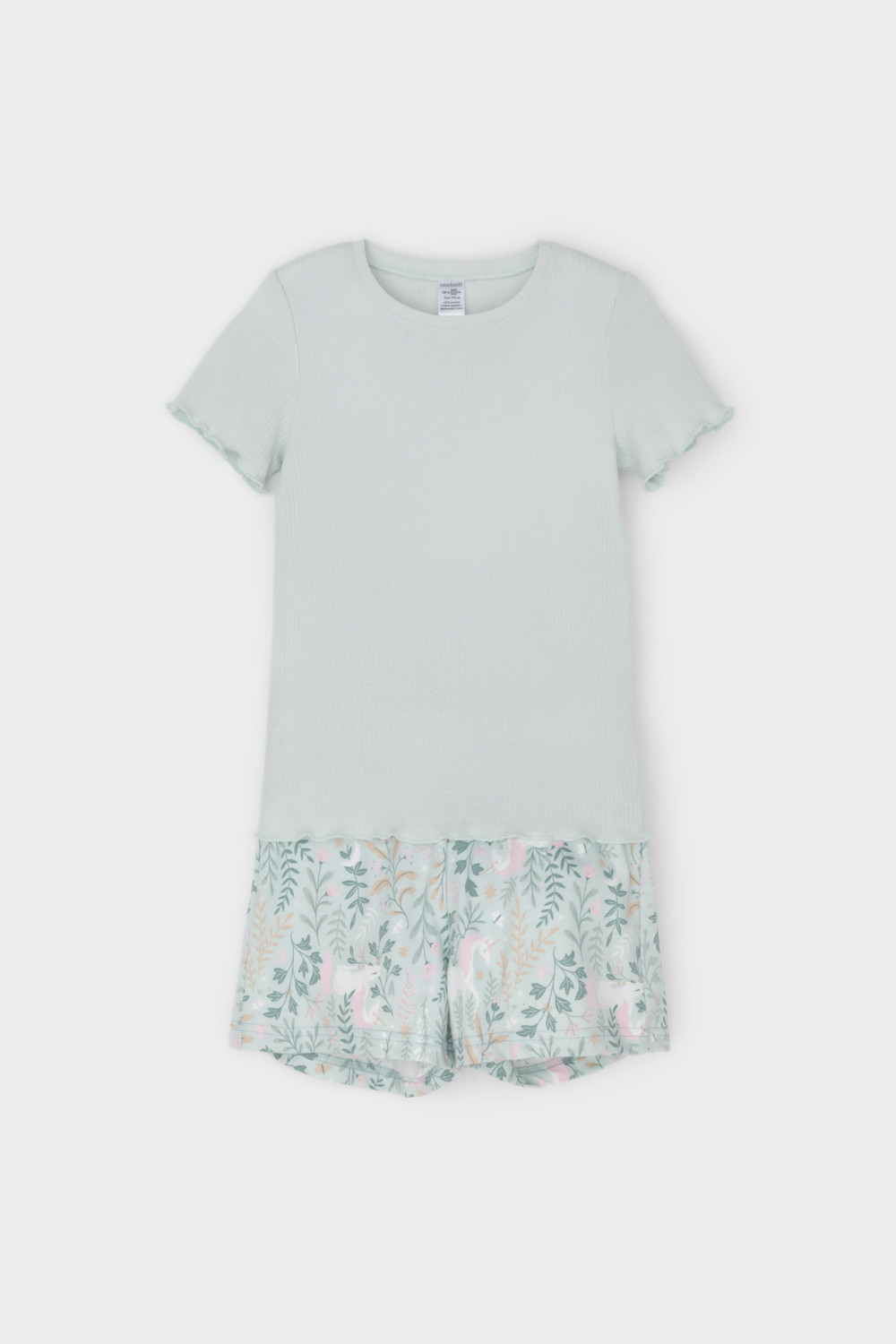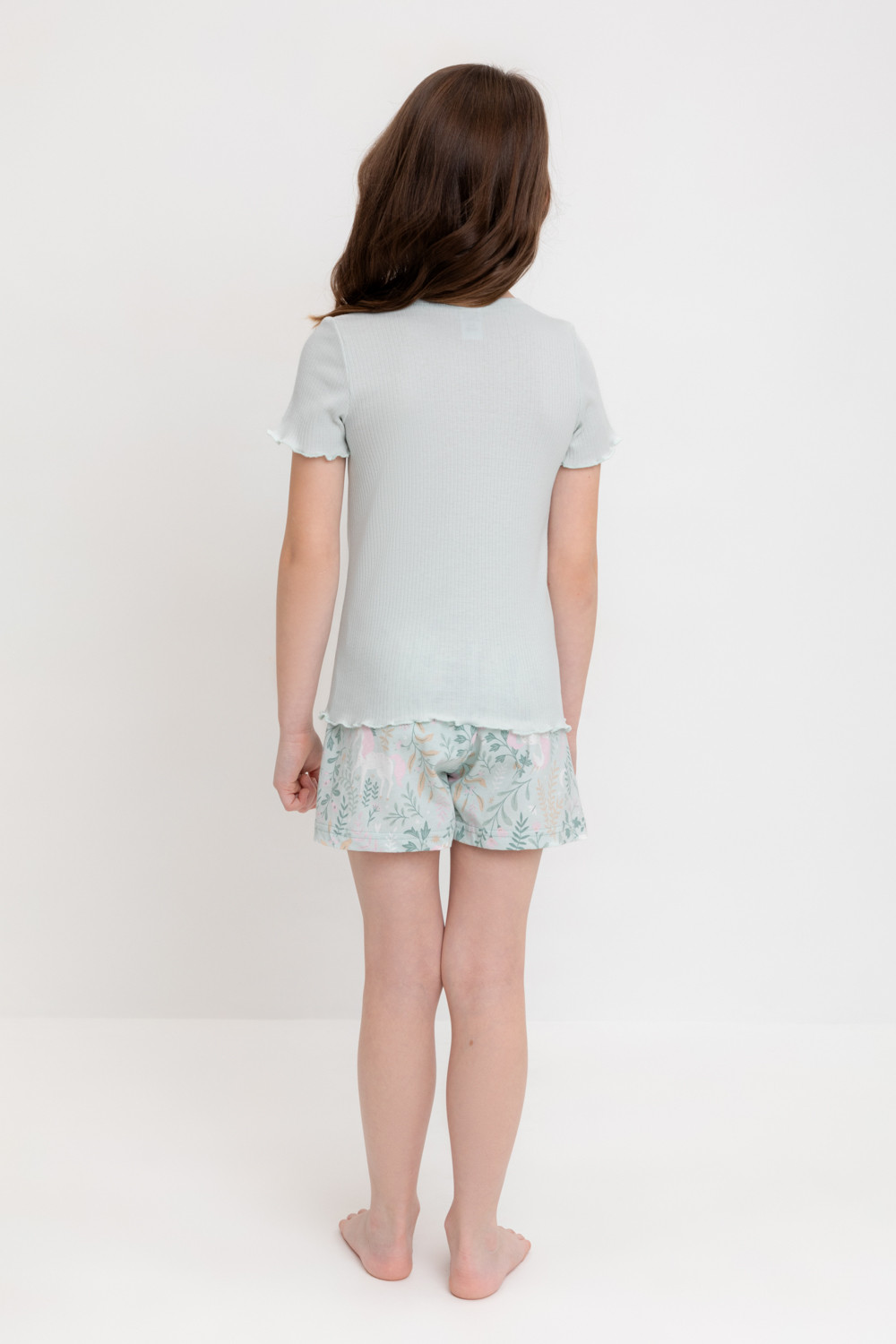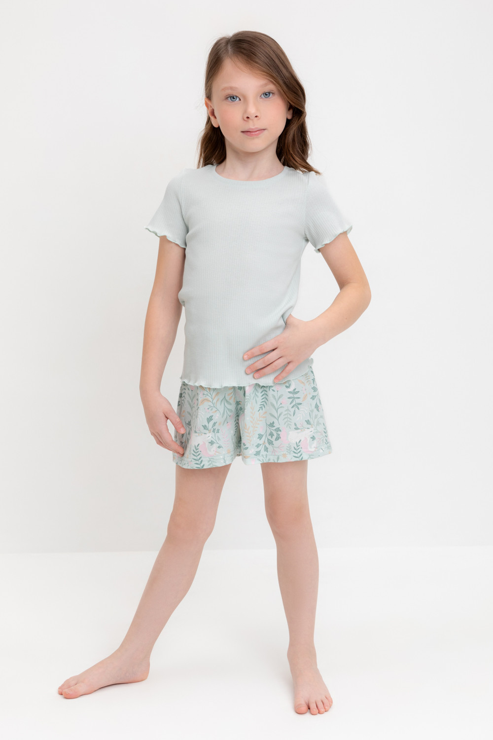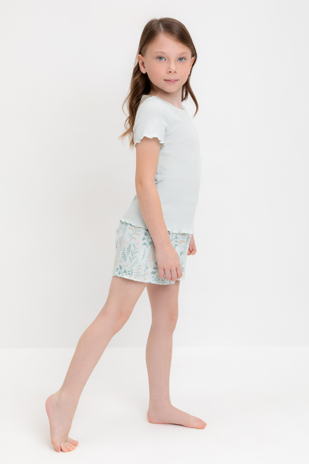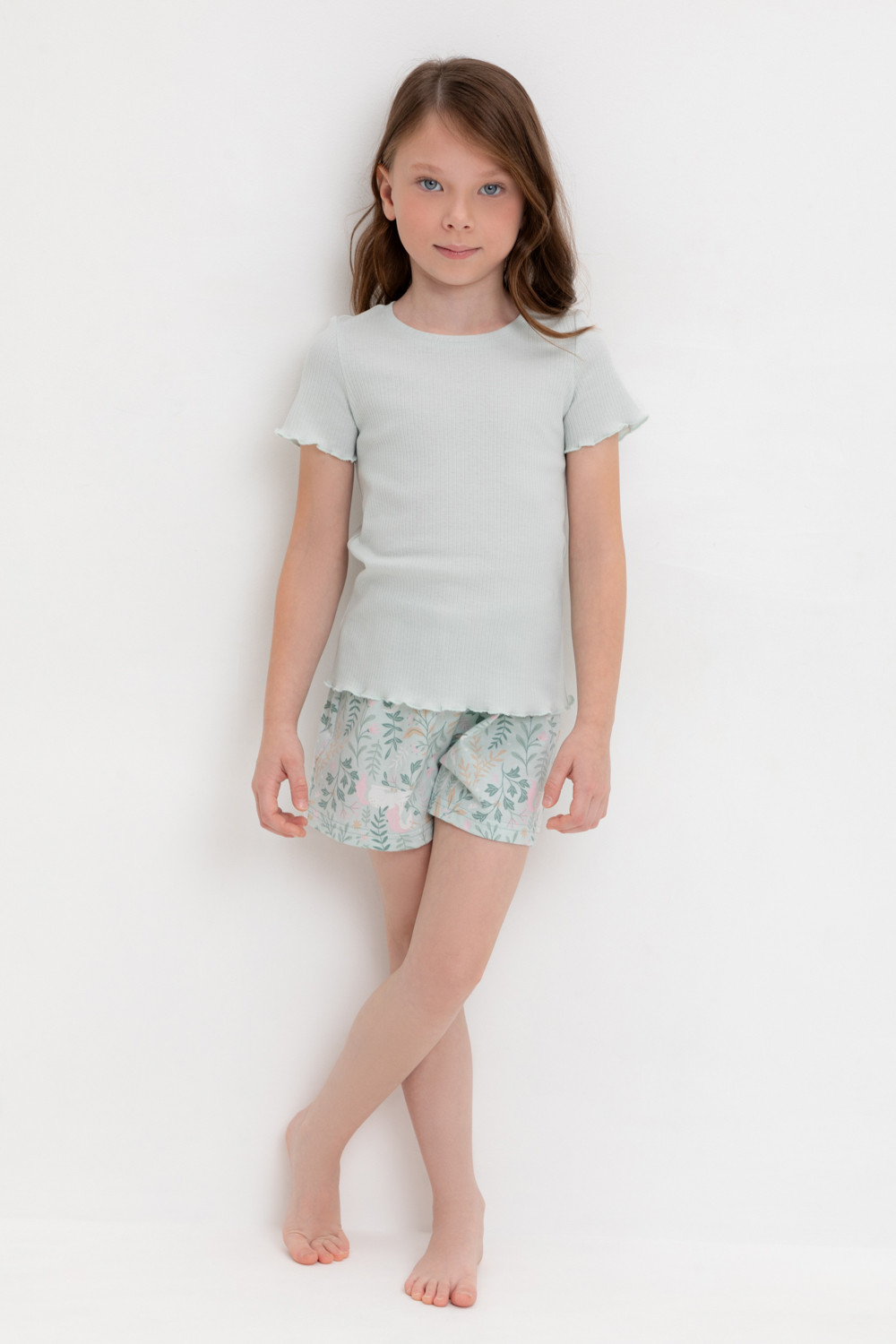 Трикотажная пижама из натурального хлопка. Футболка с короткими втачными рукавами изготовлена из эластичного трикотажа в рубчик. Шорты с эластичной резинкой в поясе выполнены из гладкого трикотажа супрем. Оригинальная набивка выполнена из стойких текстильных гипоаллергенных красителей. Изделие сохраняет цвет и форму после многократных стирок. Все трикотажные полотна производятся в соответсвии с нормами швейцарского сертификата ЭкоТекс.