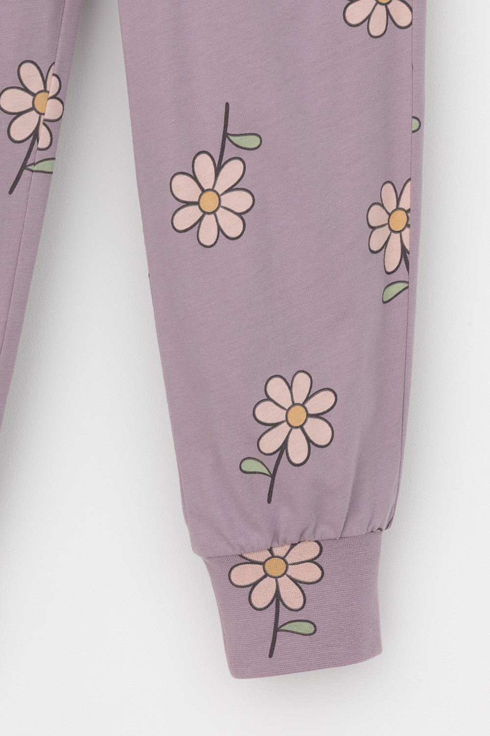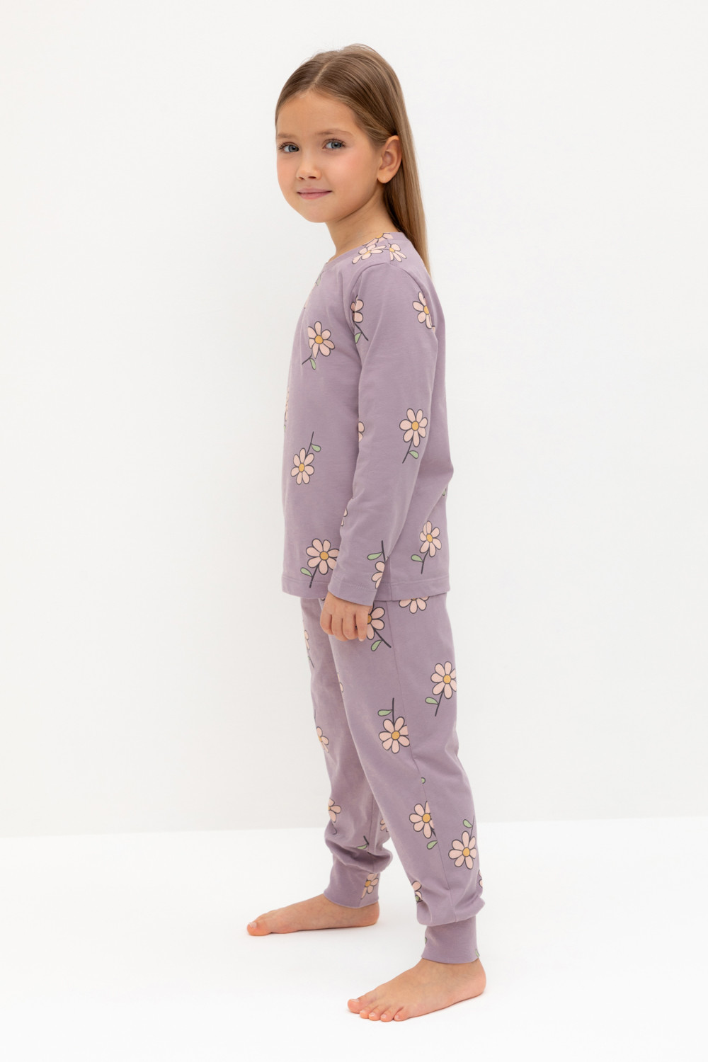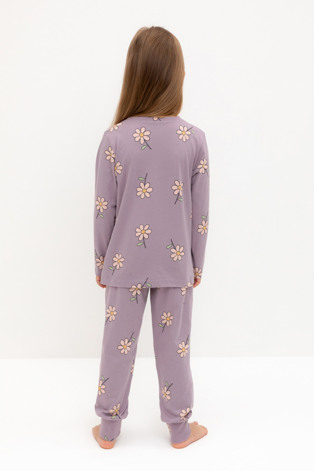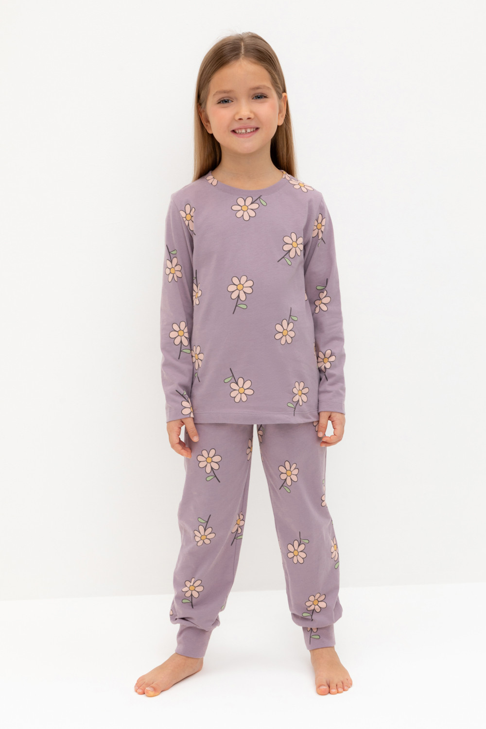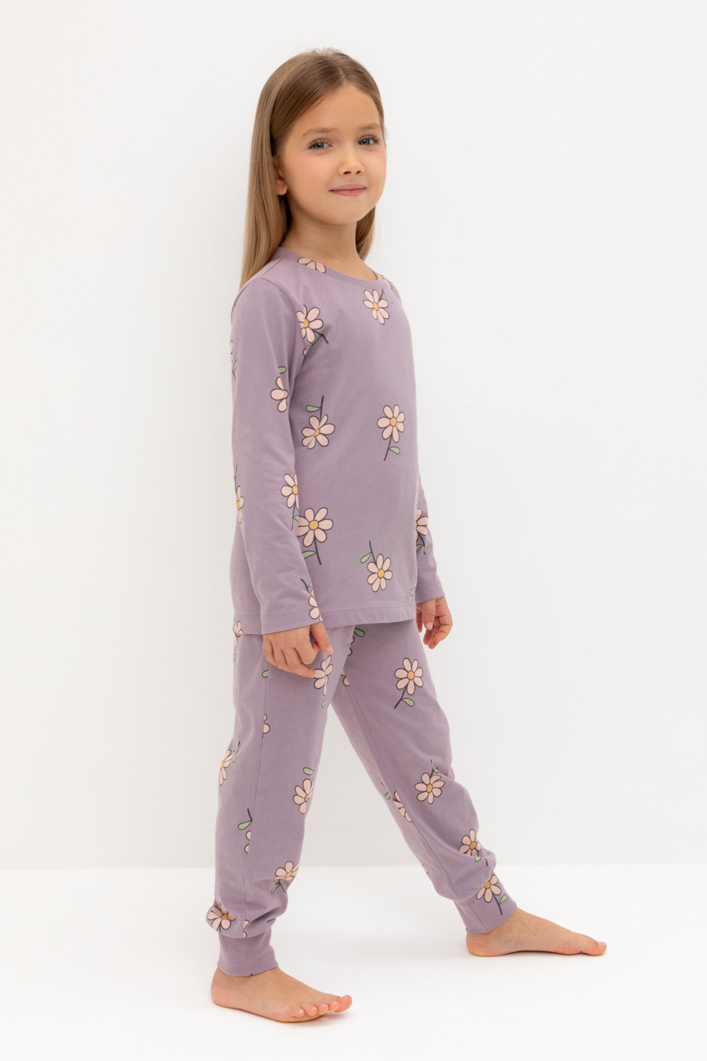 Пижама для девочки из натурального хлопка. Джемпер с длинными втачными рукавами и брюки с эластичной резинкой в поясе. Мягкие манжеты по низу брюк сделаны из материала в рубчик. Оригинальная набивка выполнена из стойких текстильных гипоаллергенных красителей. Изделие сохраняет цвет и форму после многократных стирок. Все трикотажные полотна производятся в соответствии с нормами швейцарского сертификата ЭкоТекс.