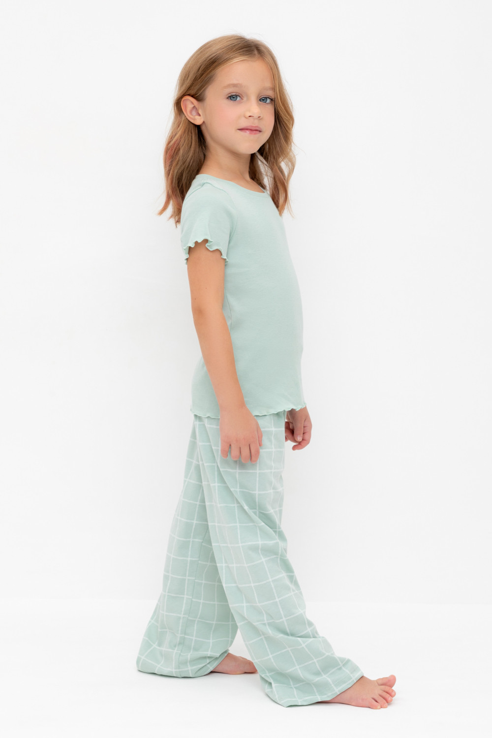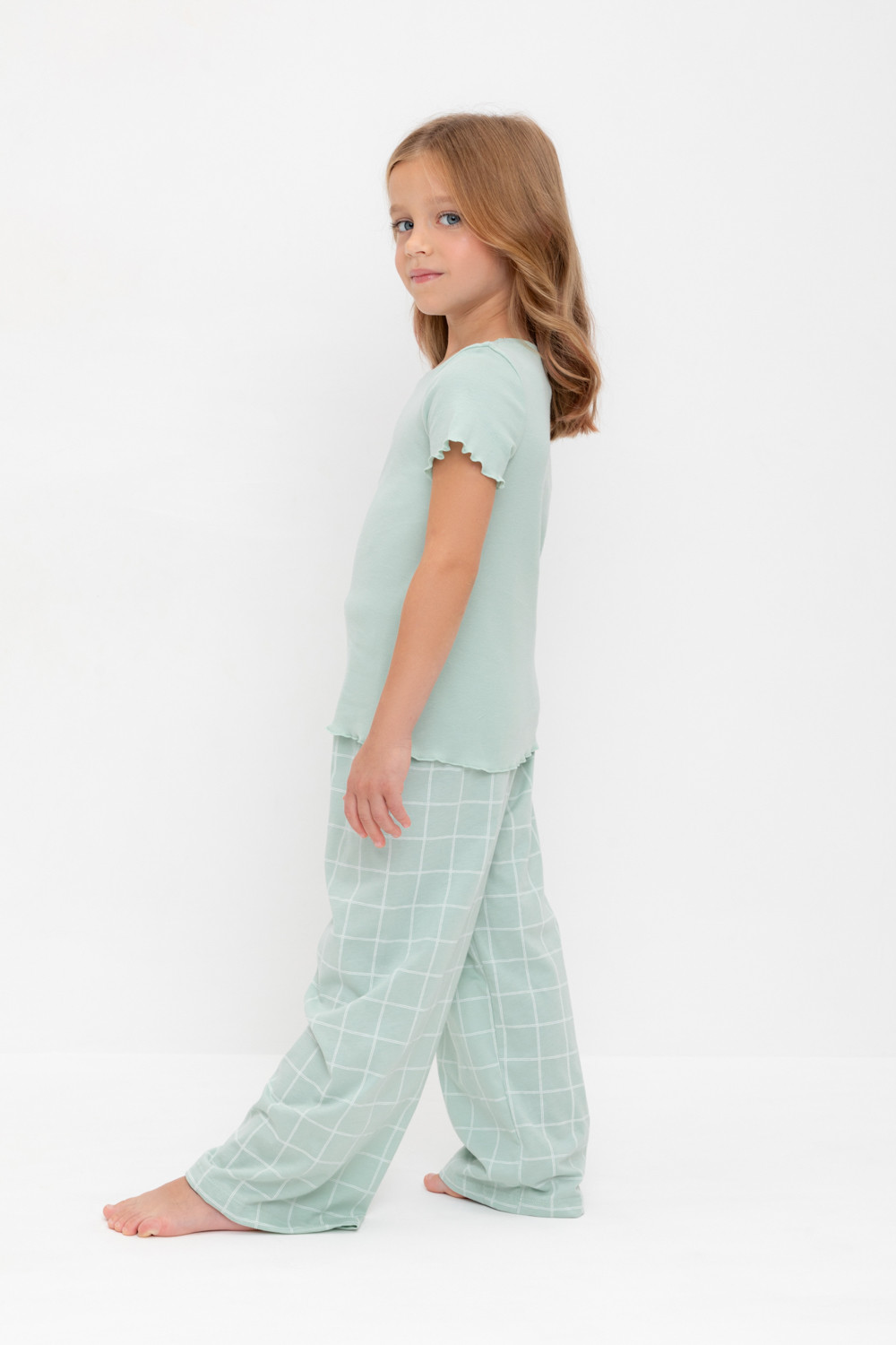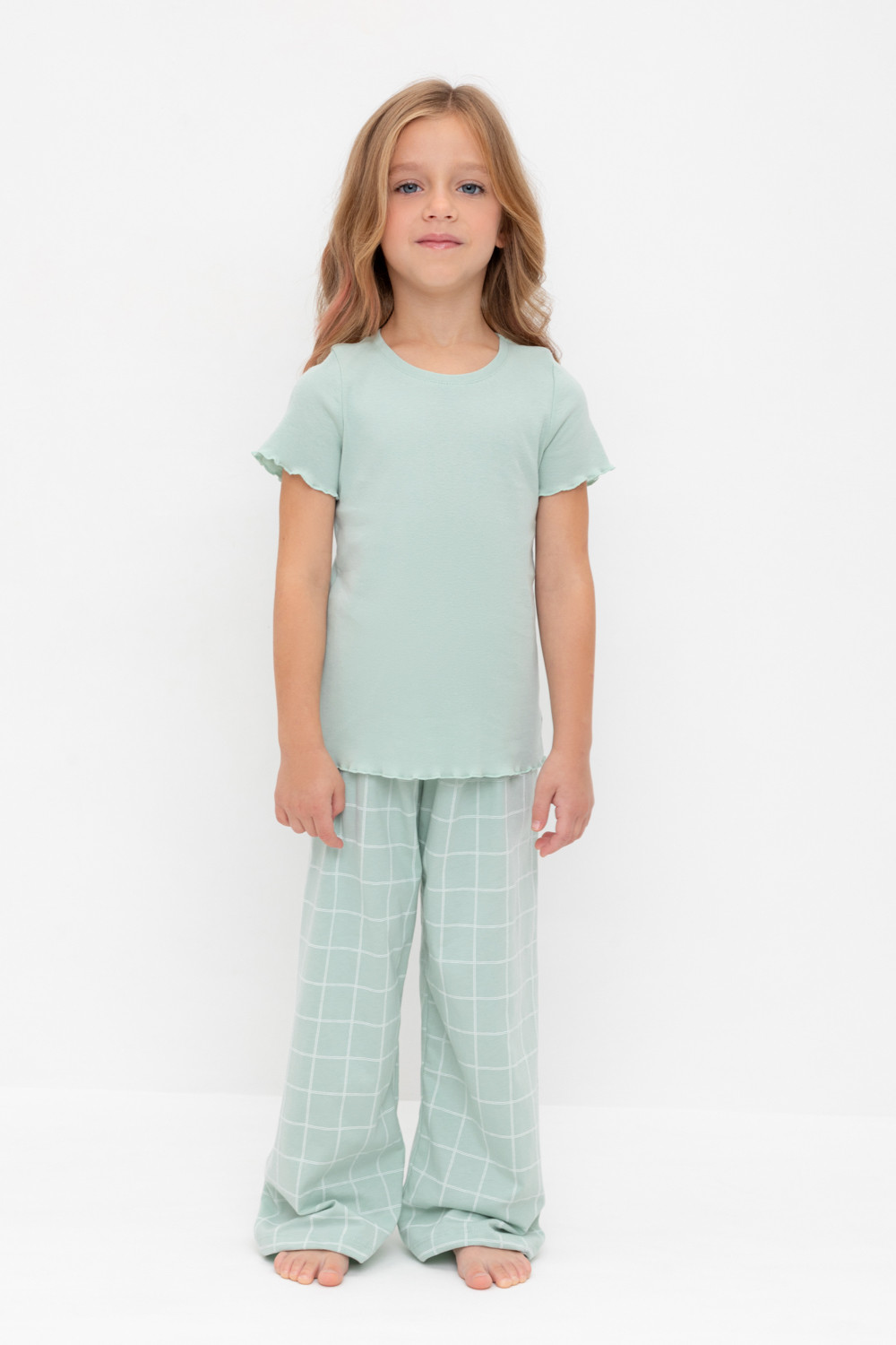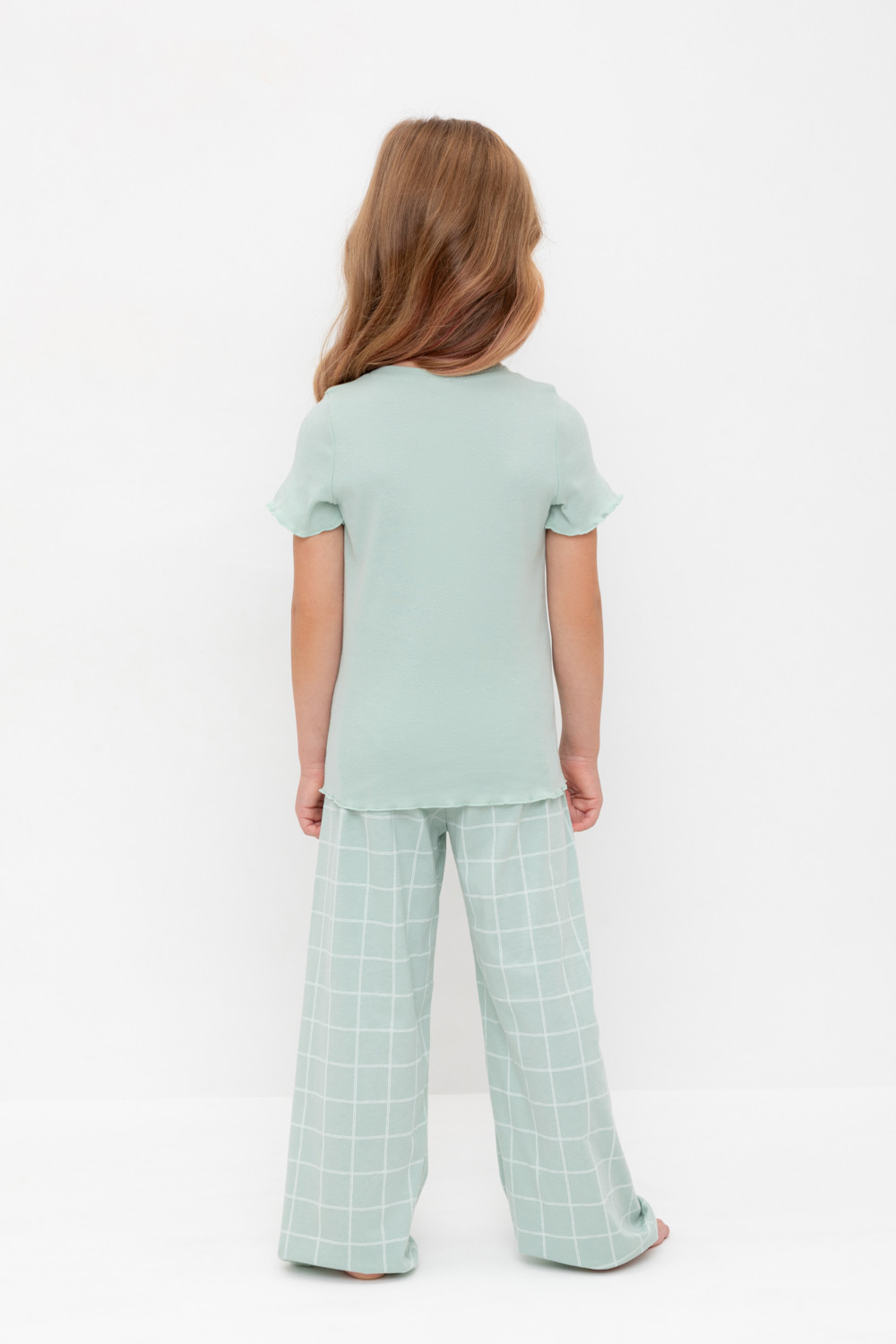 Трикотажная пижама из натурального хлопка. Футболка с короткими втачными рукавами. У футболки рукава и низ изделия обработаны микрооверлоком У брюк в комплекте мягкий, эластичный пояс на резинке. Оригинальная набивка выполнена из стойких, гипоаллергенных текстильных красителей. Комплект сохраняет цвет и форму после многократных стирок. Все трикотажные полотна производятся в соответсвии с нормами Швейцарского сертификата ЭкоТекс.